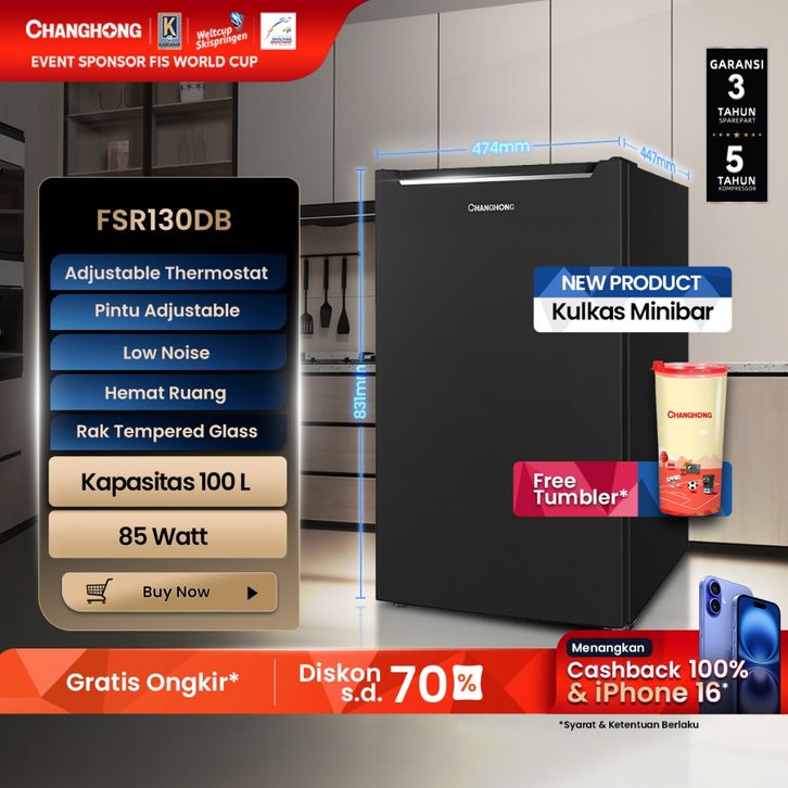New Changhong Kulkas 1 pintu (Refrigerator) Lemari Es Kapasitas 100 Liter – Black FSR130DB (Semi Auto-Defrost )