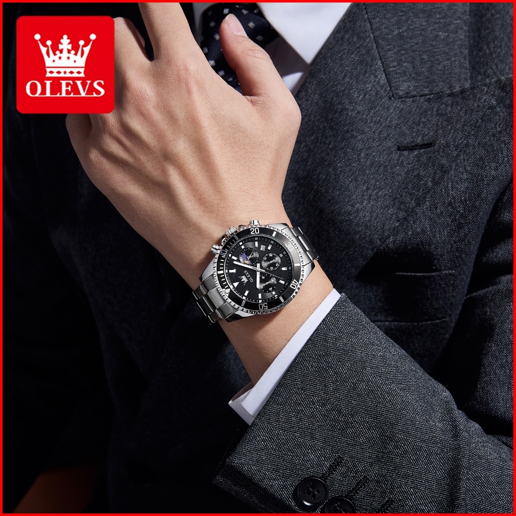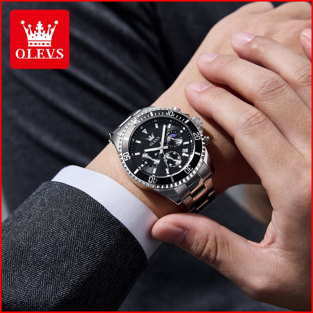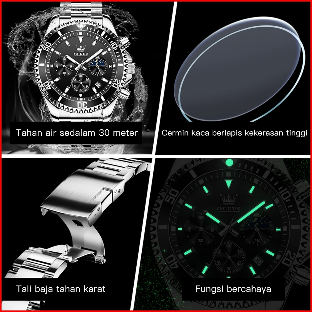 Olevs Jam Tangan Pria Anti Air Original Tahan Keren Luxury Led Analog Stainless Steel Chronograph Watch Men Hitam Model