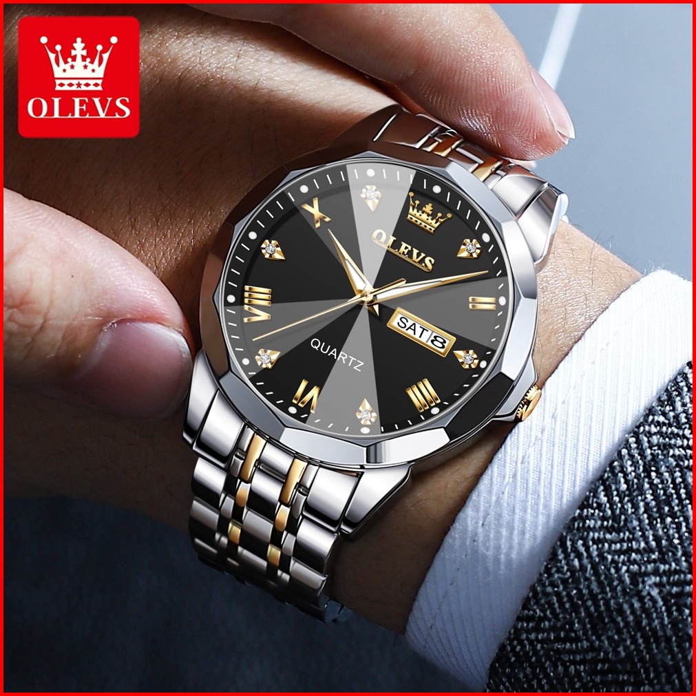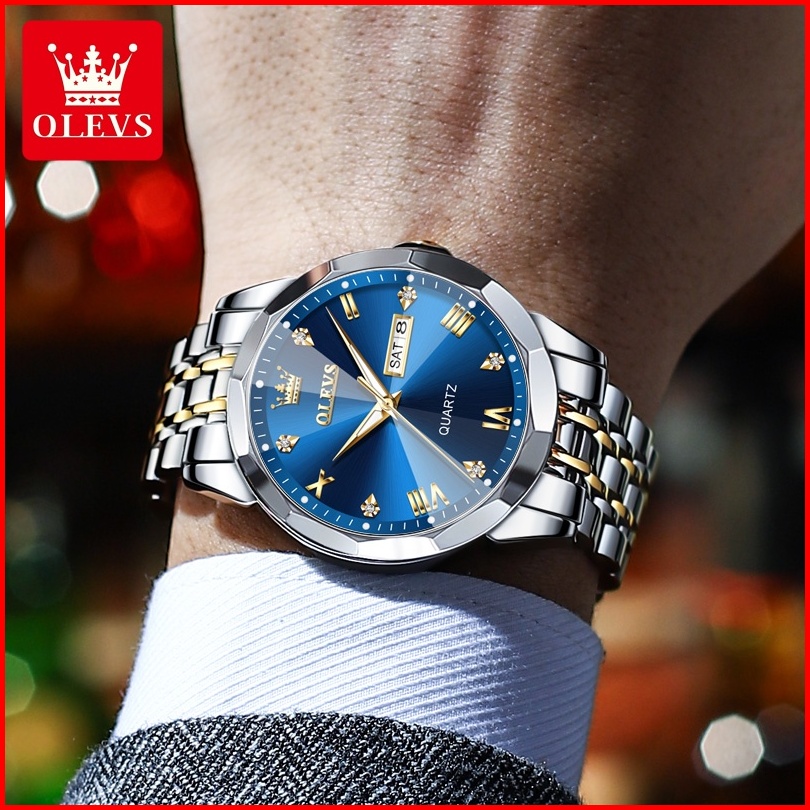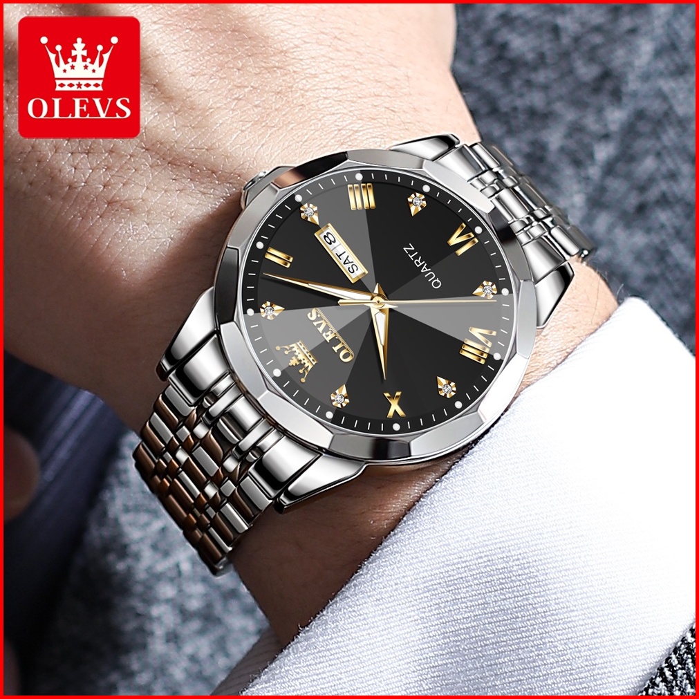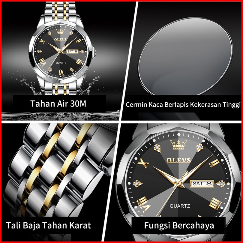Olevs Jam Tangan Pria Anti Air Original Cowok Quartz Luminous Kalender Fashion Tali Stainless Steel Analog Men Watch