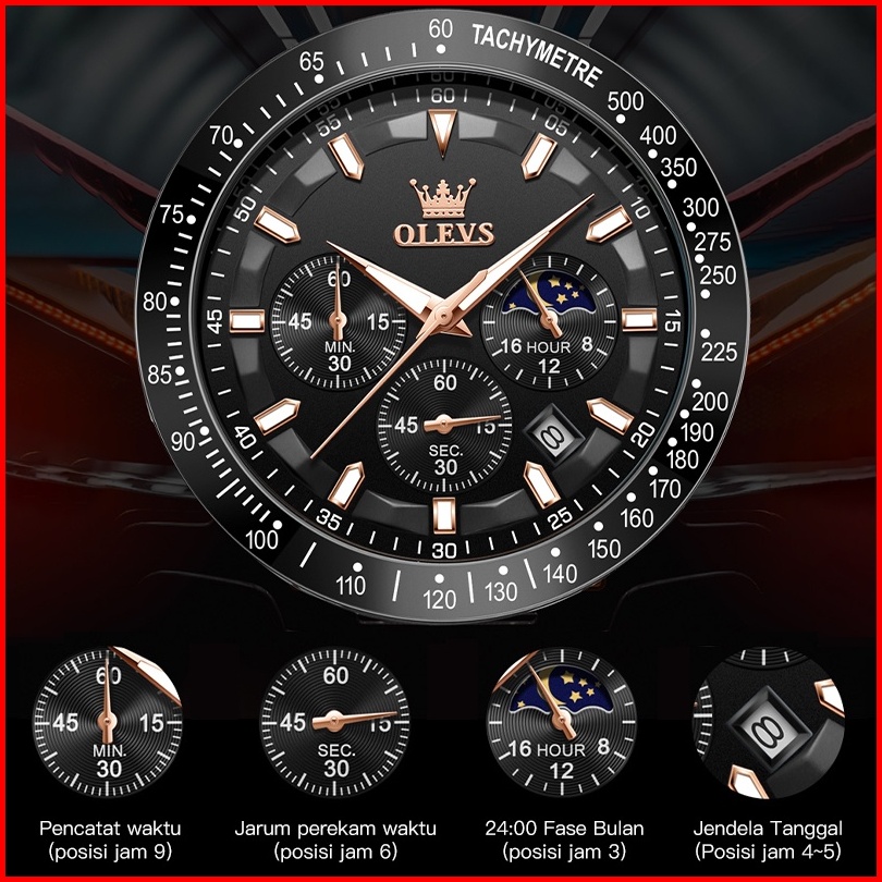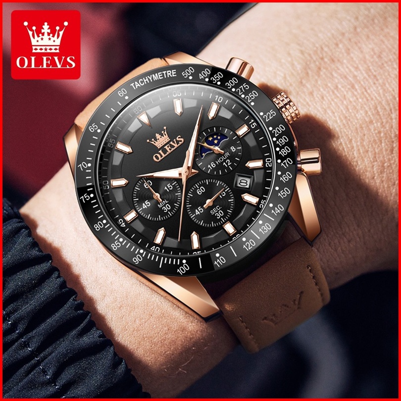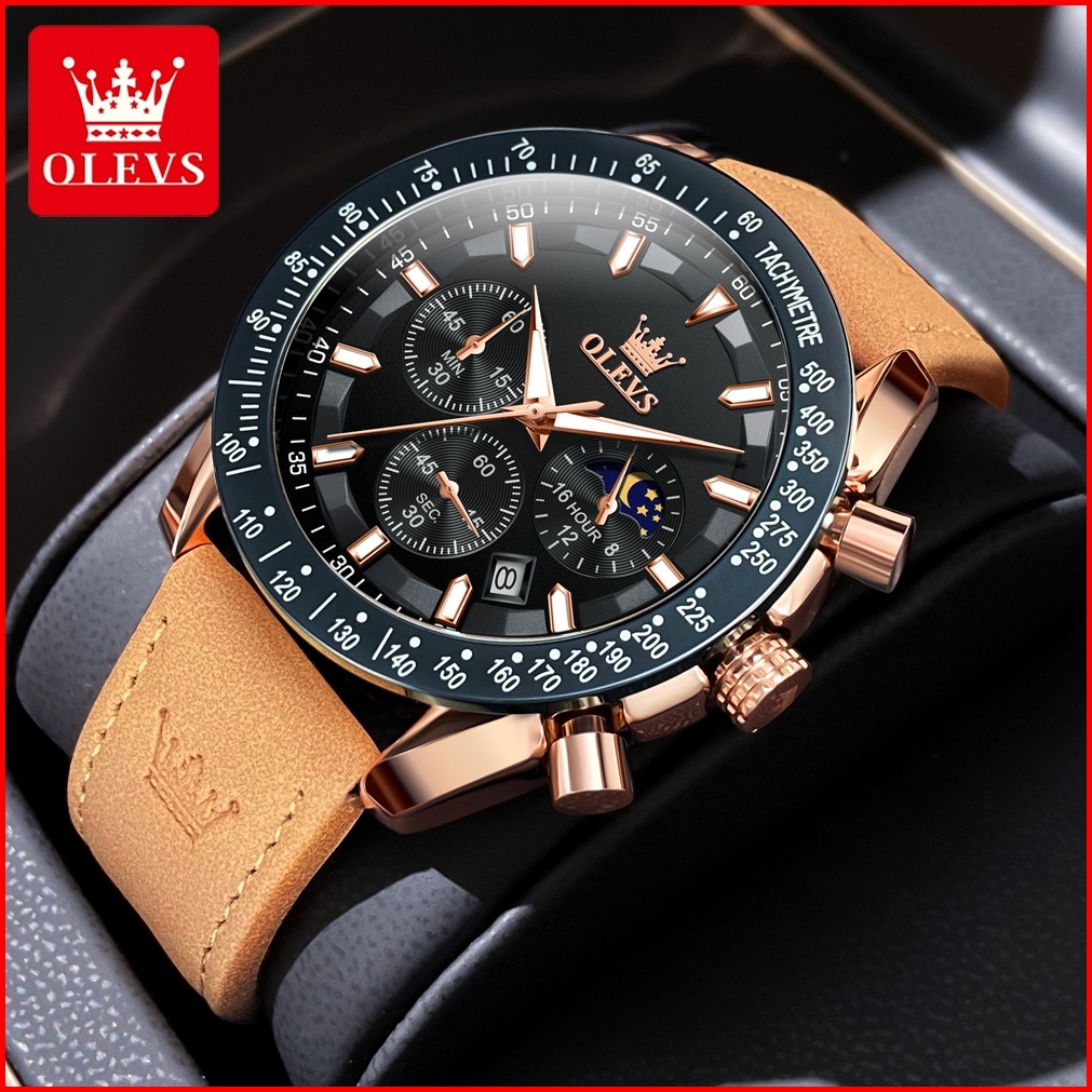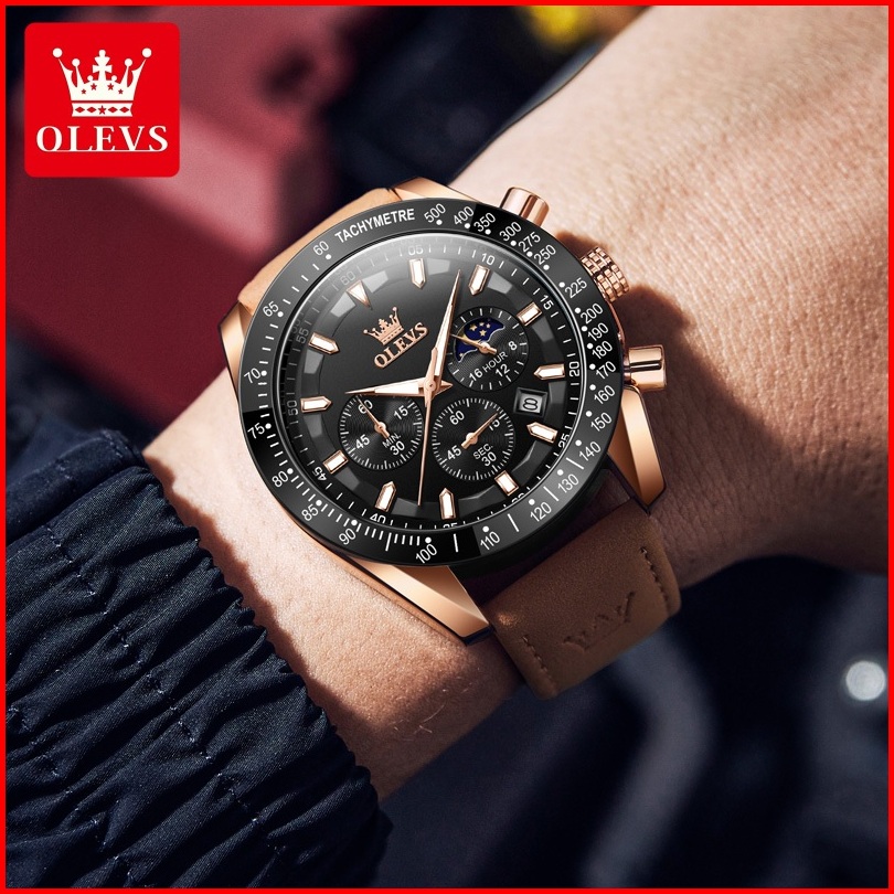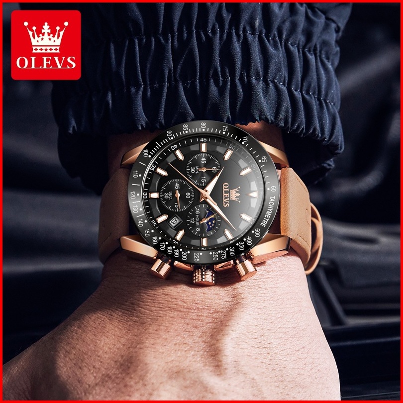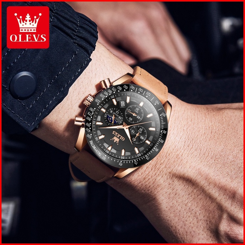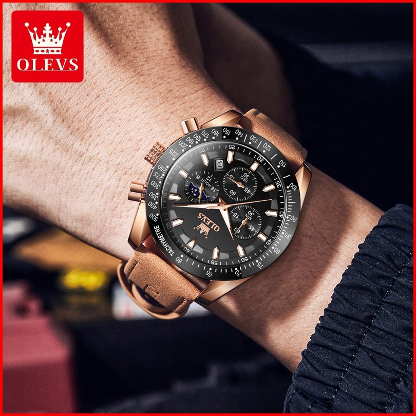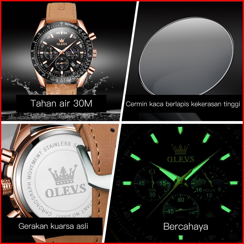 Olevs Jam Tangan Pria Original 100 Anti Air Kuarsa Kulit Bercahaya Luxury Chronograph Watch Men Model 9957
