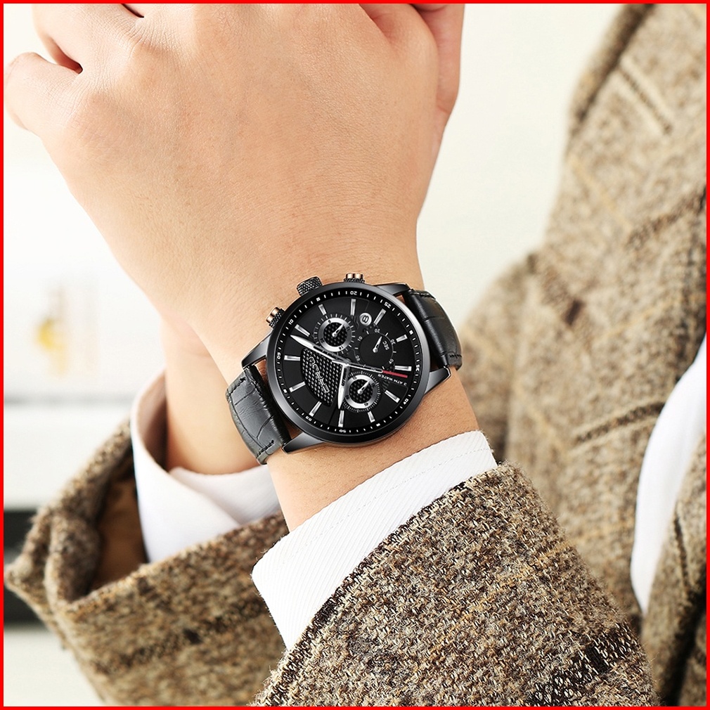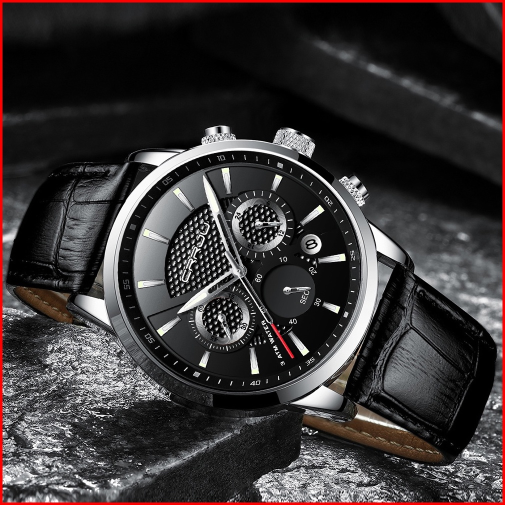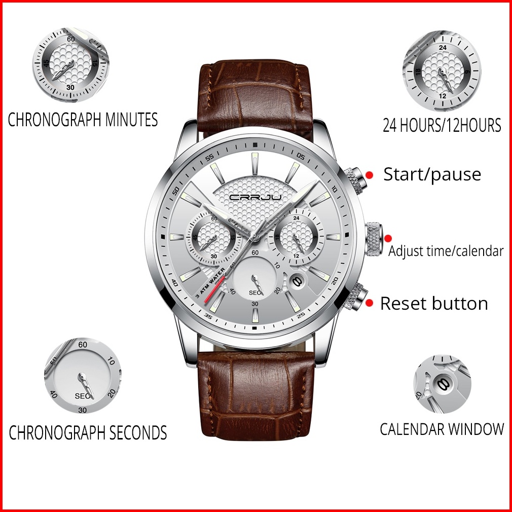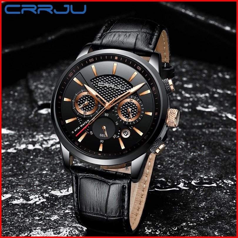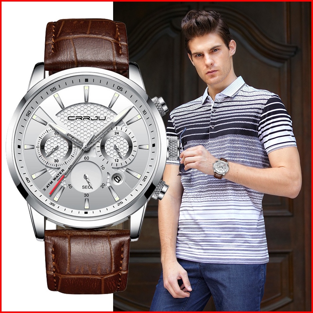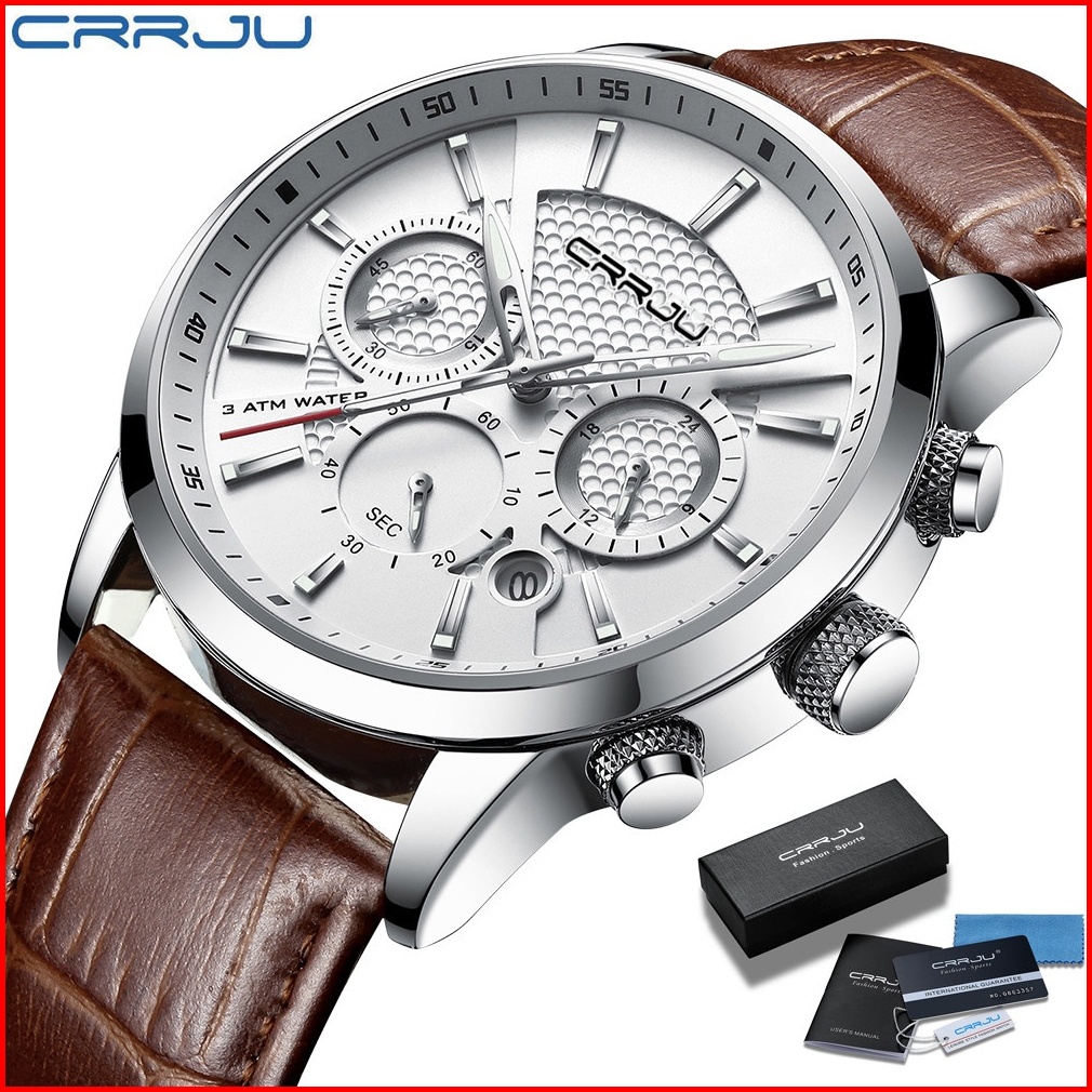 Crrju Original Jam Tangan Pria 2024 Tali Kulit Anti Air Olahraga Kronograf Jam Tangan Cowok