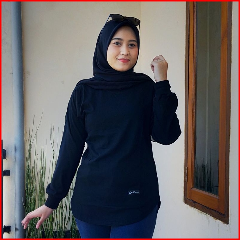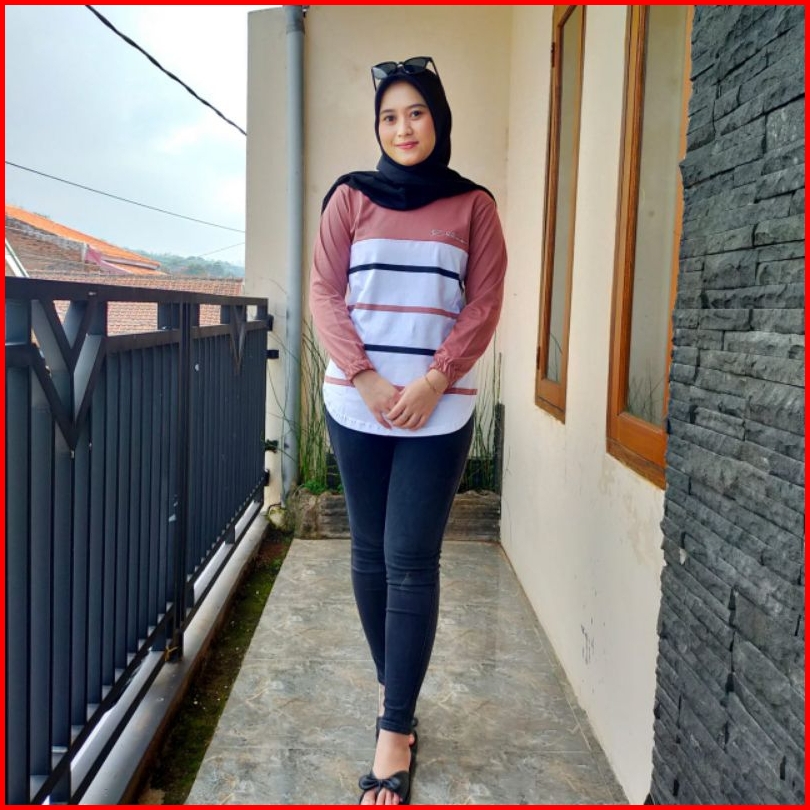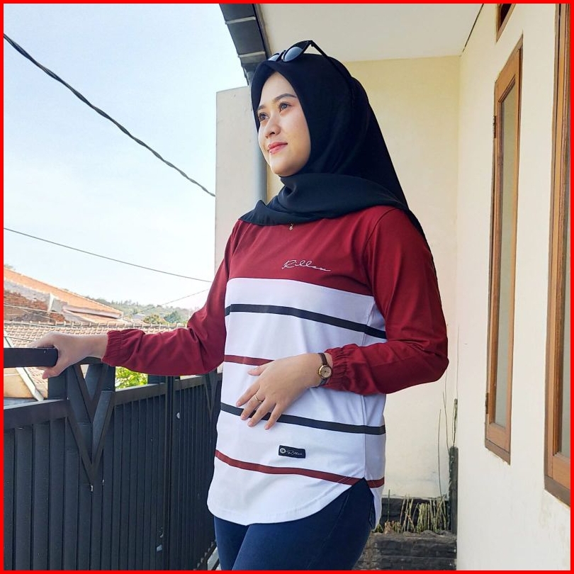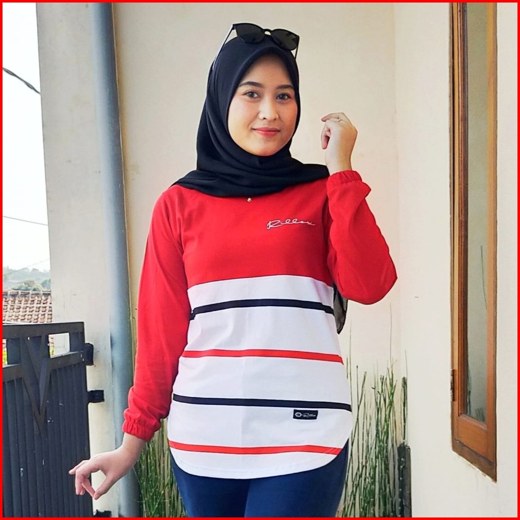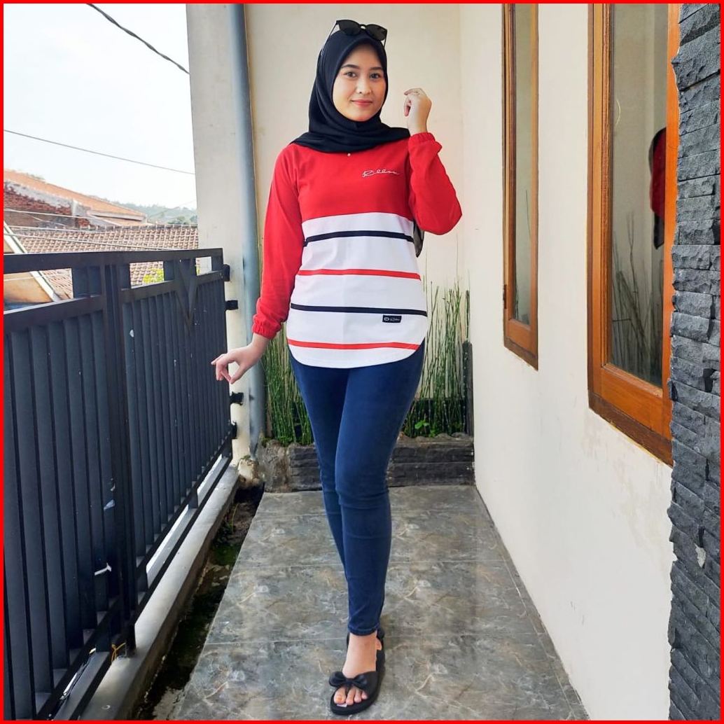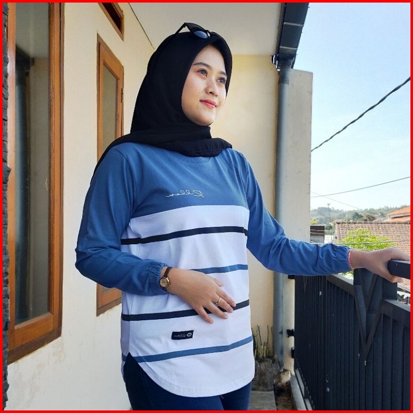 Kaos Lengan Panjang Wanita Oval Motif Kombinasi Garis Bahan Katun 20s