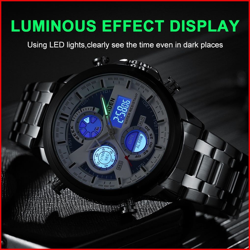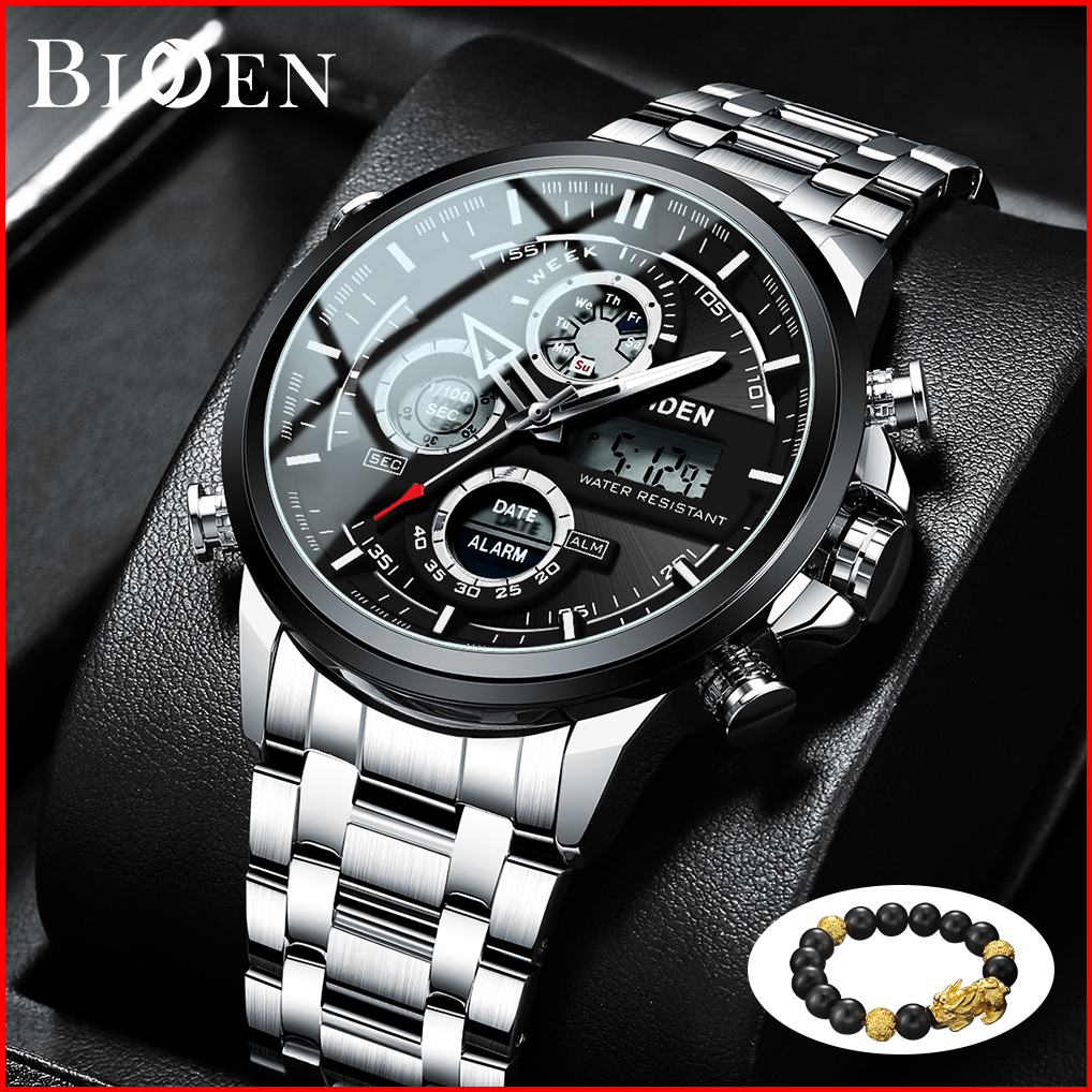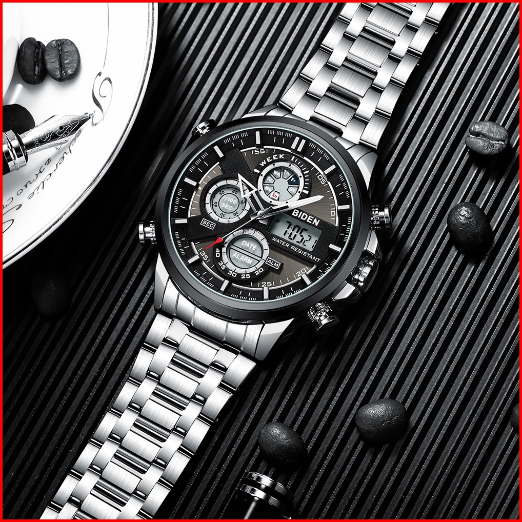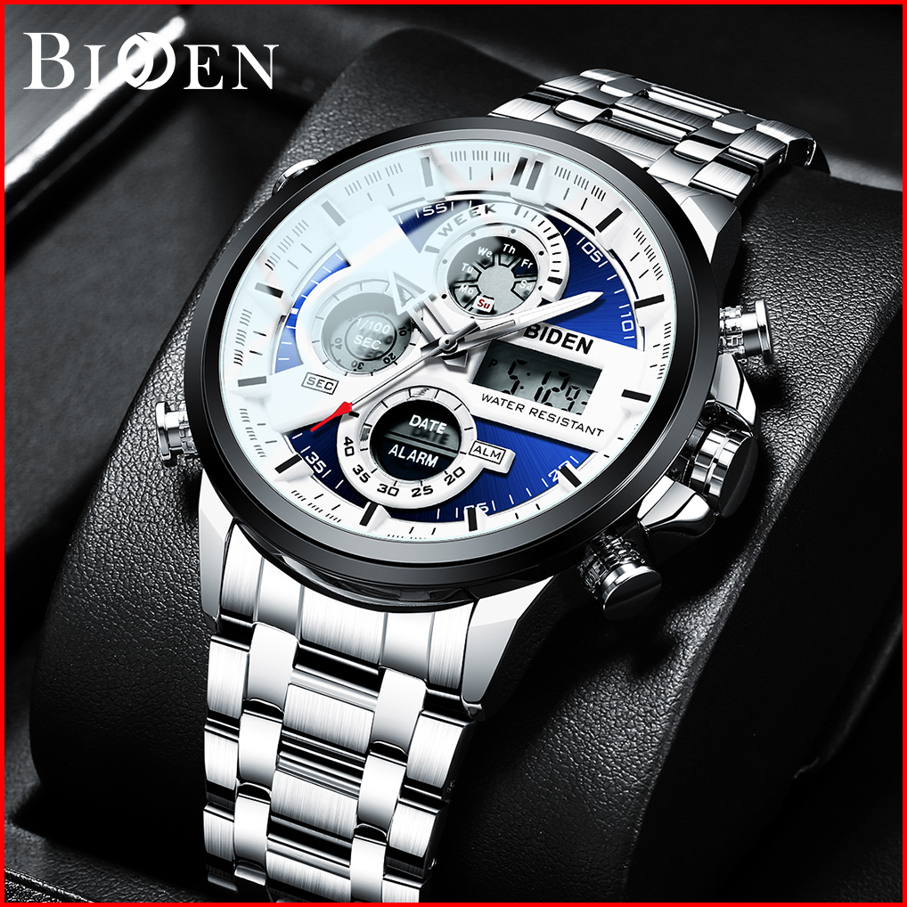 Biden Jam Tangan Pria Anti Air Olahraga Kuarsa Waktu Ganda Tali Stainless Steel Jam Tangan Cowok Original
