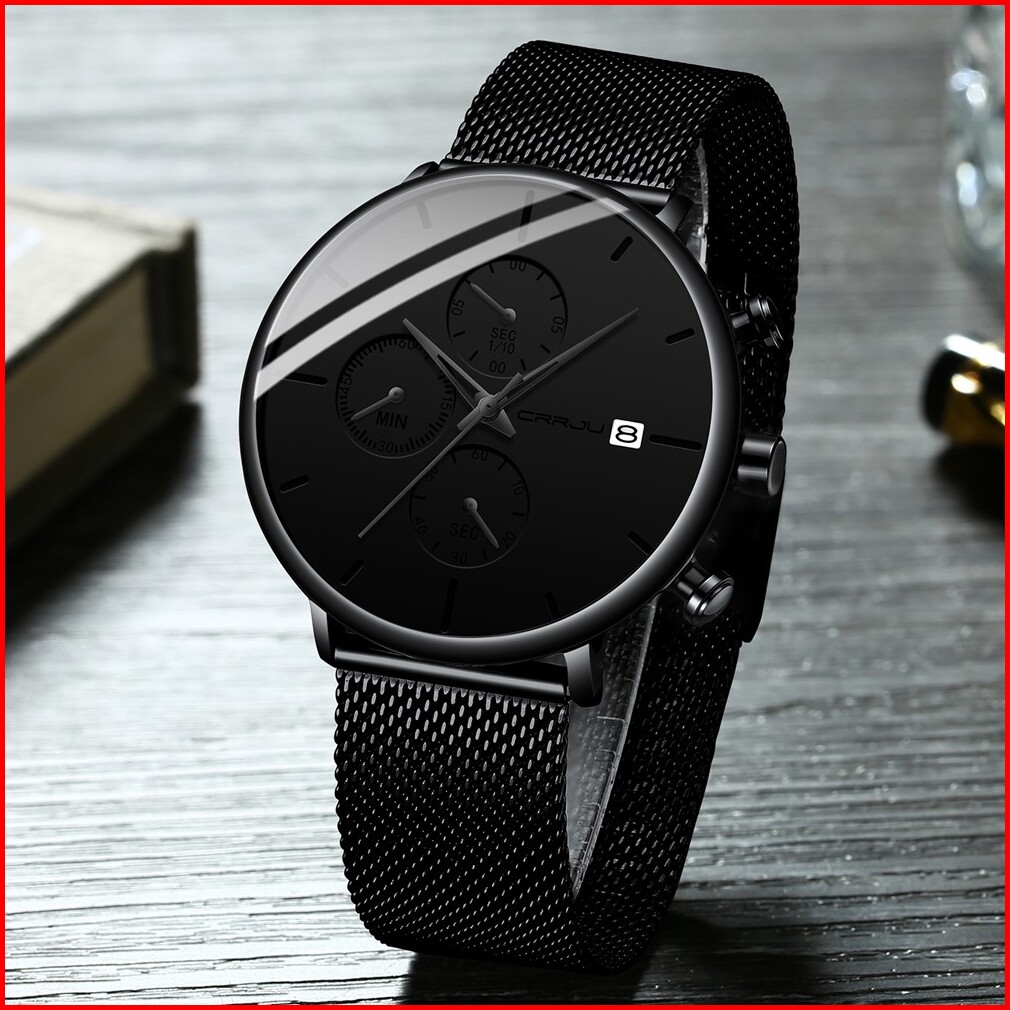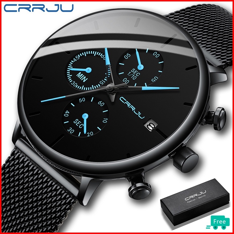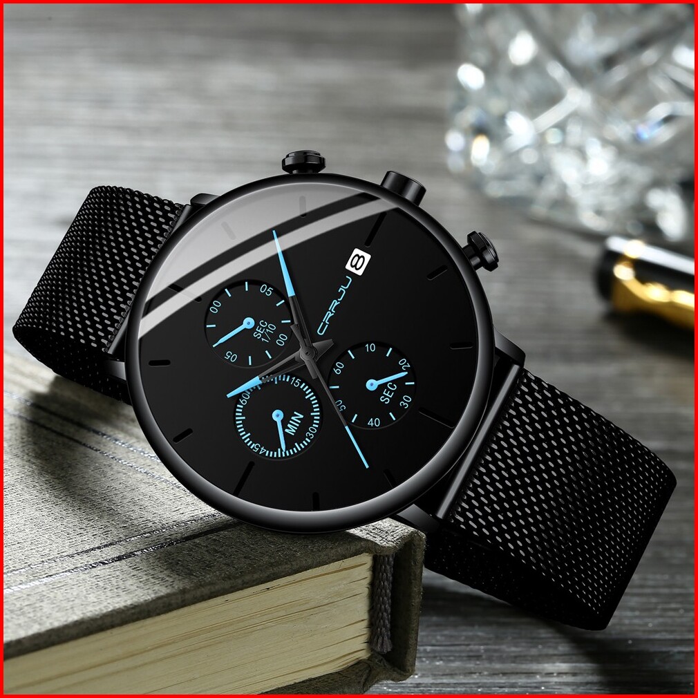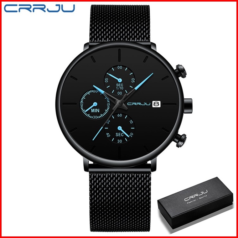 Jam Tangan Pria Crrju Original Mewah Quartz Analog Crononya Aktif Strap Mesh Stainless Steel Kuarsa Kalender Tahan Air A
