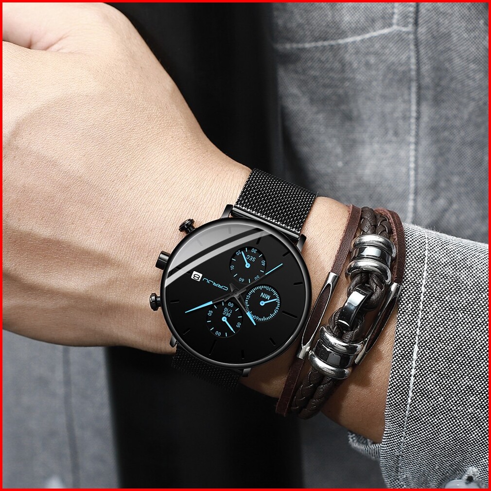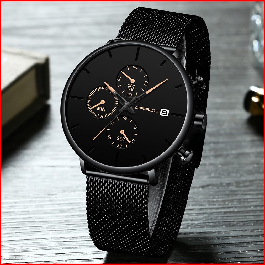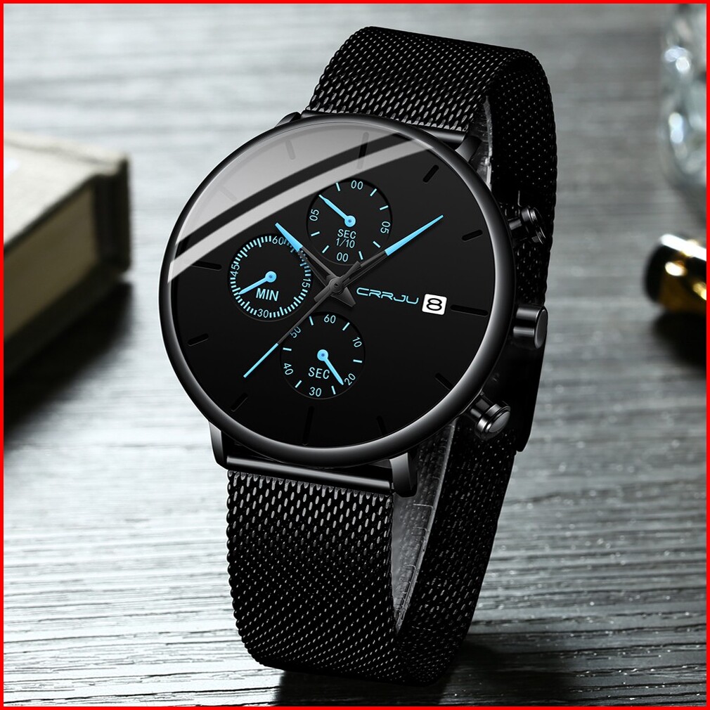 Jam Tangan Pria Crrju Original Mewah Quartz Analog Crononya Aktif Strap Mesh Stainless Steel Kuarsa Kalender Tahan Air A