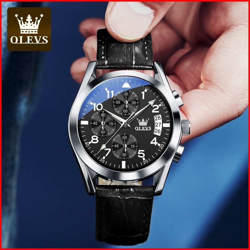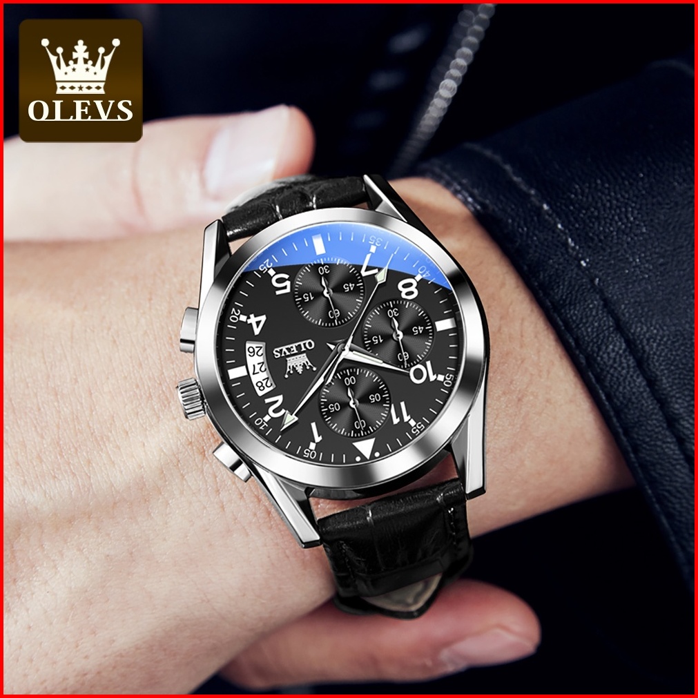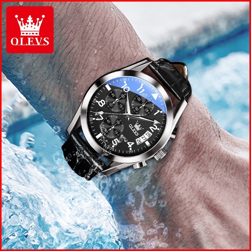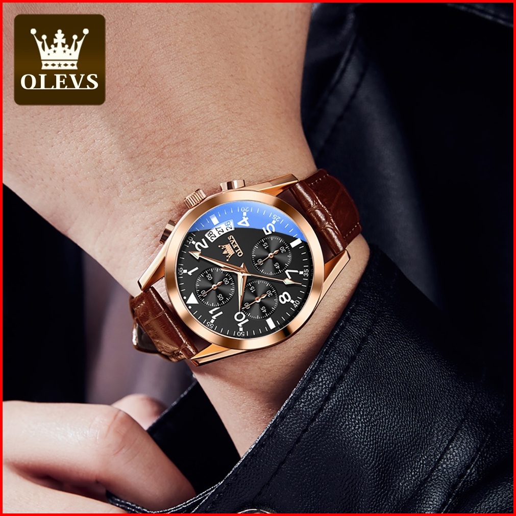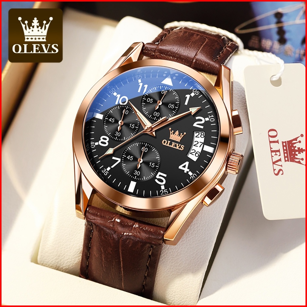 Olevs Jam Tangan Pria Original Anti Air Kulit Tahan Keren Luminous Hitam Coklat Luxury Chronograph Watch Men Multifungsi