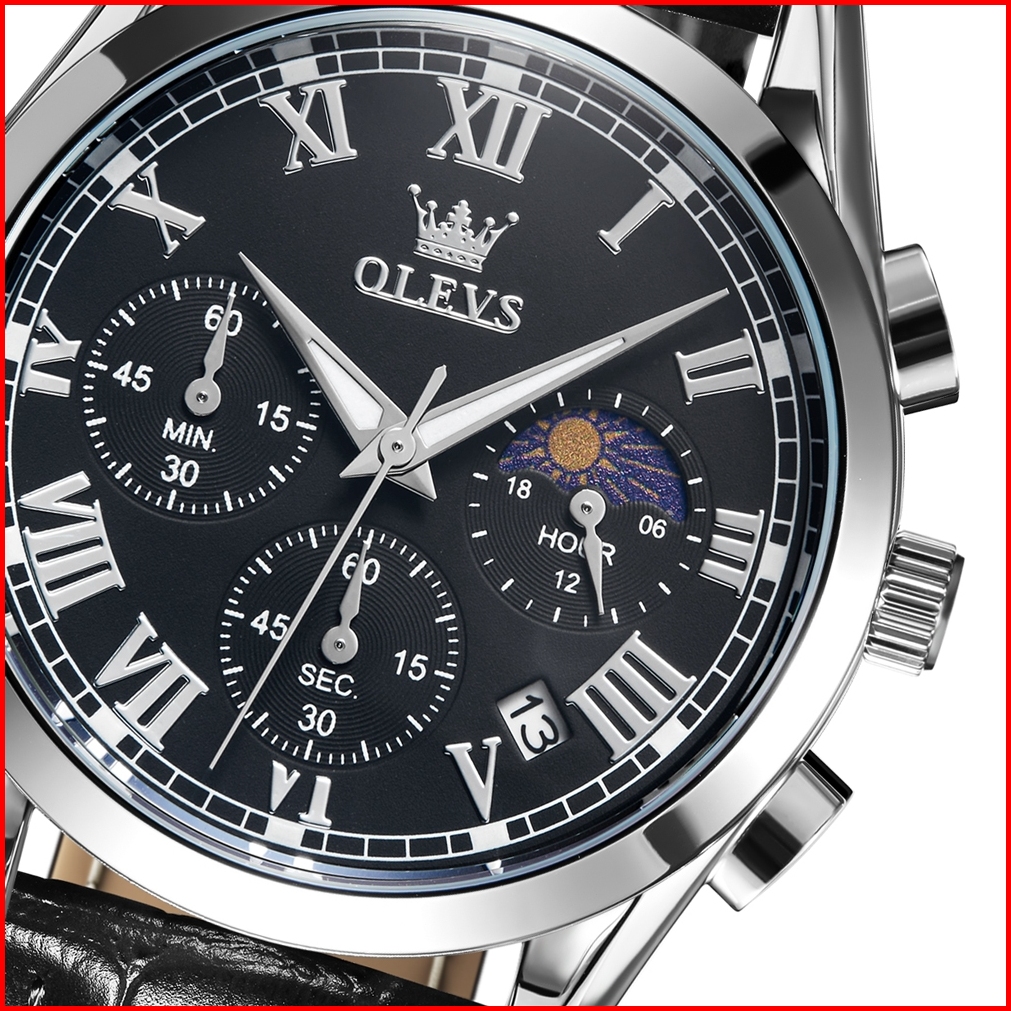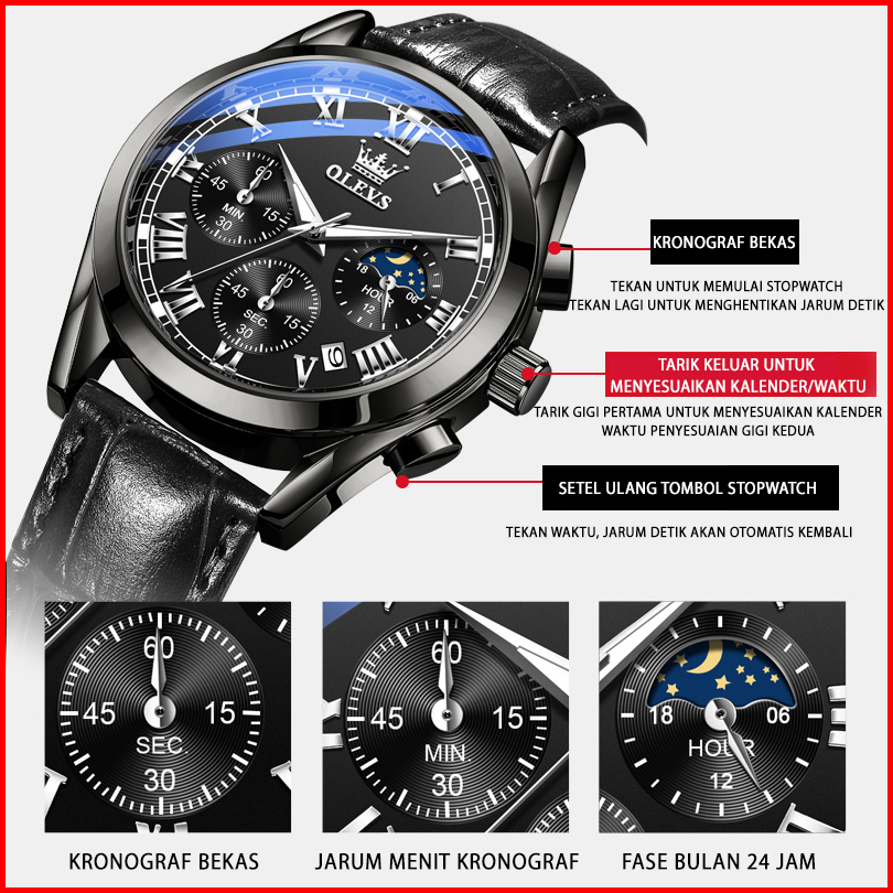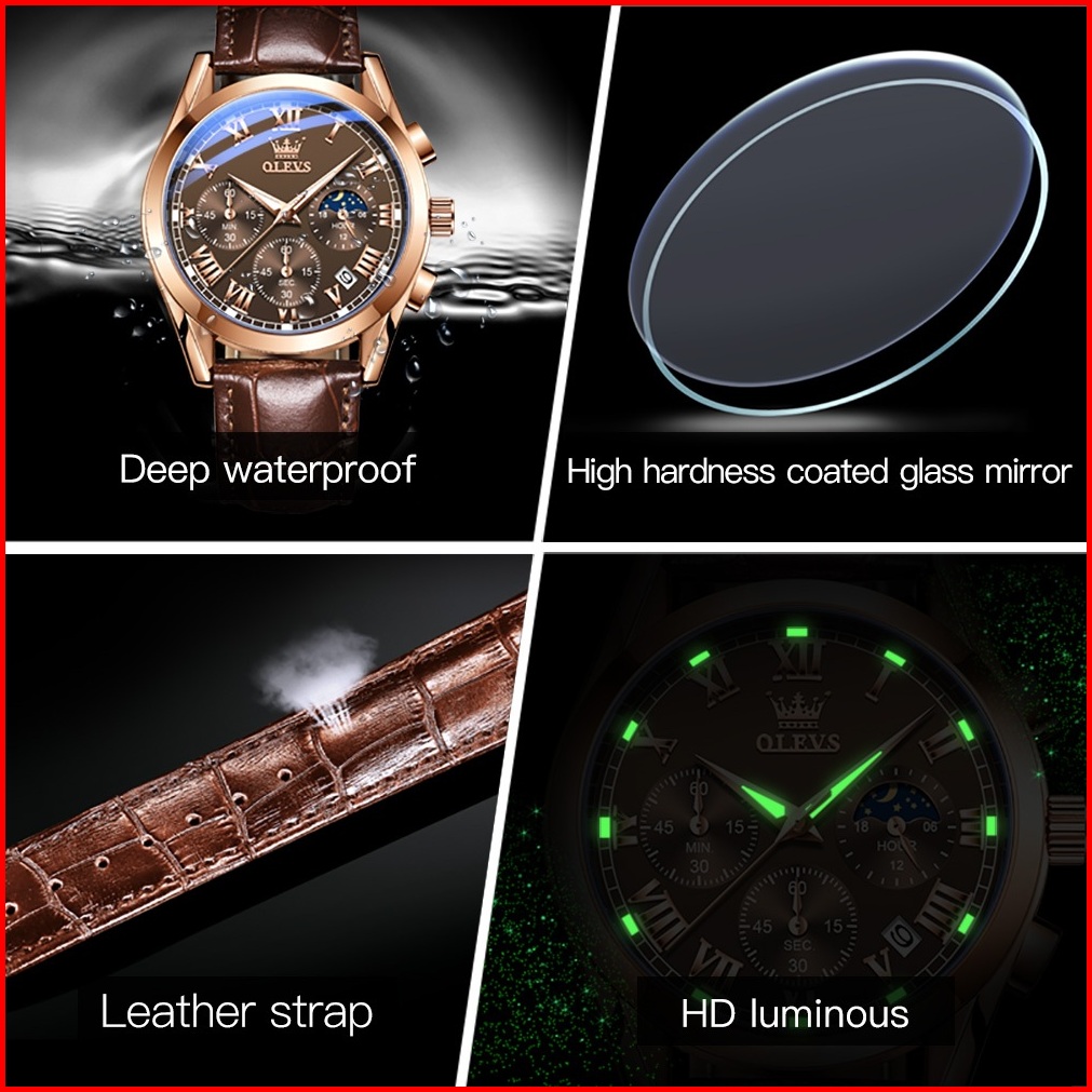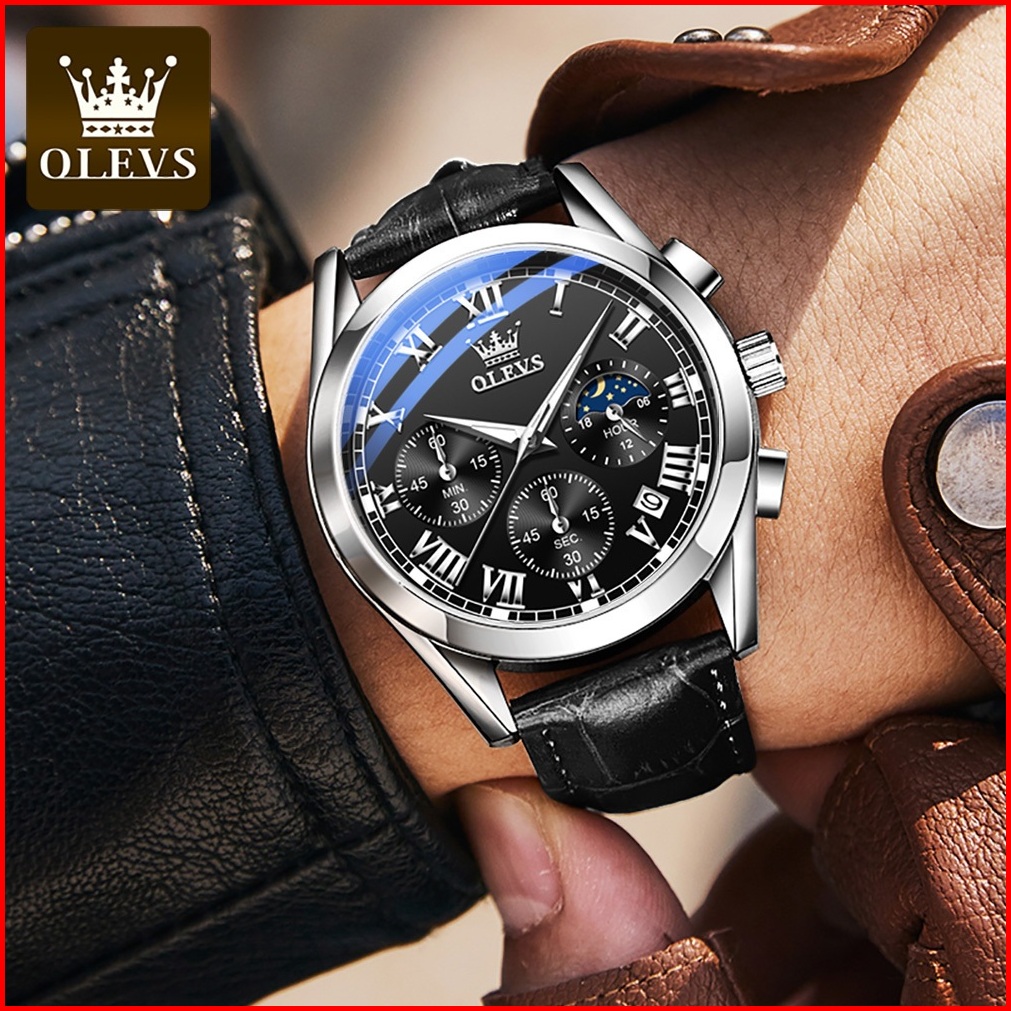 Olevs Jam Tangan Pria Anti Air Original Cowok Kulit Hitam Coklat Luxury Chronograph Watch Men 2871