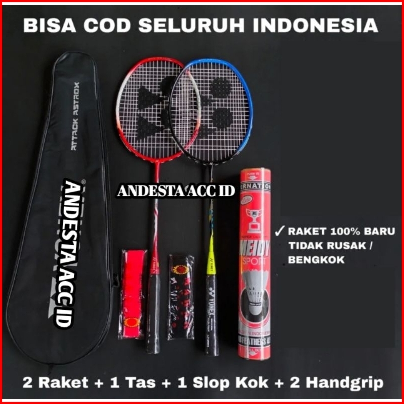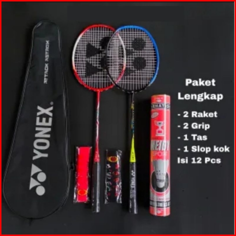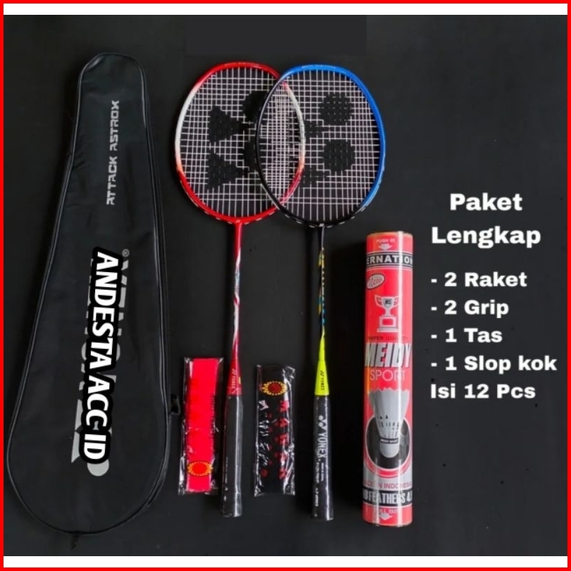 Raket Badminton Paket Lengkap Model Senyawa Tanpa Sambungan 2 Raket 1 Tas 12 Kok Free Grip