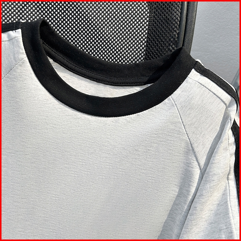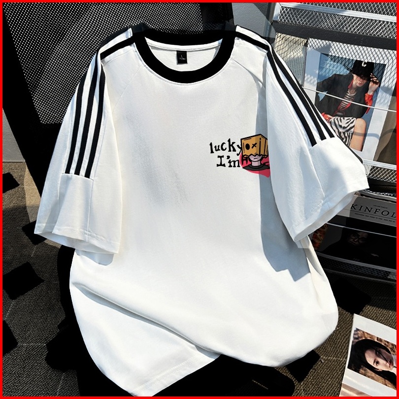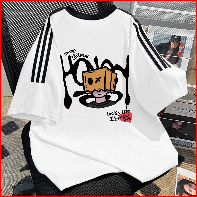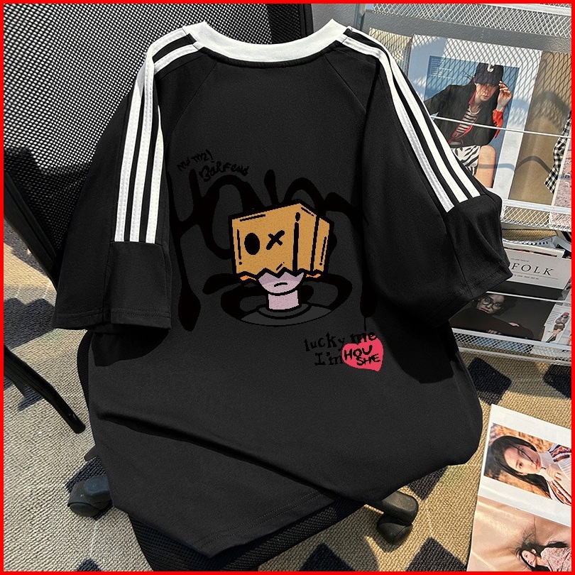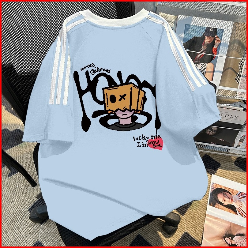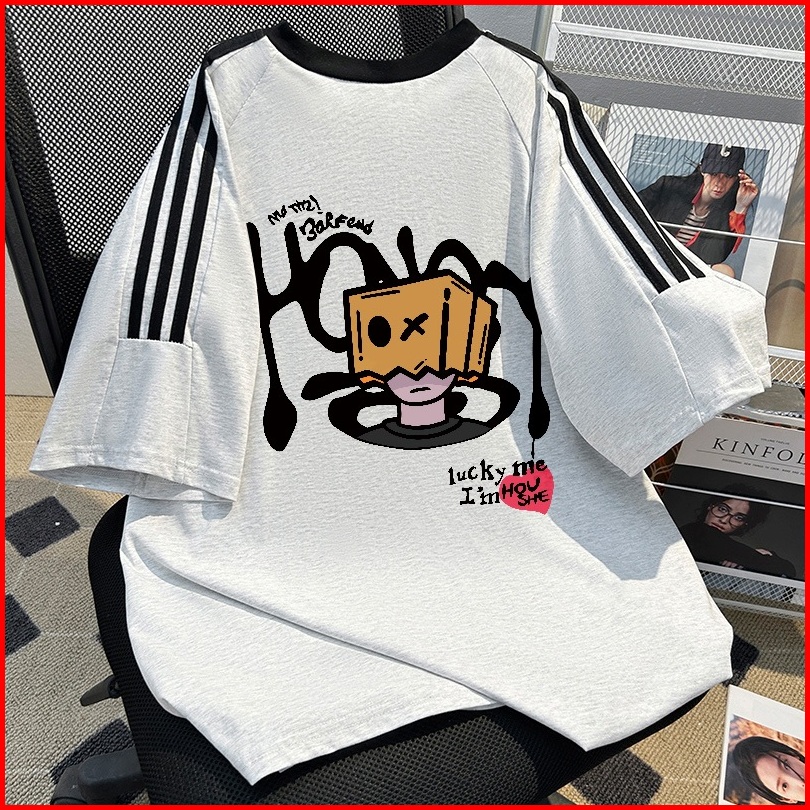 Po Floret Kaos Wanita Atasan Lengan Box Man Graffiti Baju Oversize Bergaris Bahu Korean Style Kaos Longgar