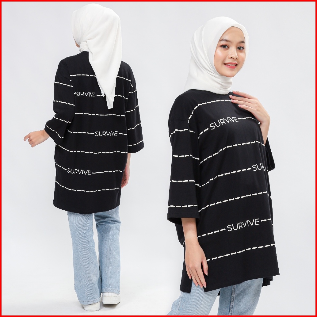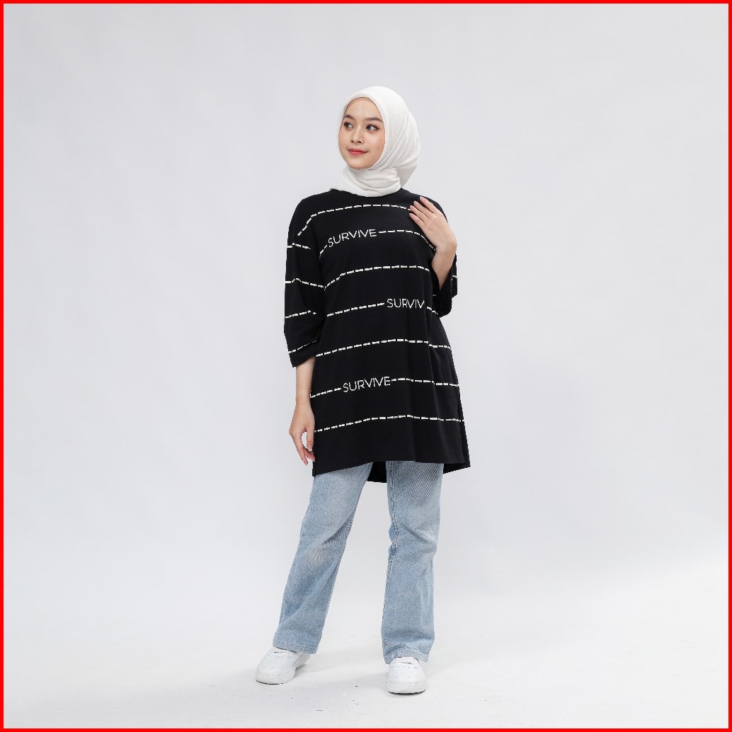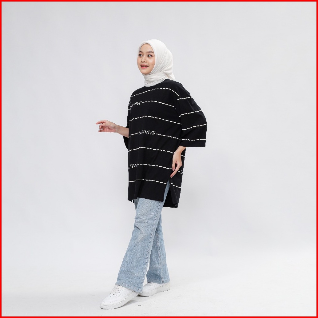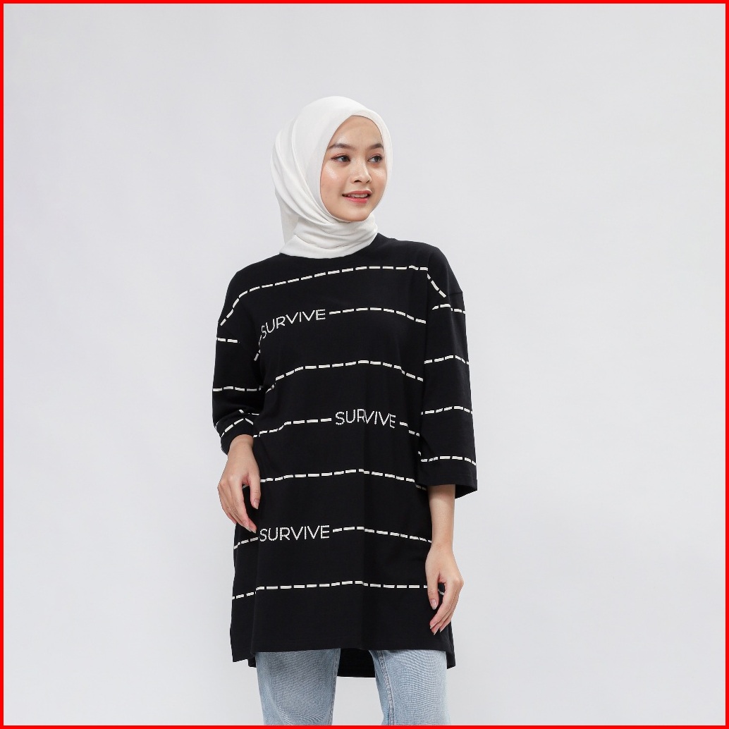 Survive Kaos Wanita Oversize Hitam Stripe Lengan 7 8