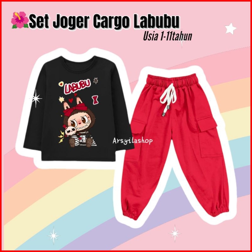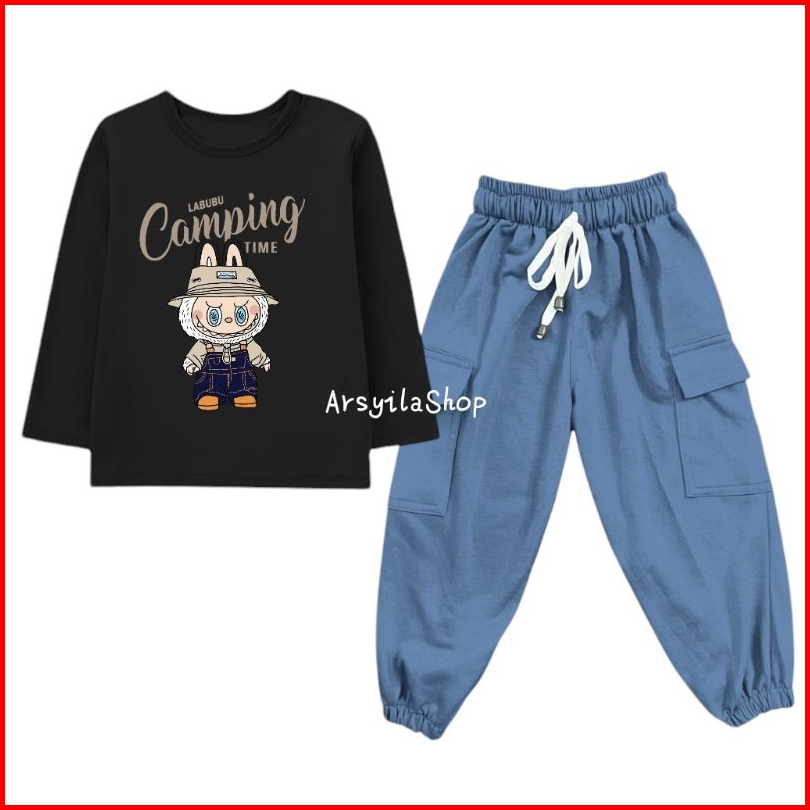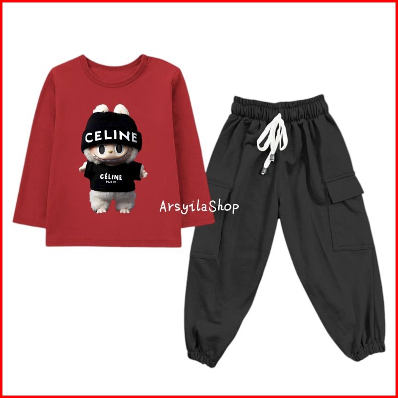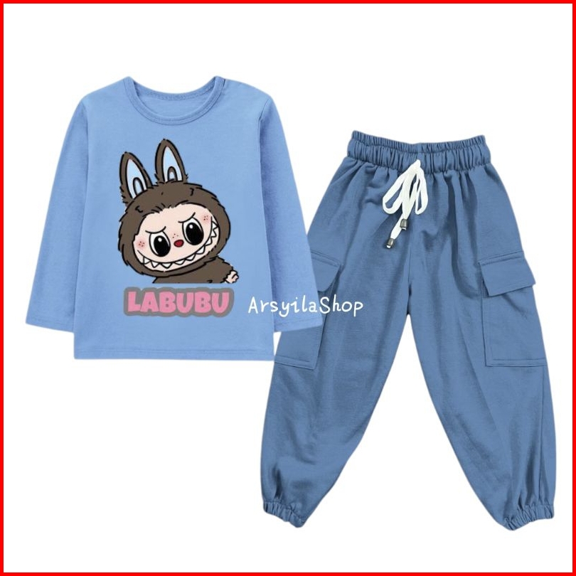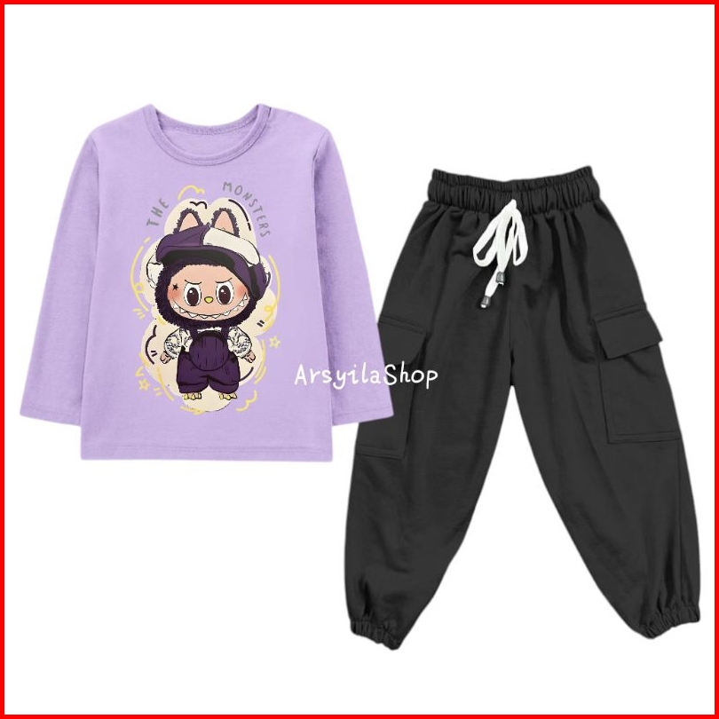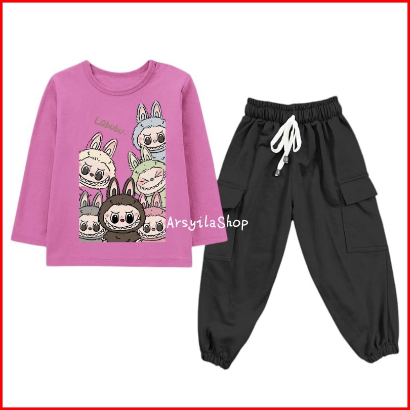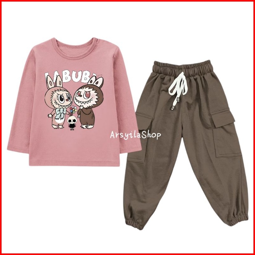 Setelan Labubu Anak Perempuan Lengan Panjang Kaos Labubu Macaron Anak Laki-laki Celana Cargo Joger Panjang Usia 1-11tahu