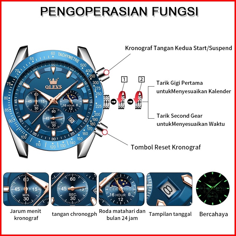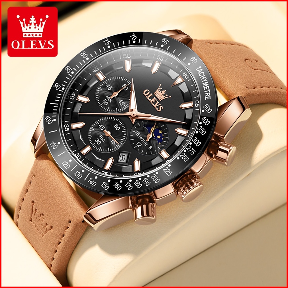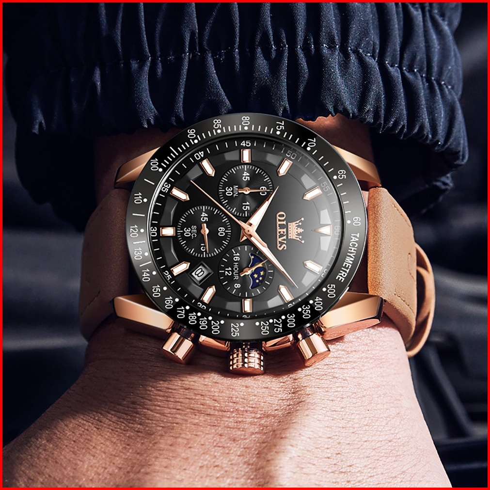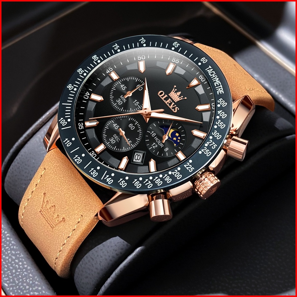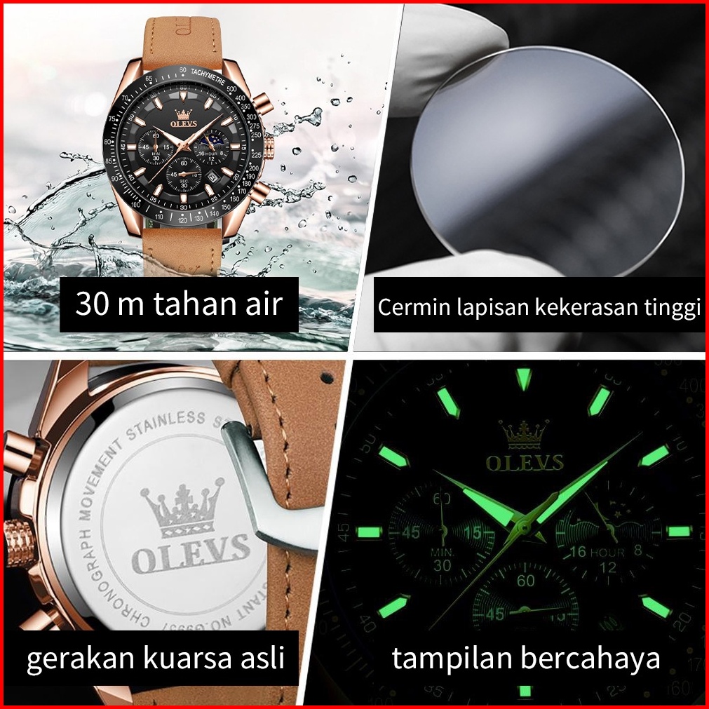 Olevs Jam Tangan Pria Original Anti Air Kulit Tahan Keren Led Hitam Luxury Chronograph Watch Men Multifungsi Model 9957