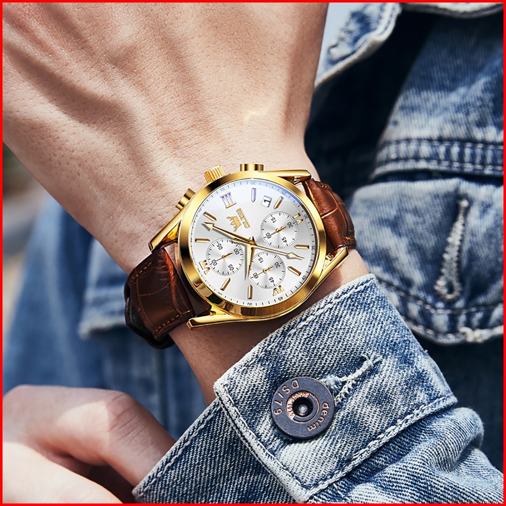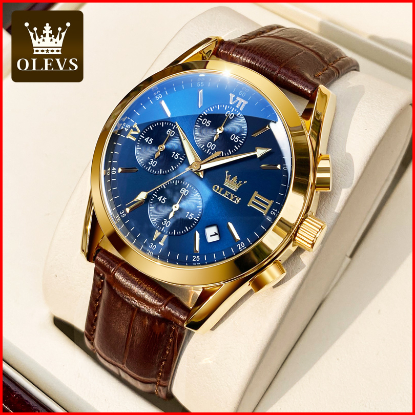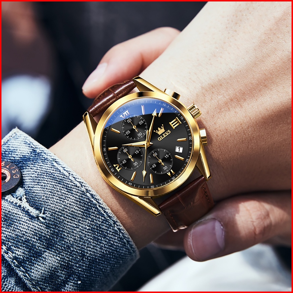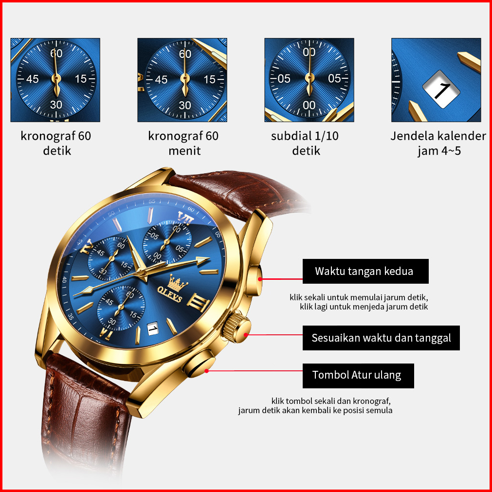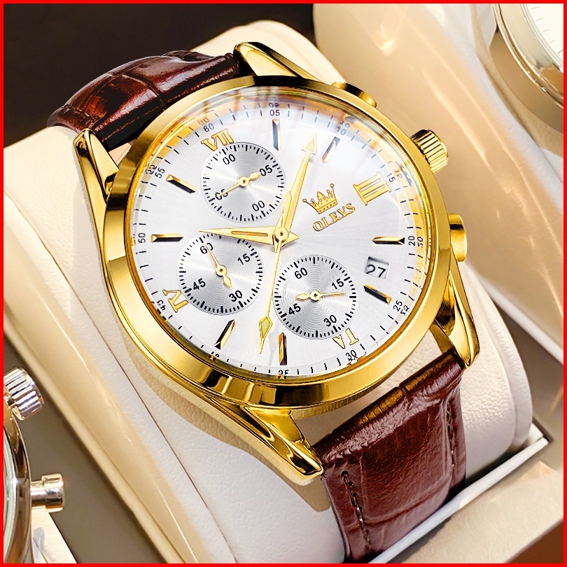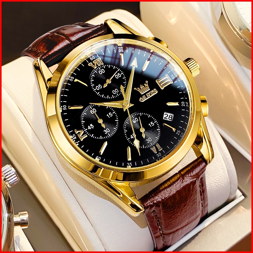 Olevs Jam Tangan Pria Original Anti Air Kulit Keren Coklat Luxury Chronograph Multifungsi Watch Men