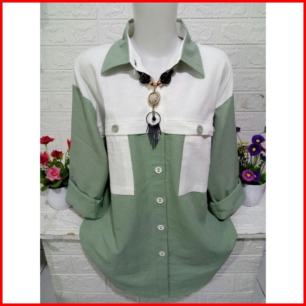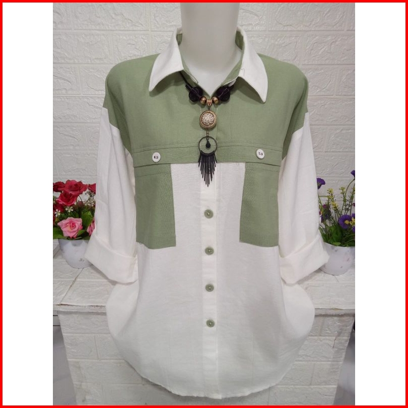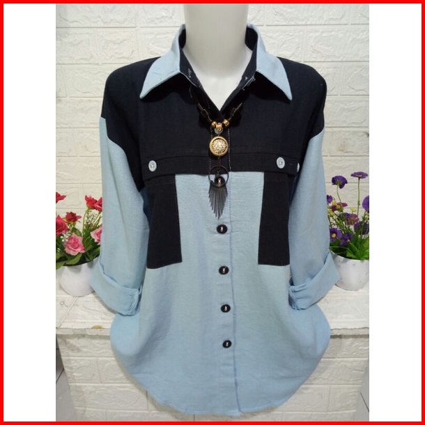 Baju Wanita Kemeja Fashion Atasan Kemeja Model Kombinasi Lengan Panjang F370