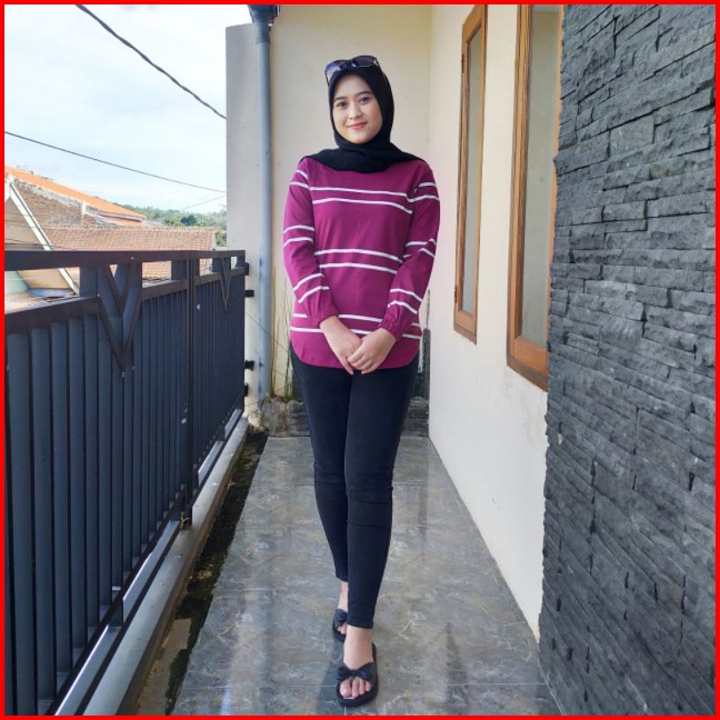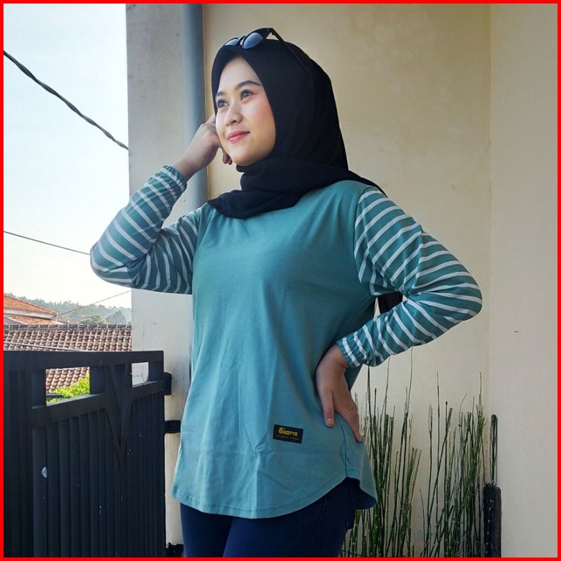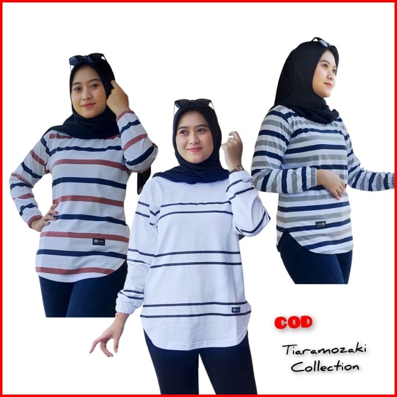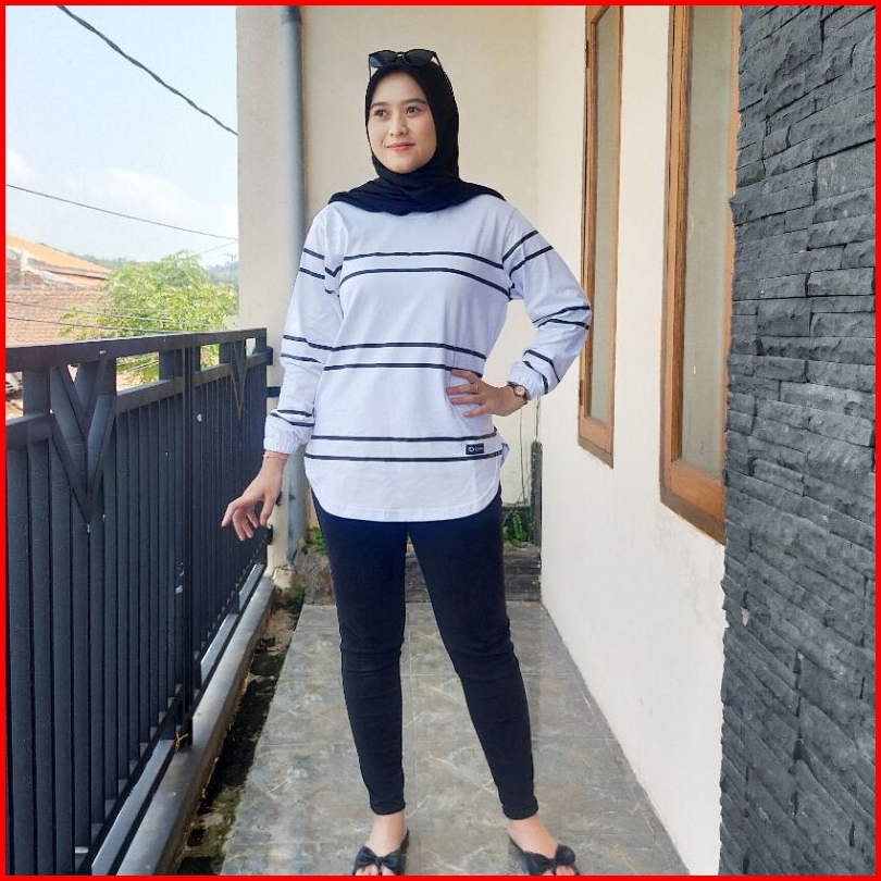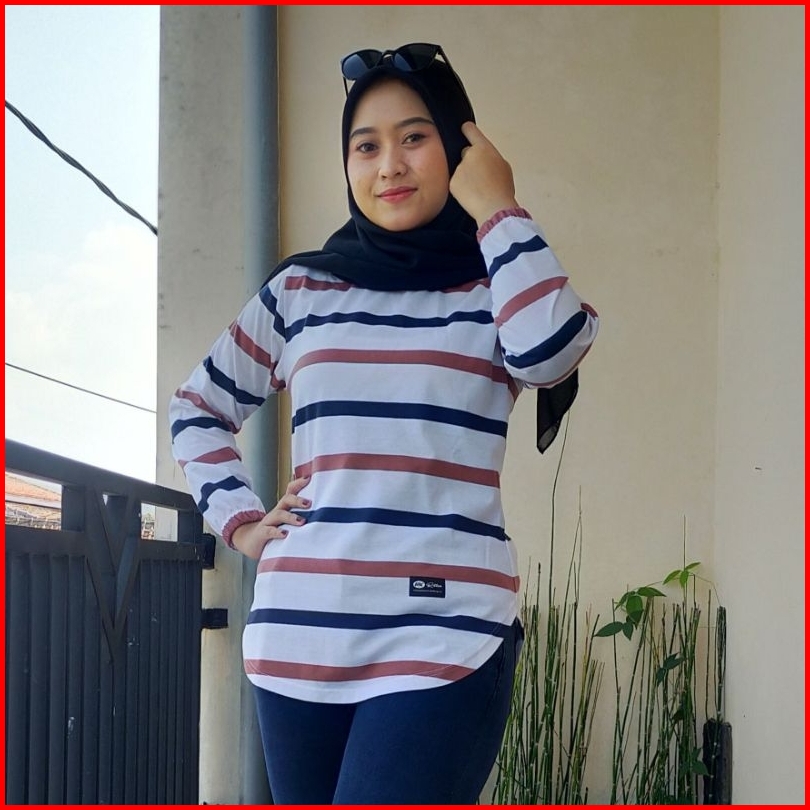 Kaos Lengan Panjang Wanita Kaos Oval Motif Garis Bahan Katun Kombad