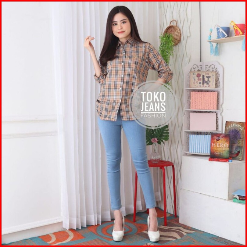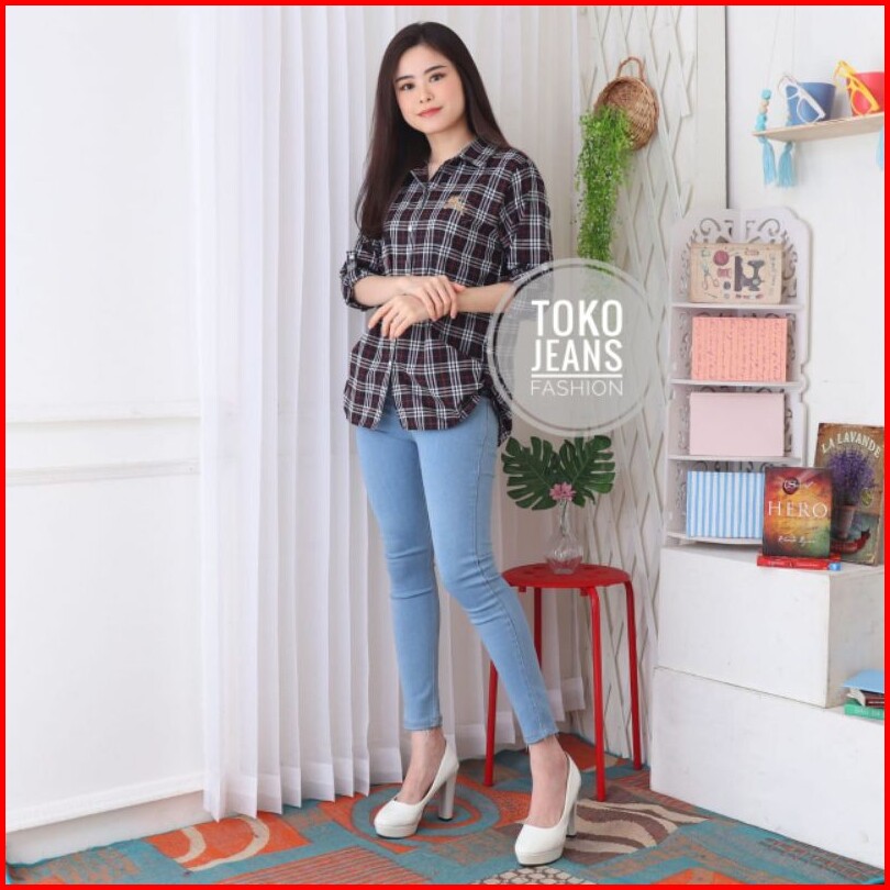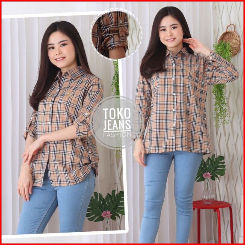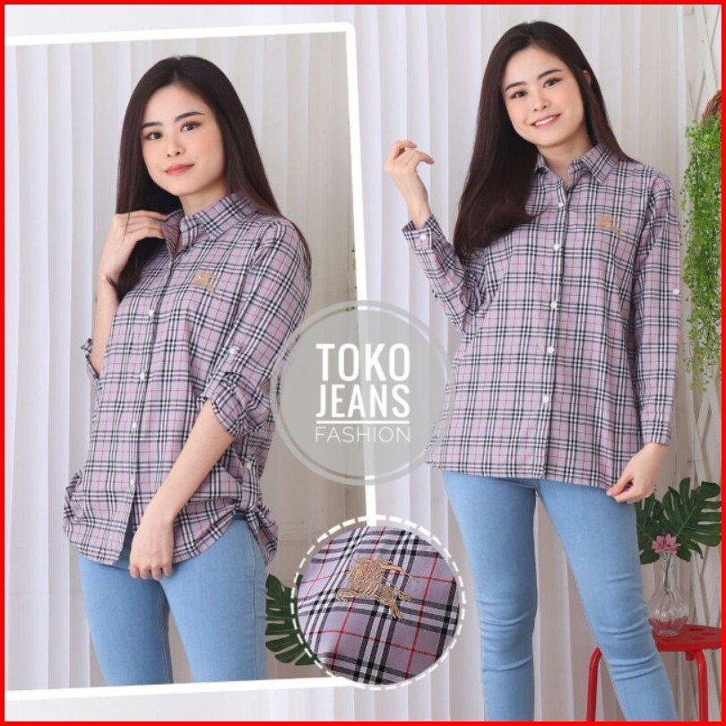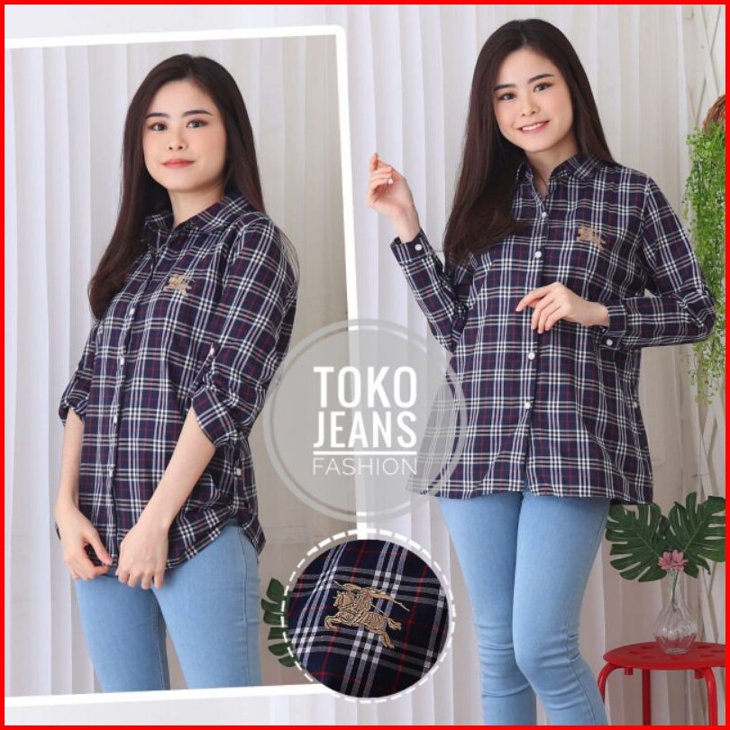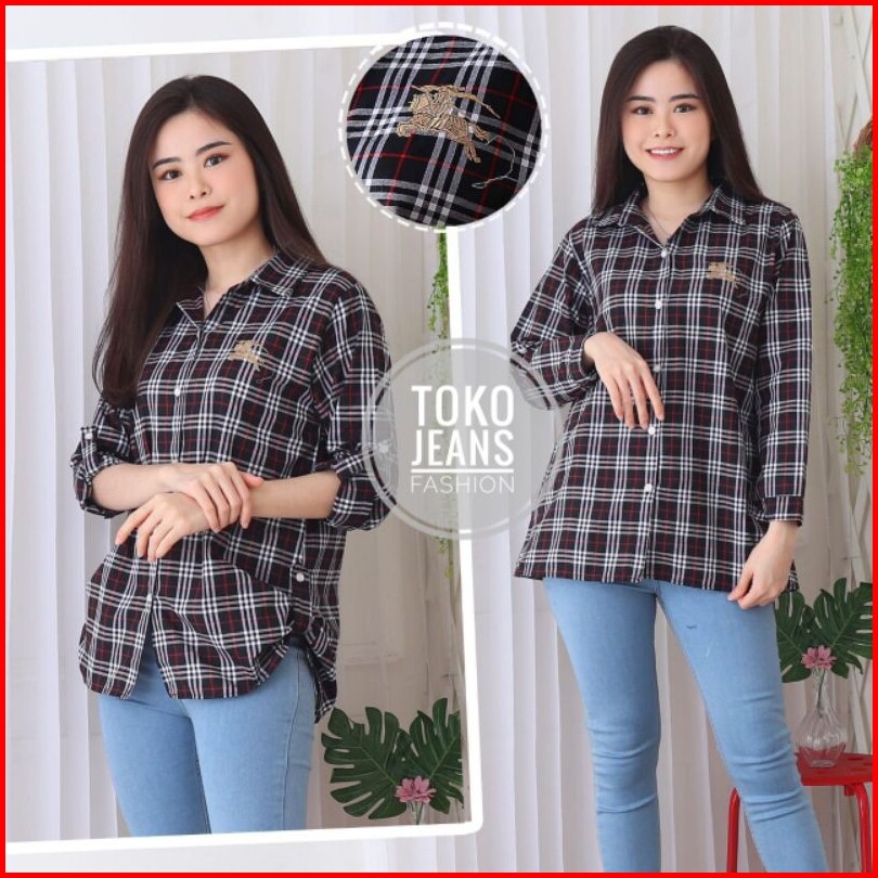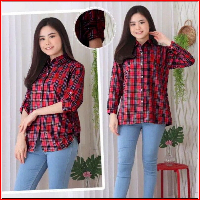Kemeja Kotak Katun Wanita Bordir Nyaman