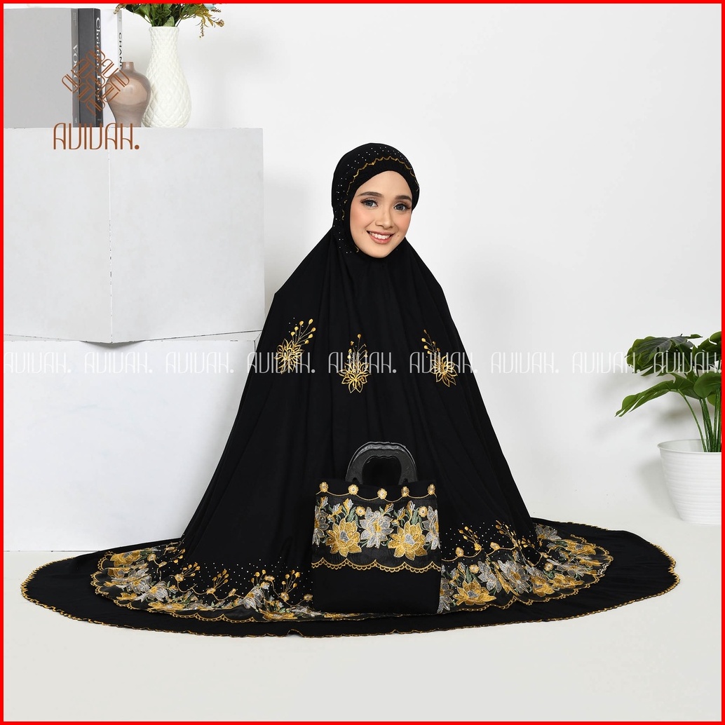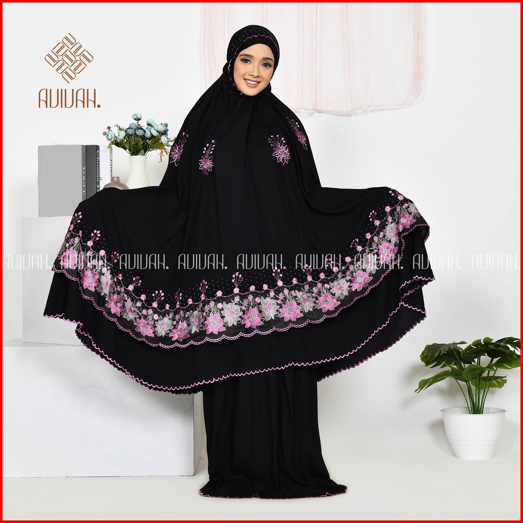 Mukena Dewasa Renda Mewah Bordir Rayon Hitam Dengan Manik Manik