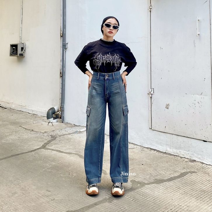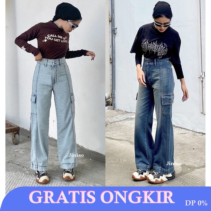 Celana Cargo Wanita JINISO High Waist Loose Jeans Cargo 406 HANDS UP Celana Jeans Wanita Cargo Jumbo Terbaru Biru