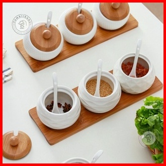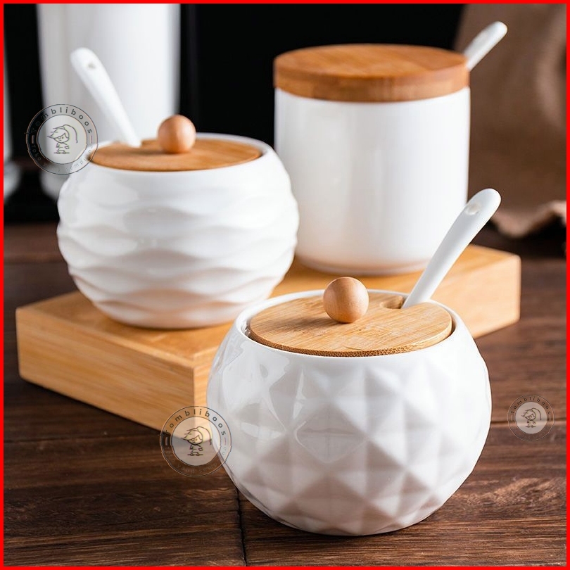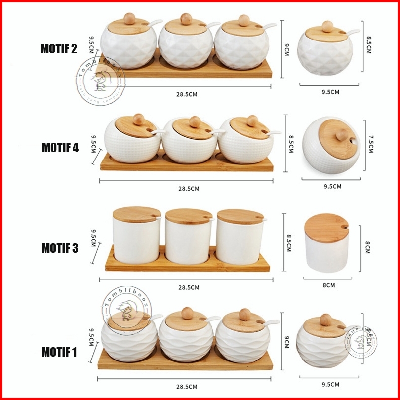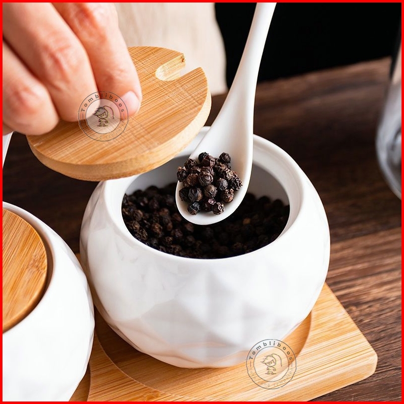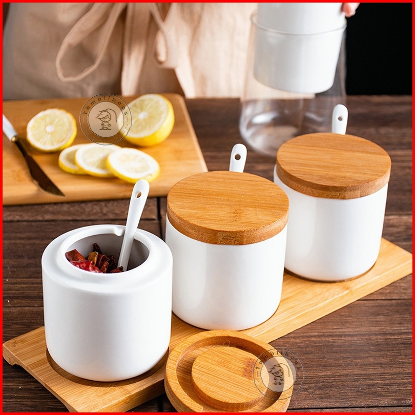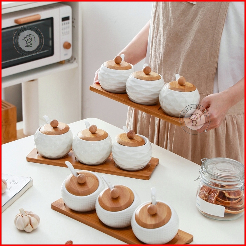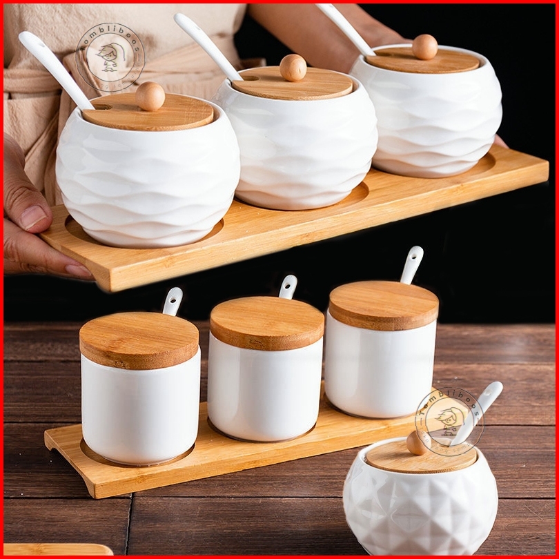Set Toples Bumbu Keramik Toples Kombinasi Keramik Bumbu Dapur Unik Toples Bumbu Set Tiga Potong 3 Dan 1 Wadah Kayu