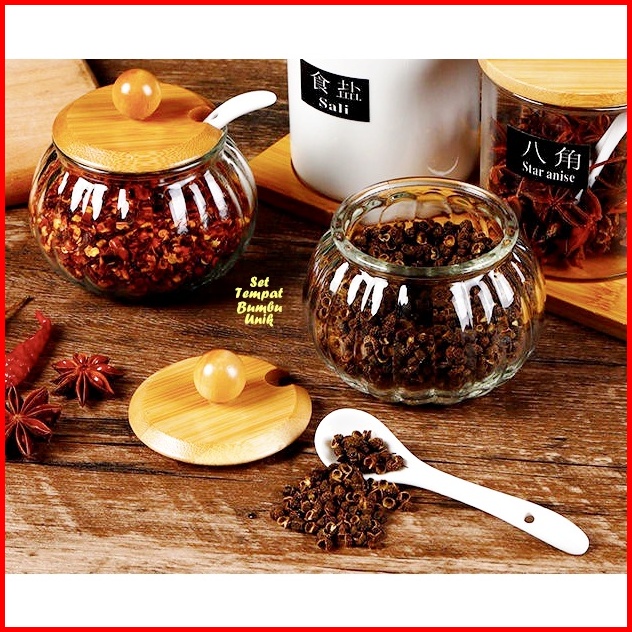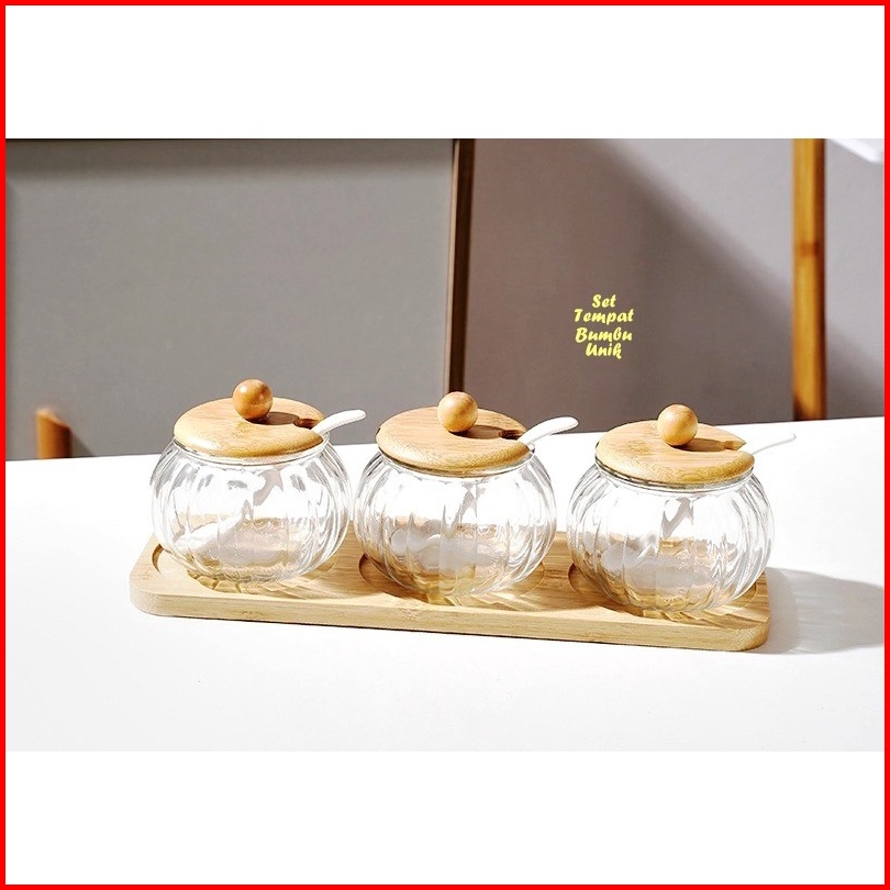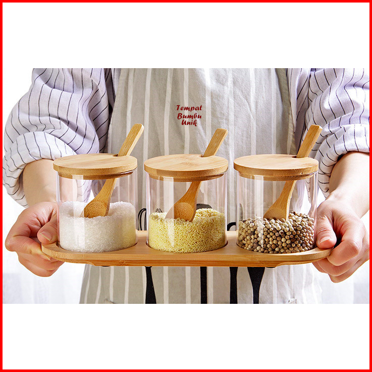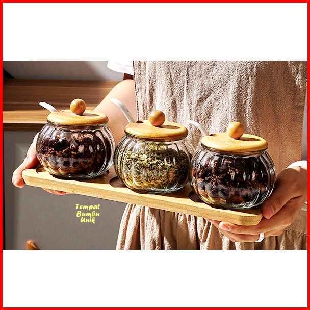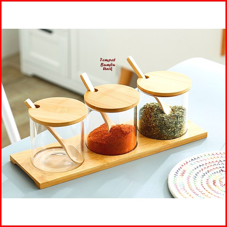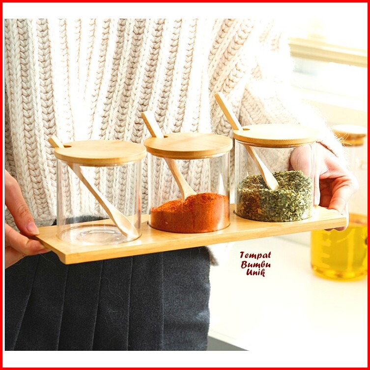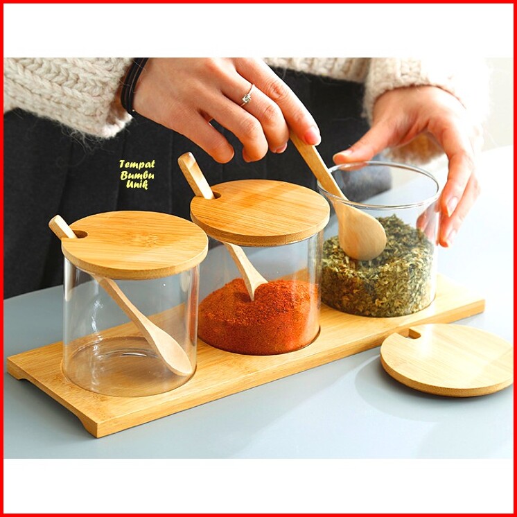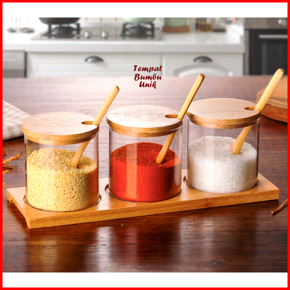 Tempat Bumbu Unik Kaca Kombi Kayu Isi 3 Tempat Bumbu 1 Wadah Kayu Set Tempat Bumbu Kaca Perlengkapan Dapur Unik Rak Dapu