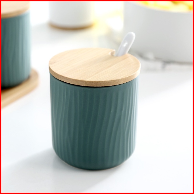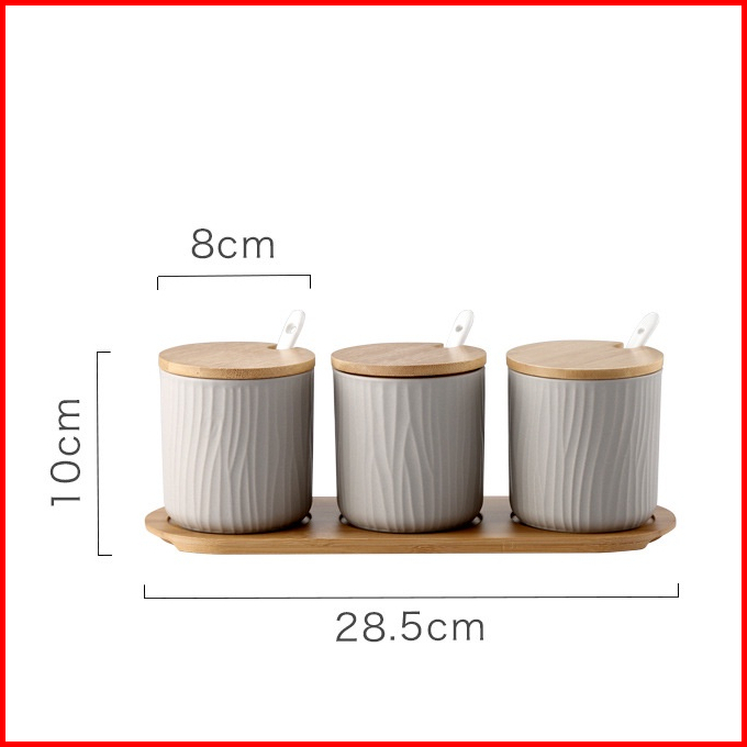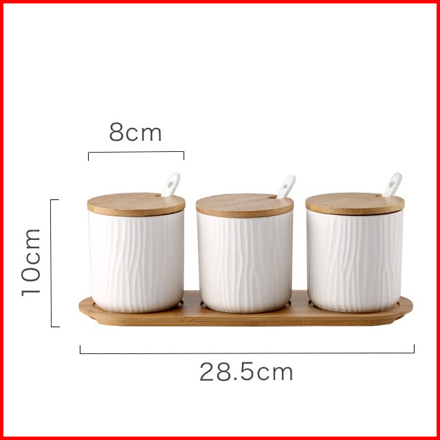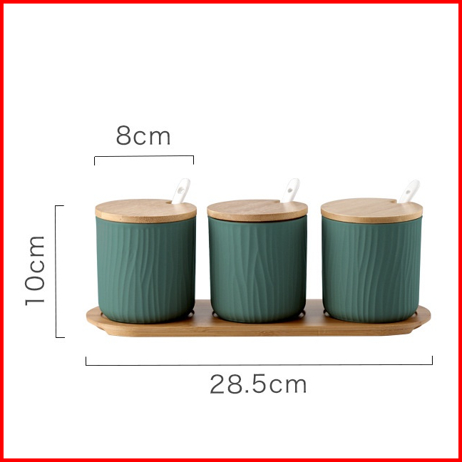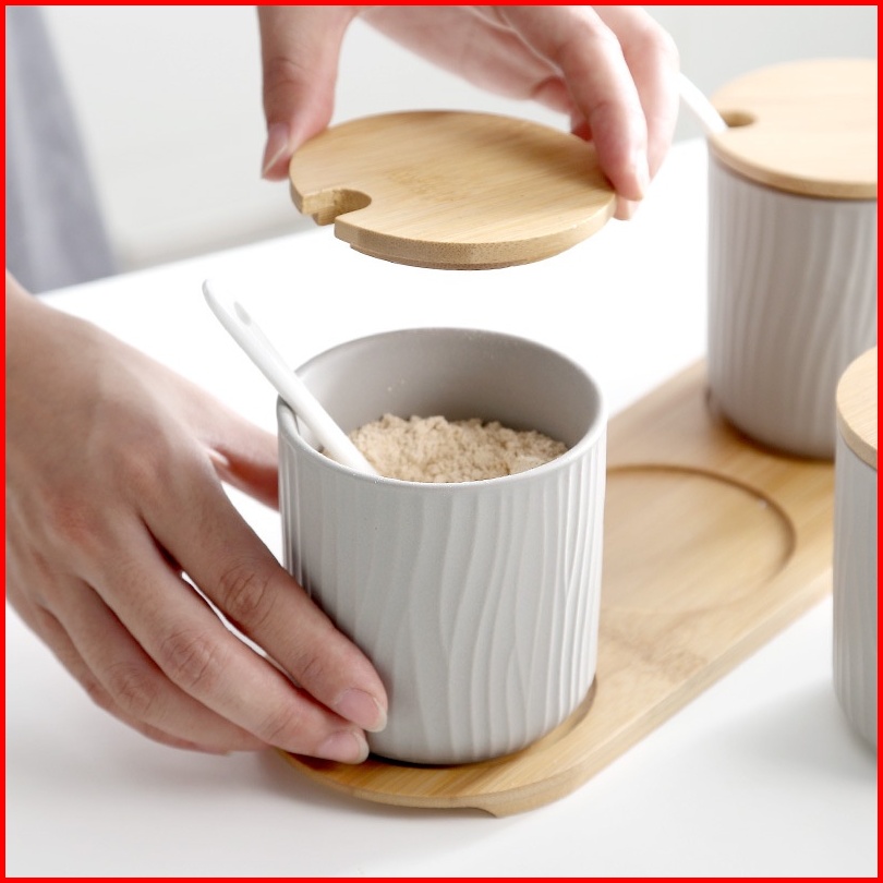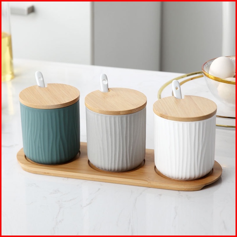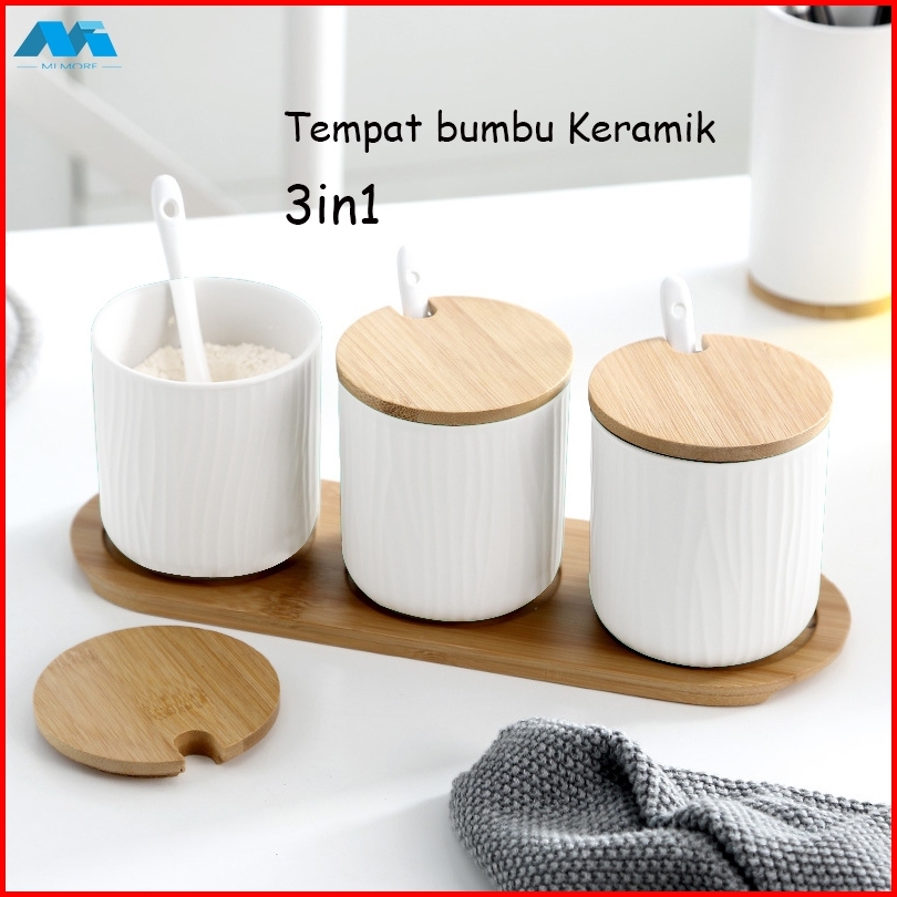 Tempat Bumbu Keramik 3in1 Astetik Seasoning Jar Set 3 Toples 3 Sendok 1 Palet Kayu