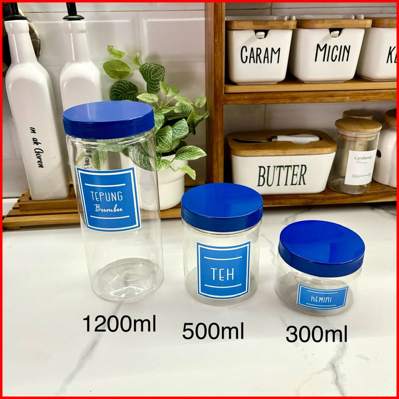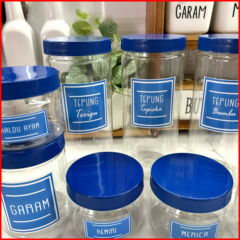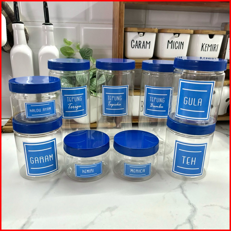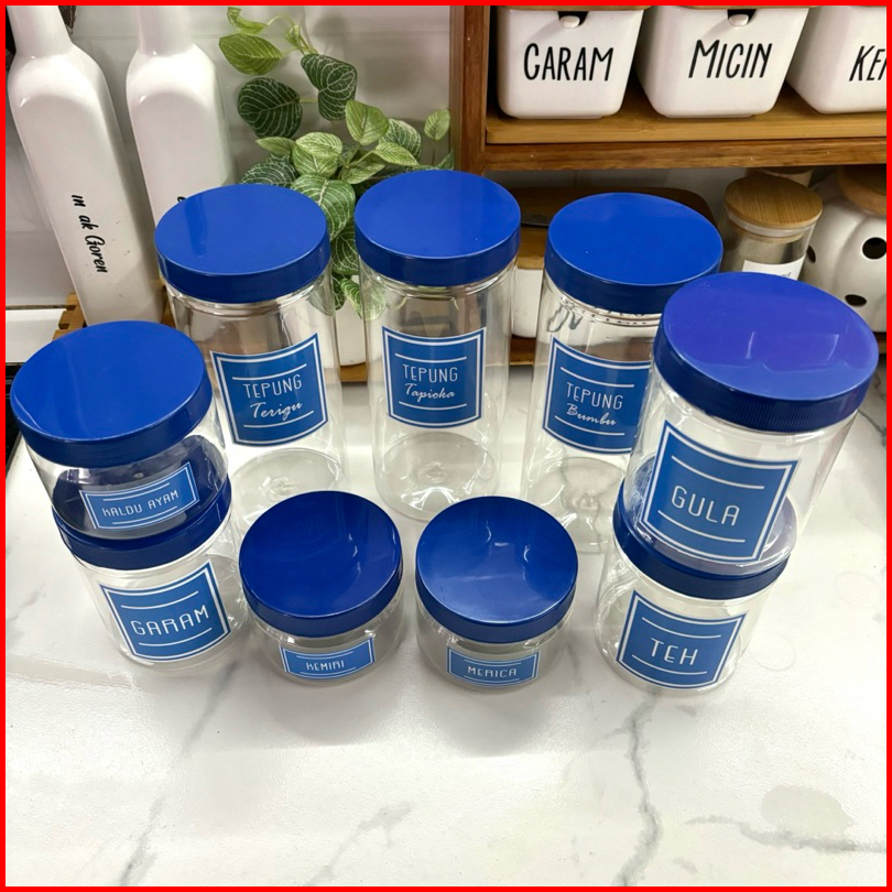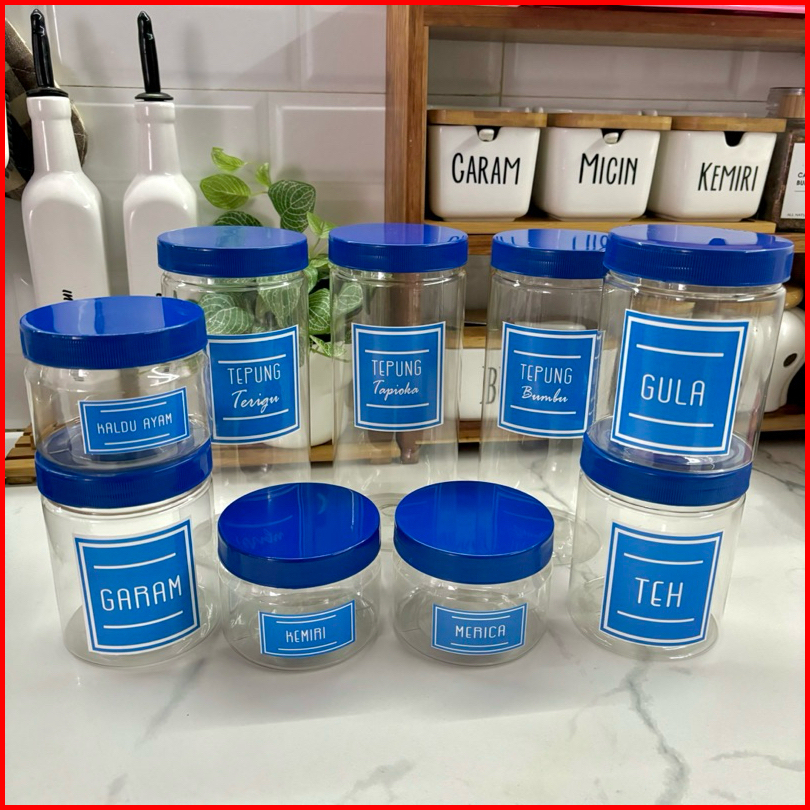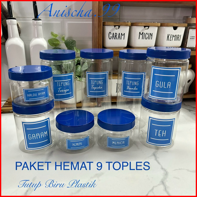 Anischa Paket Hemat 9 Toples Bumbu Dapur Tutup Biru Plastik Free Stiker Air