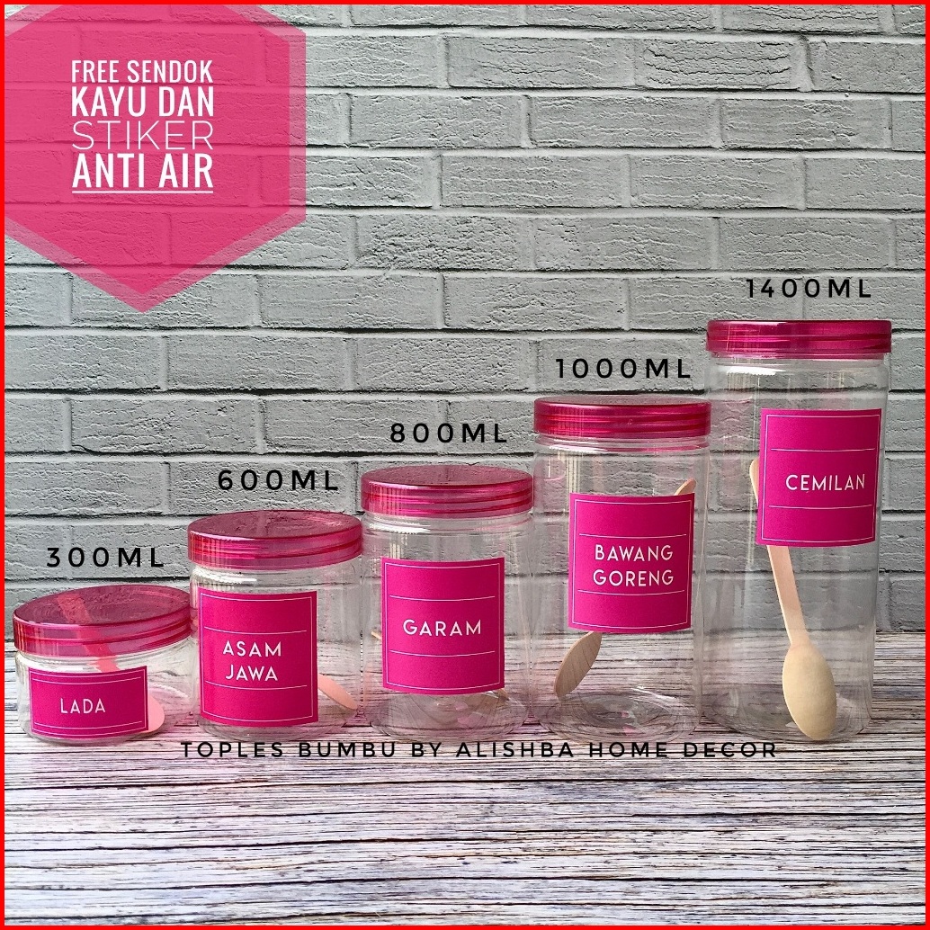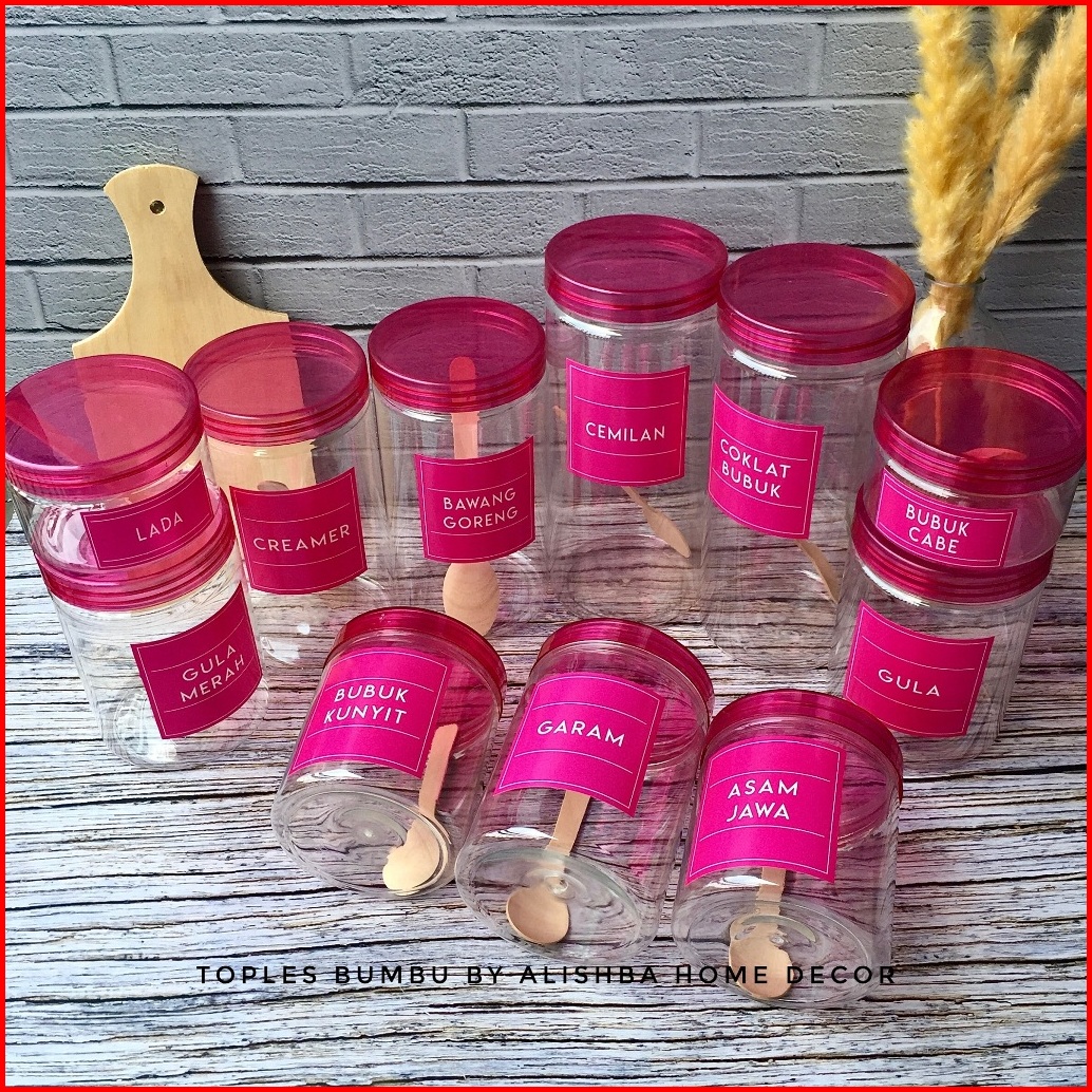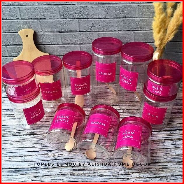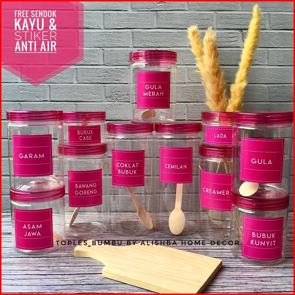 Toples Bumbu Dapur Tutup Pink Plastik 11 Pcs Paketan Model Minimalis Free Sendok Kayu Dan Label Stiker Anti Air