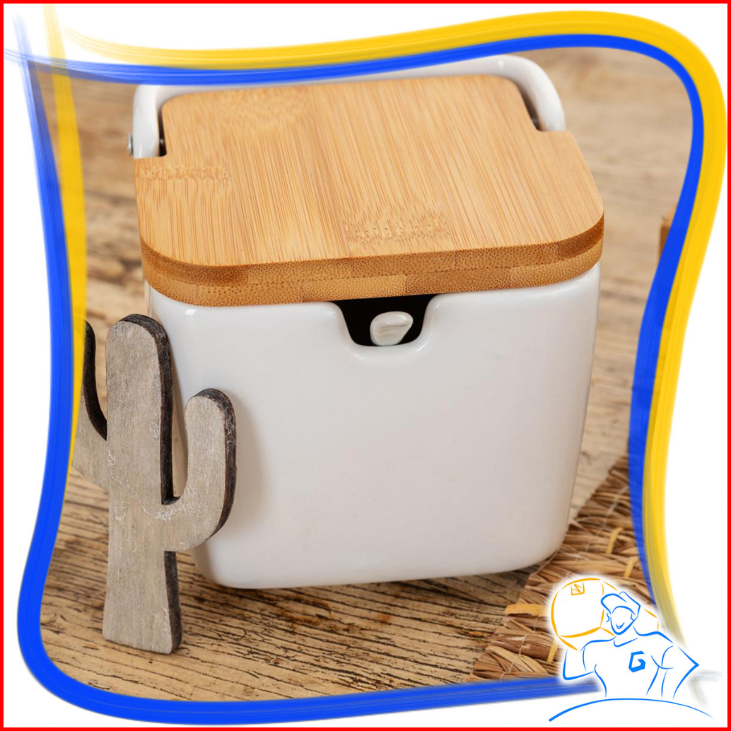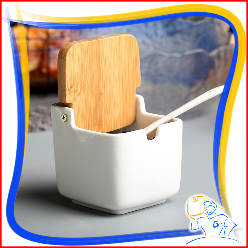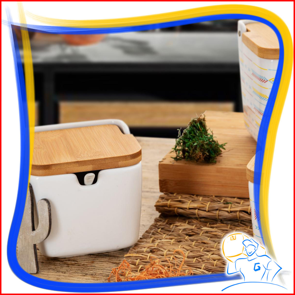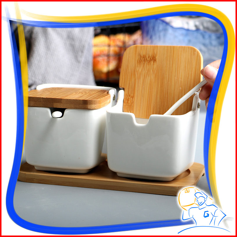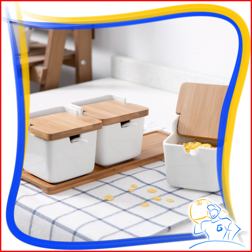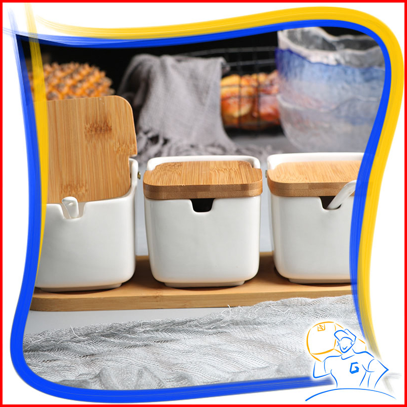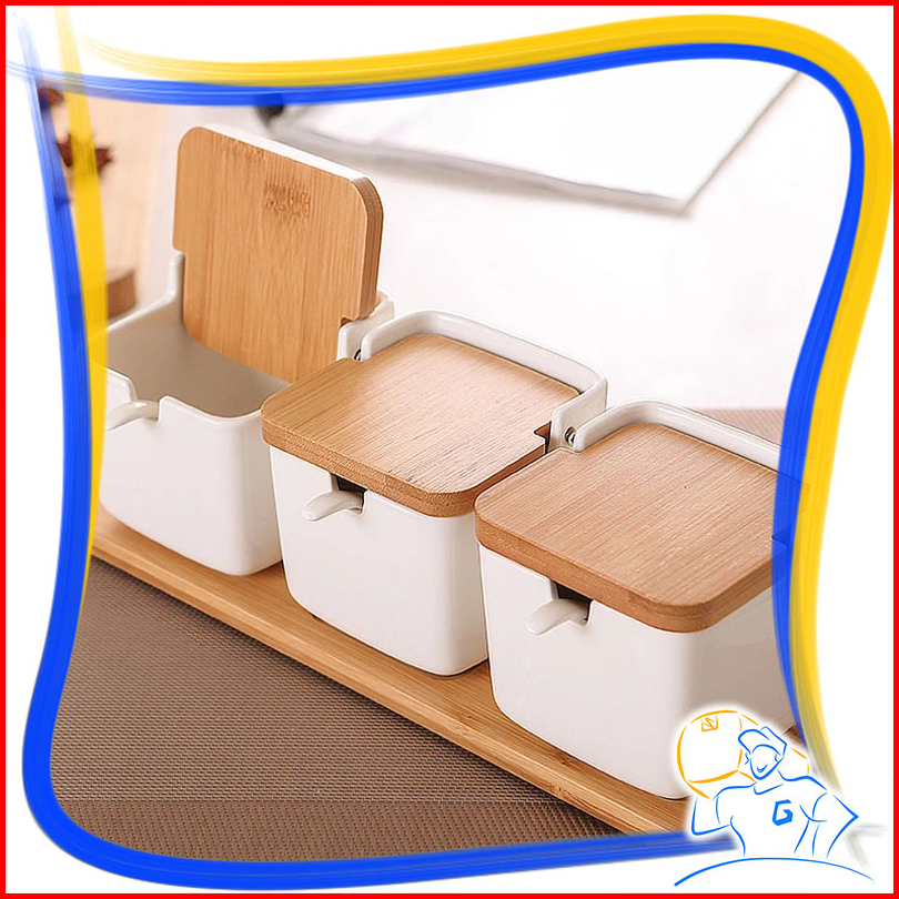 3 In 1 Set Tempat Bumbu Dapur Keramik Kotak Alas Kayu Aesthetic
