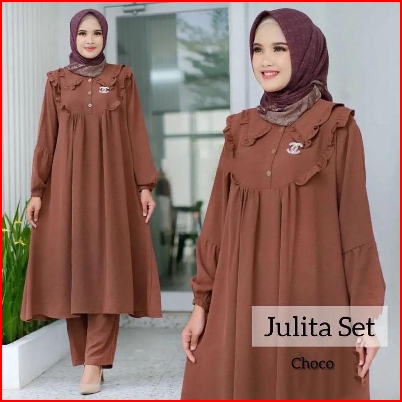 New Julita Set Crinkle Airflow Jumbo Ld 120 Long Tunik Setelan Muslim Wanita Terbaru Bahan Crinkle Setelan 2in1 Termurah