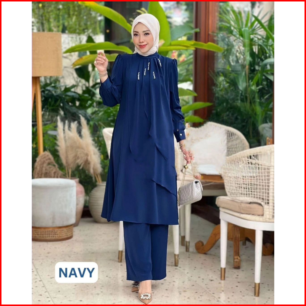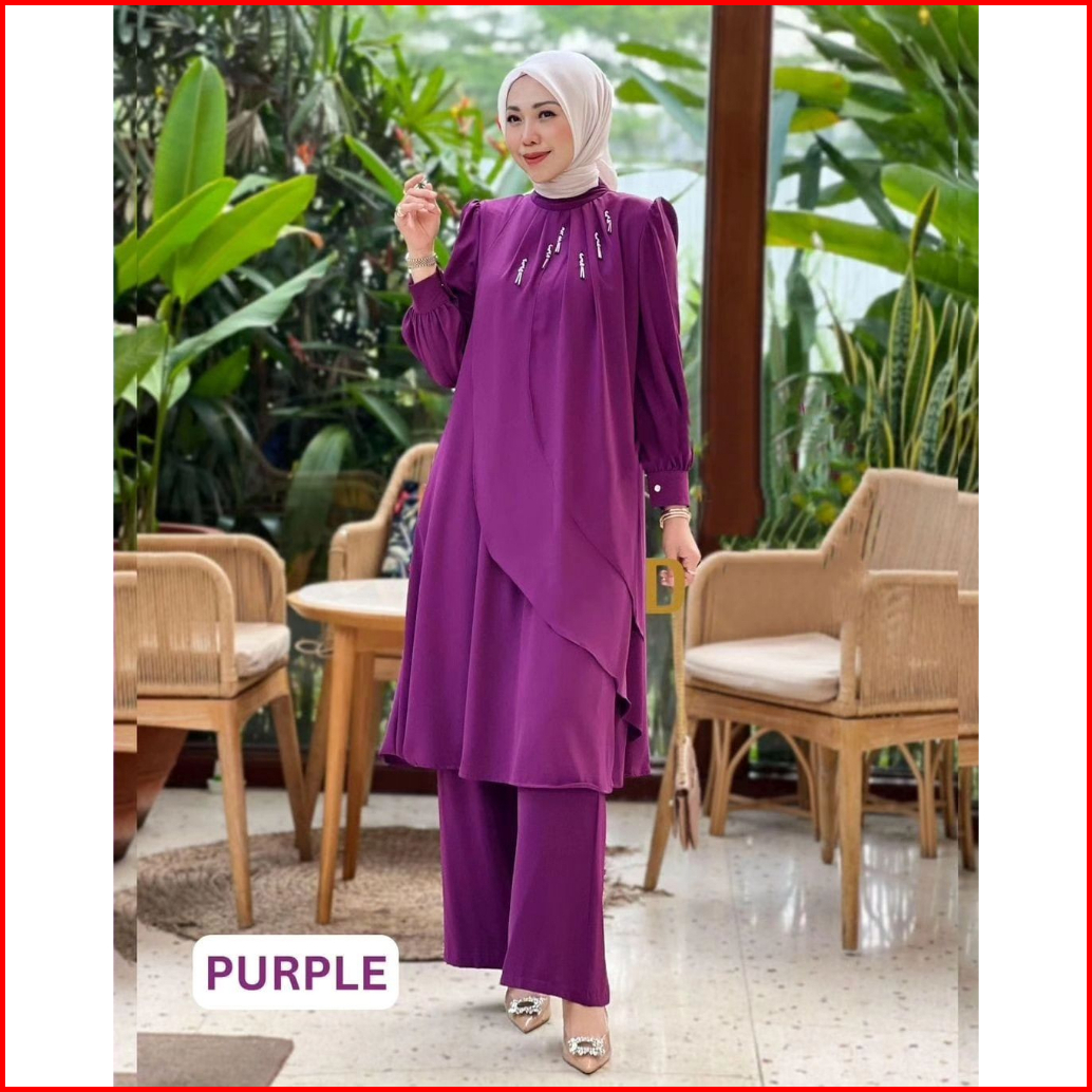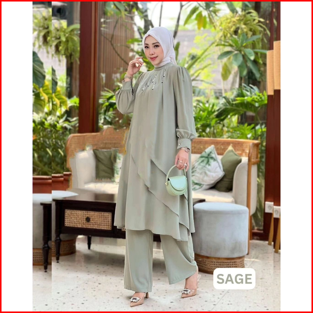 Dafiya Set Setelan Wanita Matt Crinkle Aksen Mutiara Payet Setelan Atasan Tunik Dan Celana Wanita Rc