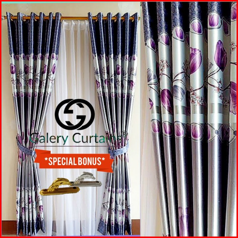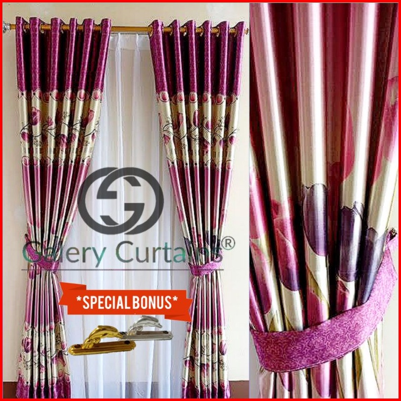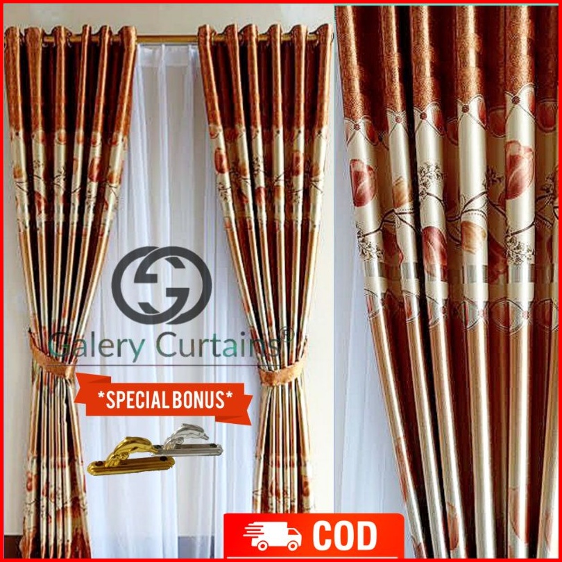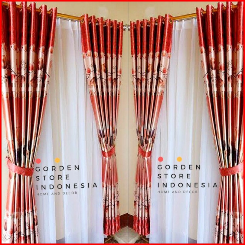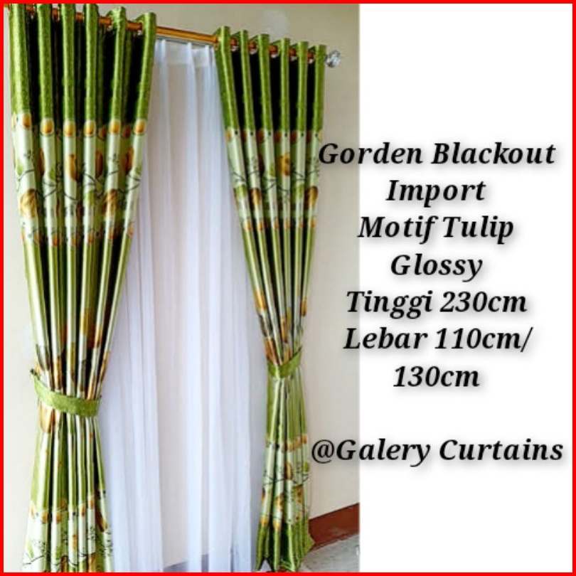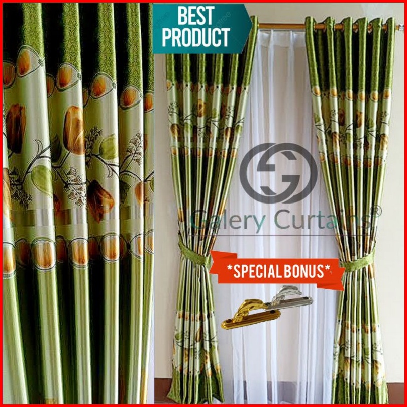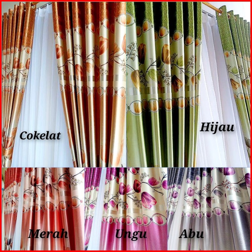 Gorden Jendela Dan Pintu Motif Tulip Hijau Merah Cokelat Model Smokering Ukuran Lebar 120cm-140cm X Tinggi 230cm