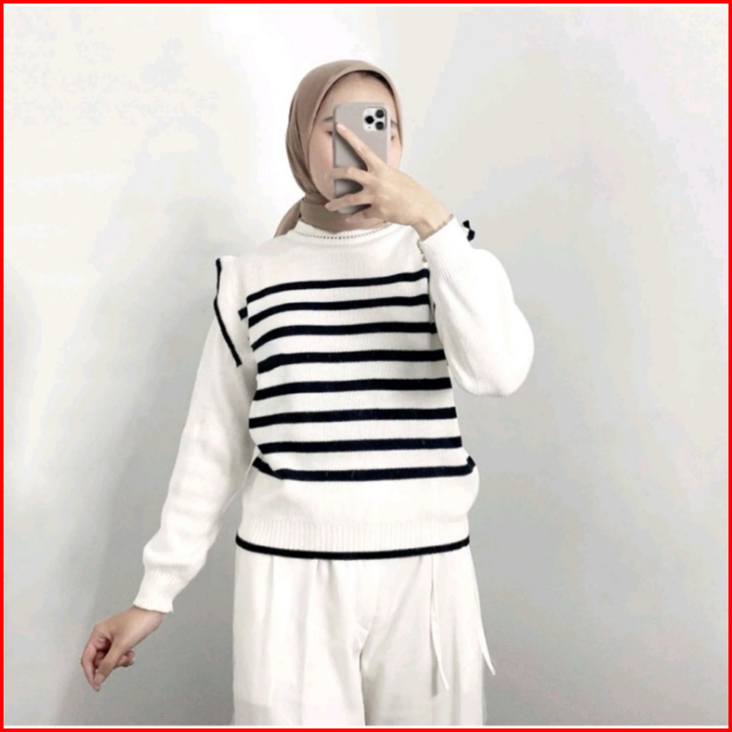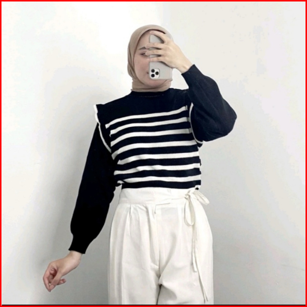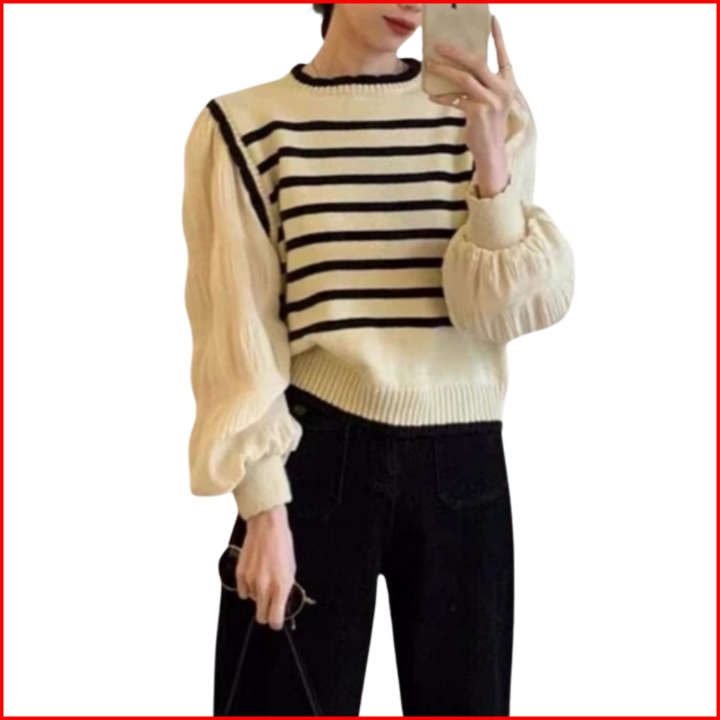 Atasan Knit Wanita Lengan Balon Lengan Panjang Basic Korean Rajut Motif Garis