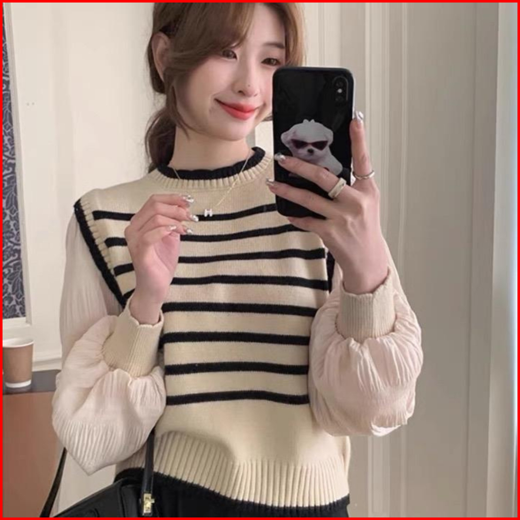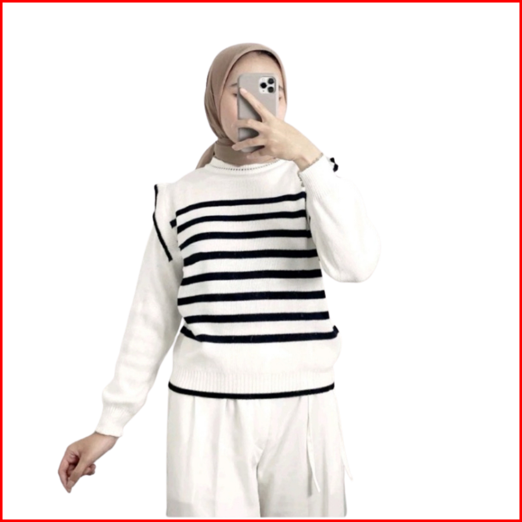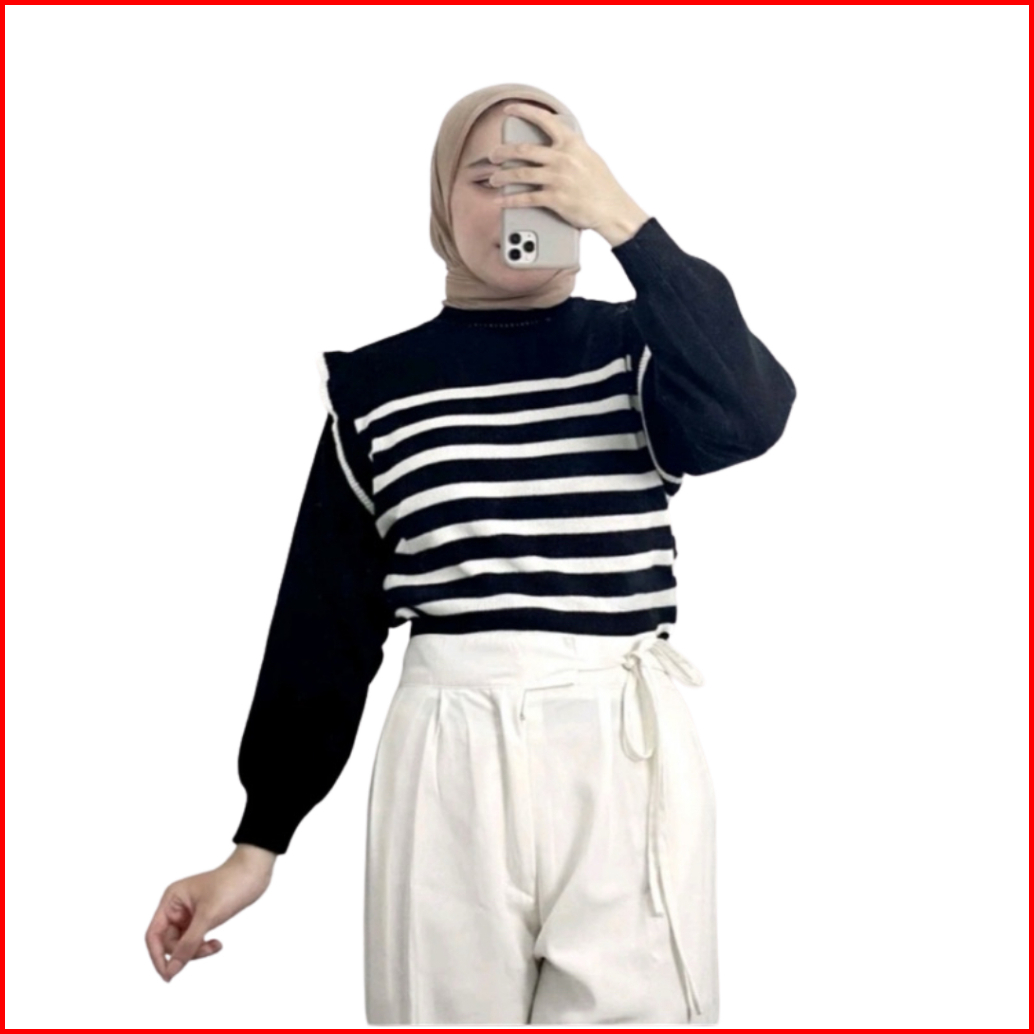 Atasan Knit Wanita Lengan Balon Lengan Panjang Basic Korean Rajut Motif Garis