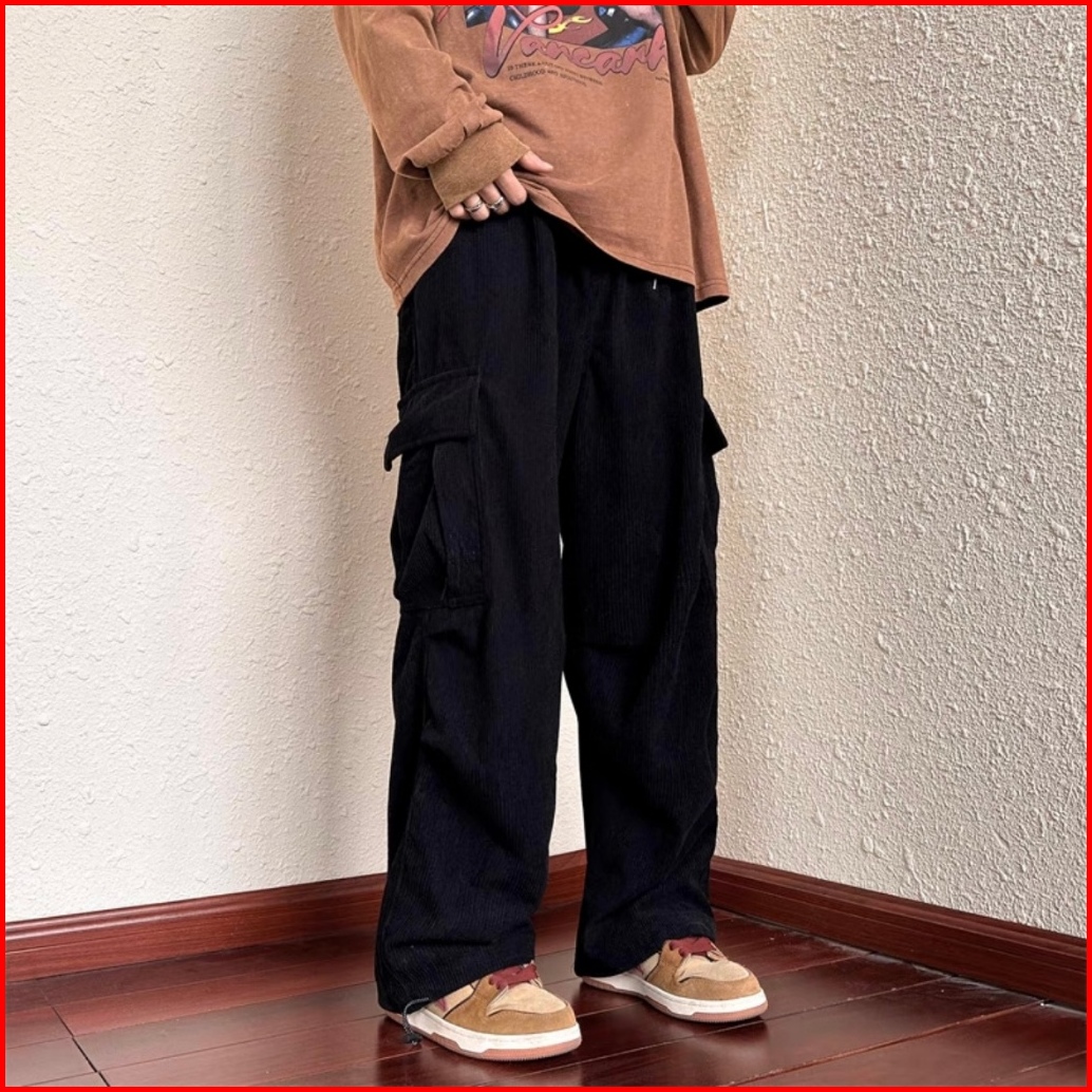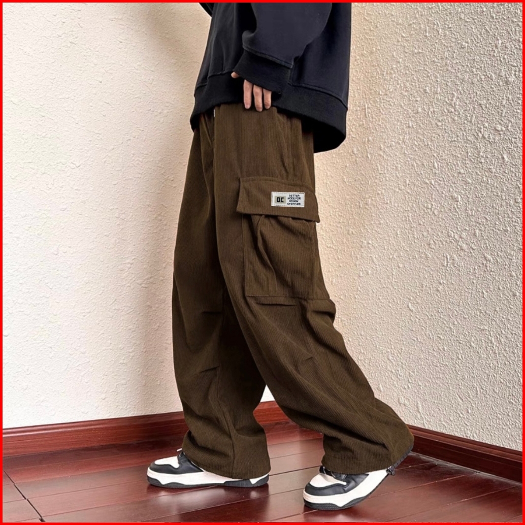 Celana Corduroy Pria Straight Casual Celana Panjang Cowok Retro Distro Saku Samping Celana Cargo Tali Terbaru Korean Sty