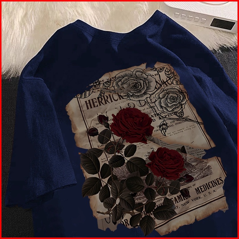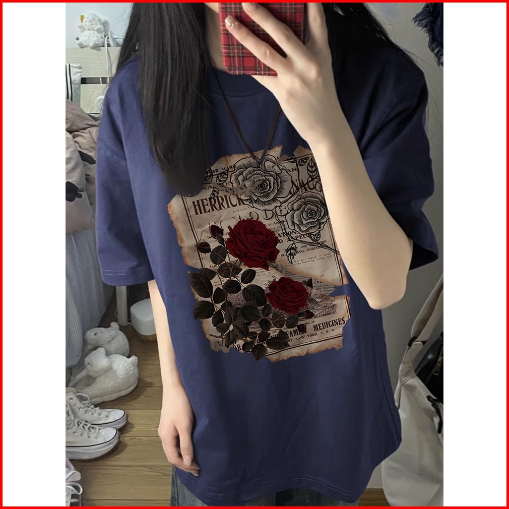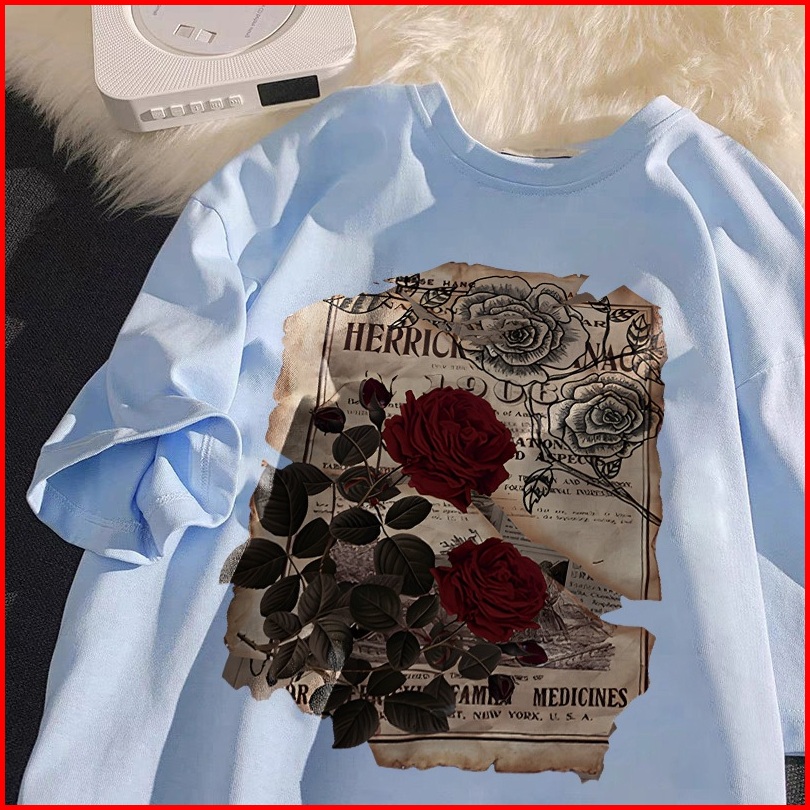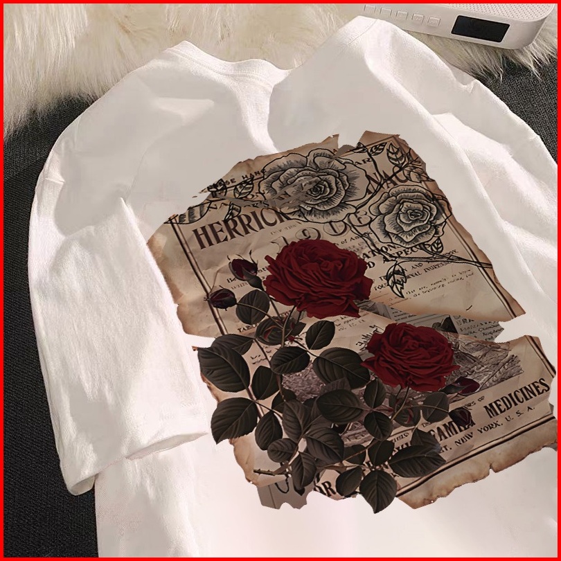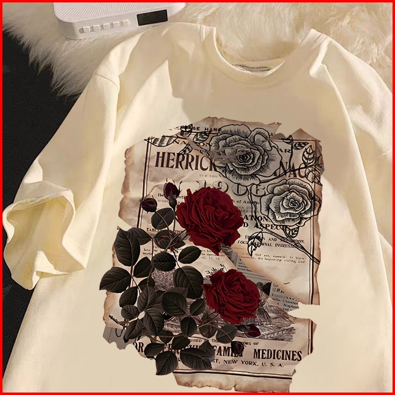 Po Floret Putih Kaos Oversize Lengan Pendek Newspaper Rose Katun Murni Retro Style Wanita Baju Atasan Wanita Terbaru