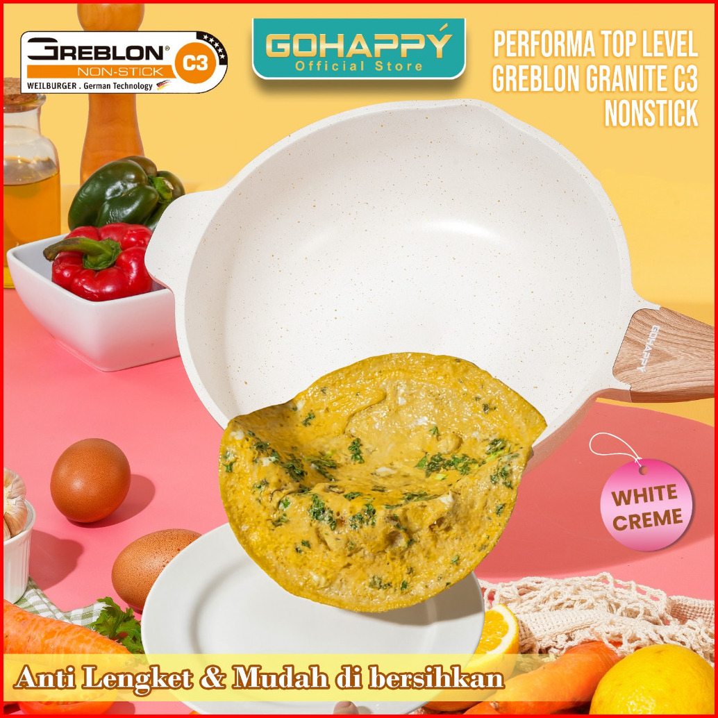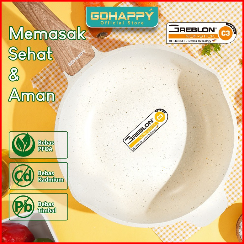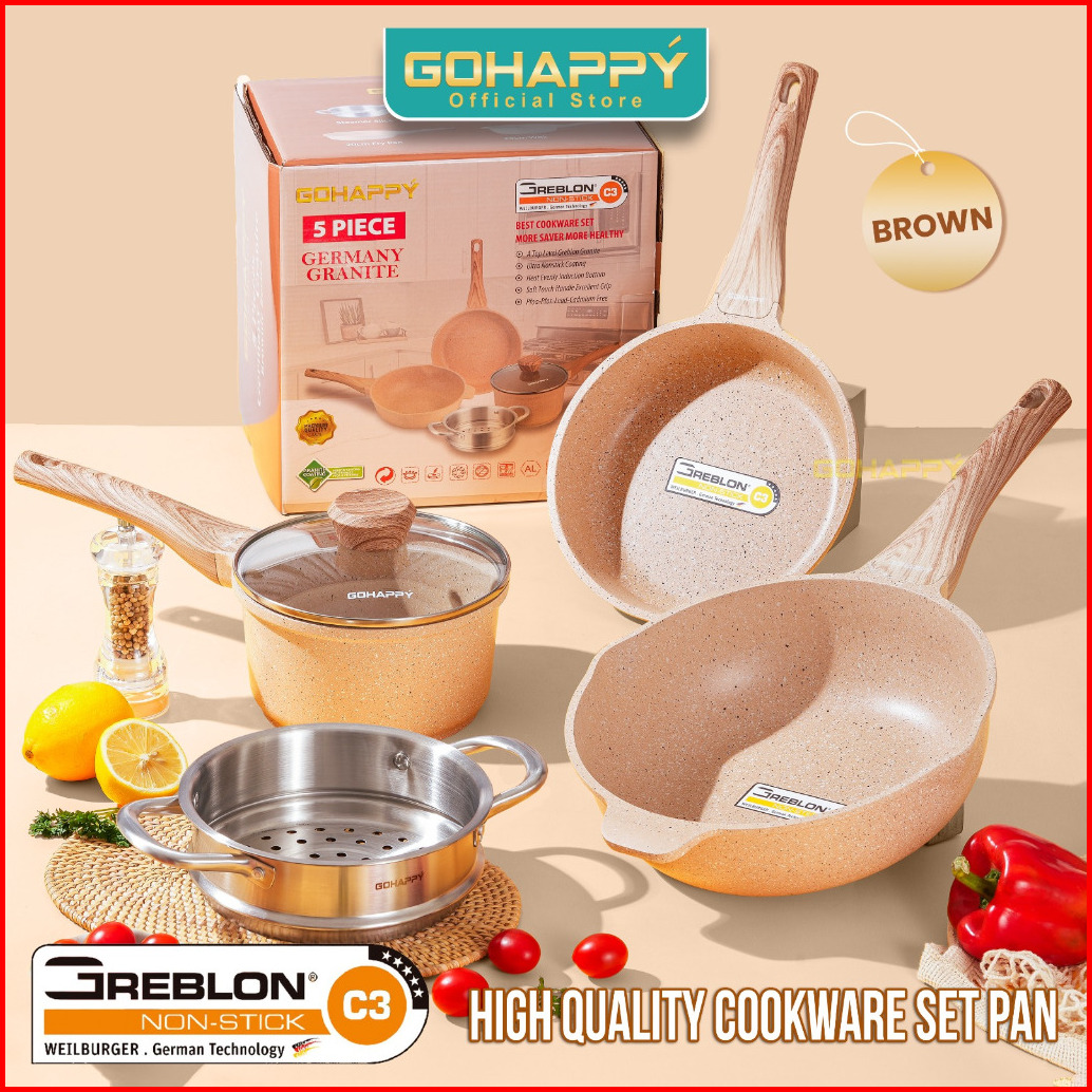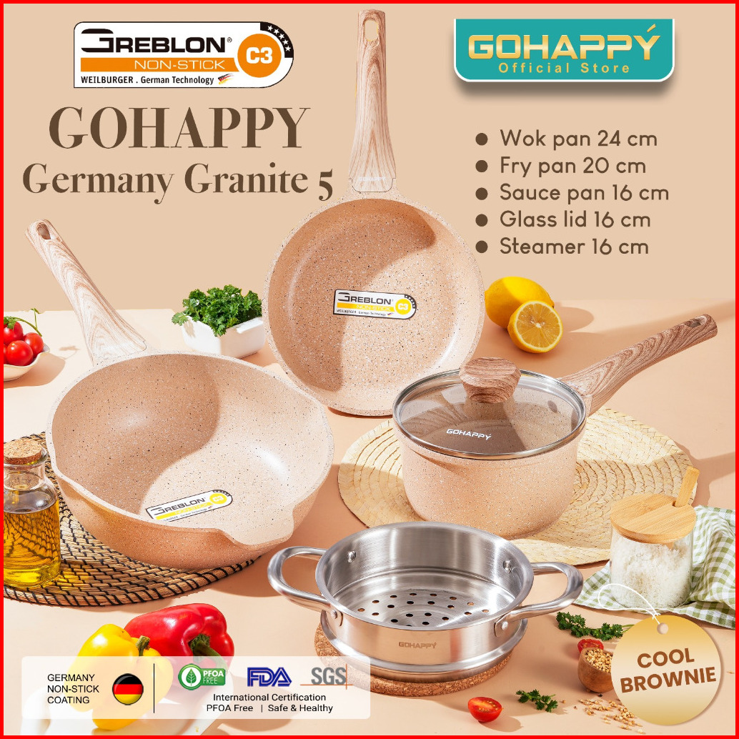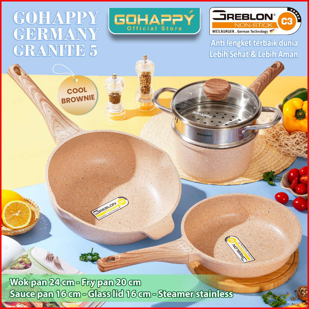 Panci Set 5pcs Granite Go Happy Germany - Anti Lengket Maifan Stone Premium Greblon C3 Wok Fry Sauce Pan