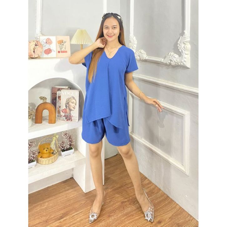 Ouotfit Wanita Cringkle Slavina Kerah V Polos Lengan Pendek Oneset Wanita Casual Pakaian Wanita Santai