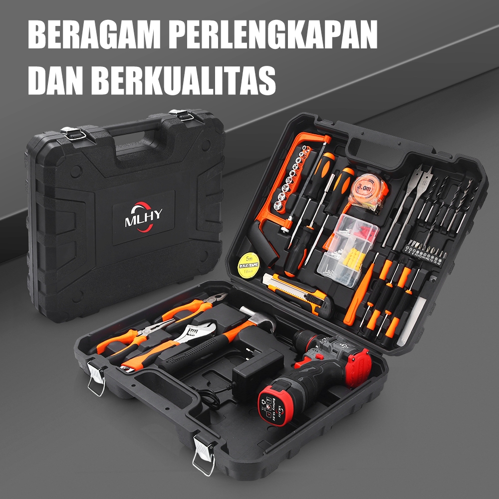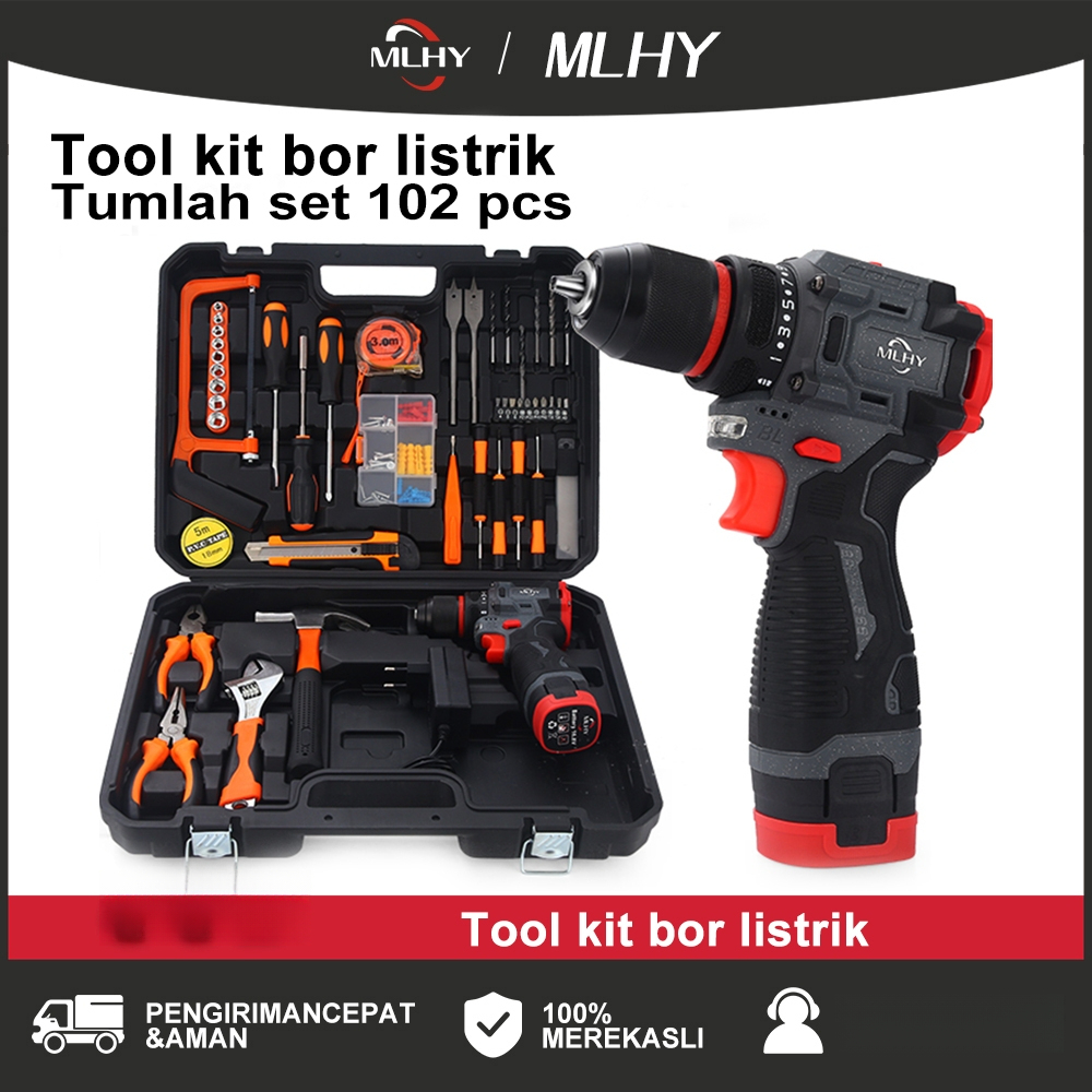 MLHY Toolkit Set Bor 102Pcs 16.8v Bor Listrik Cordless Tang Obeng Palu Kunci Pas Toolkit Alat Rumah Brushelss Bor