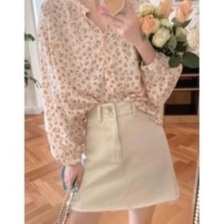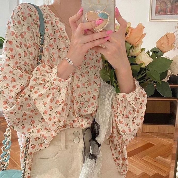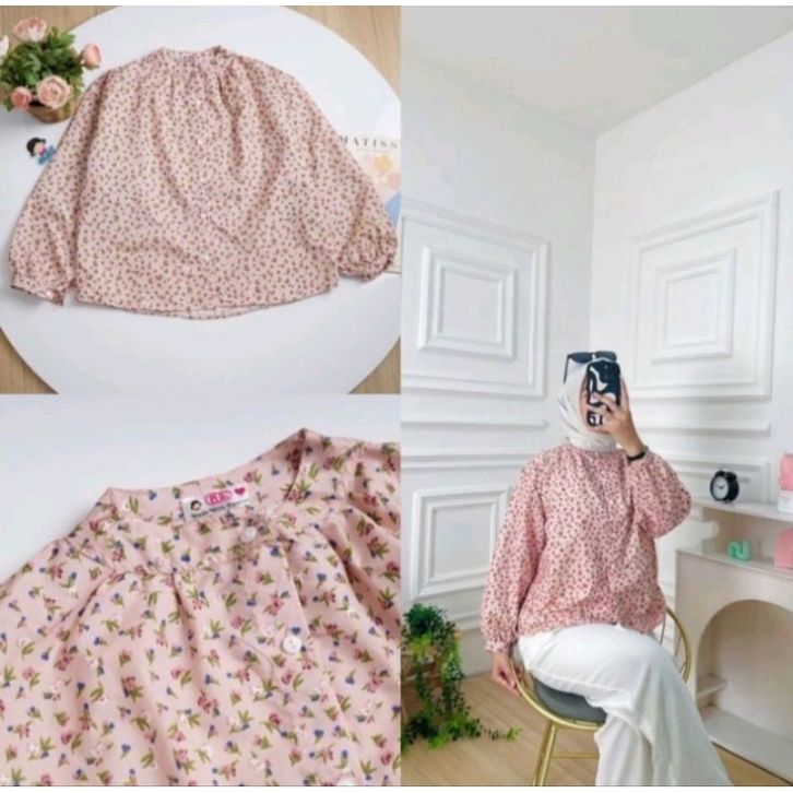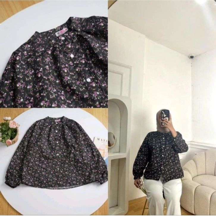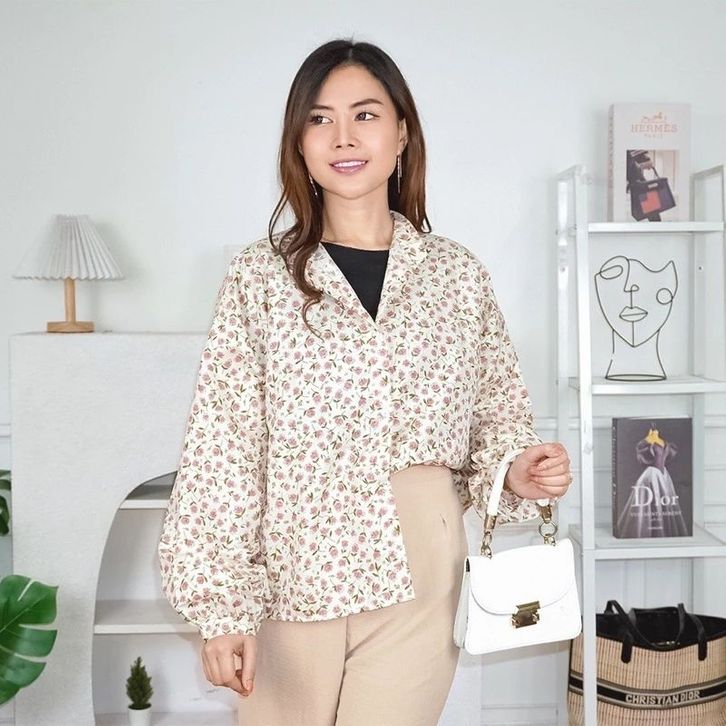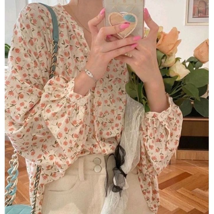Blouse Wanita Korea Fashion Style Flower Vintage Oversize Blouse Bahan Katun Poly Premium Pakaian Wanita Lengan Panjang