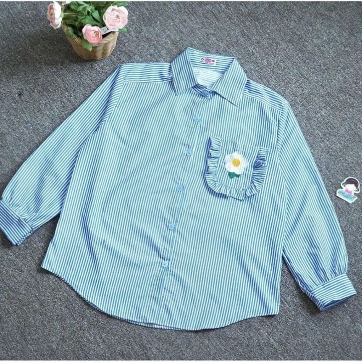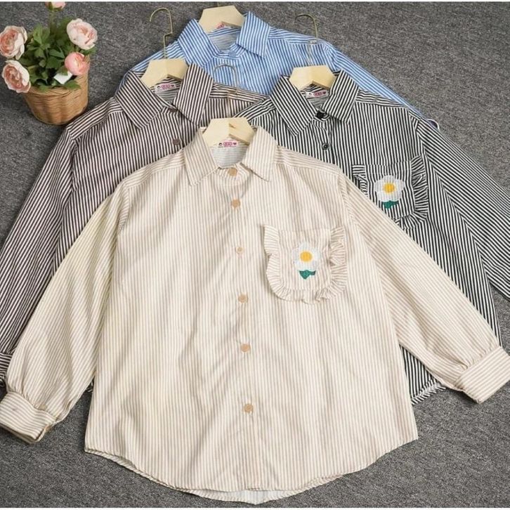 Blouse Wanita Staylish Kombinasi Bordir Bunga Kemeja Wanita Garis Korean Fashion Style Wanita Lengan Panjang Kekinian