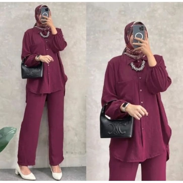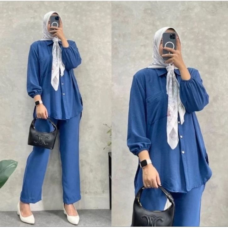 One Set Wanita Busui Cringkle Airflow One Set Wanita Kemeja Lengan Panjang Celana Panjang Casual Set Cewe Polos