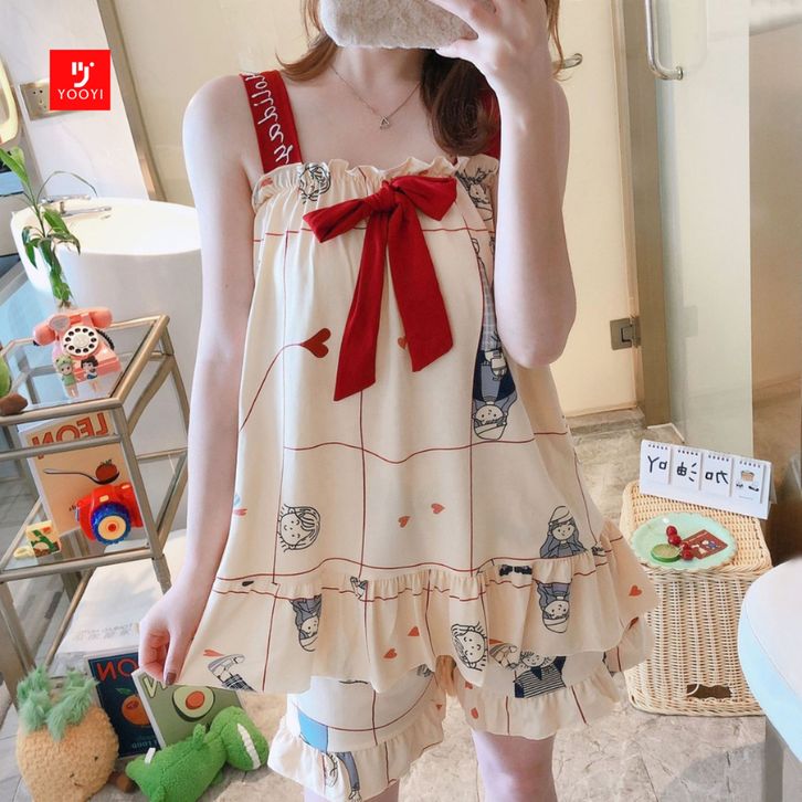 Yooyi Baju Tidur Wanita Piyama Baby Doll Setelan Perempuan Dewasa Tanpa Lengan Celana Pendek Remaja Desain Korea