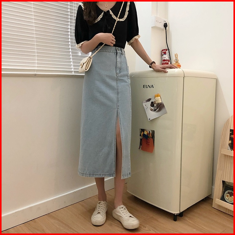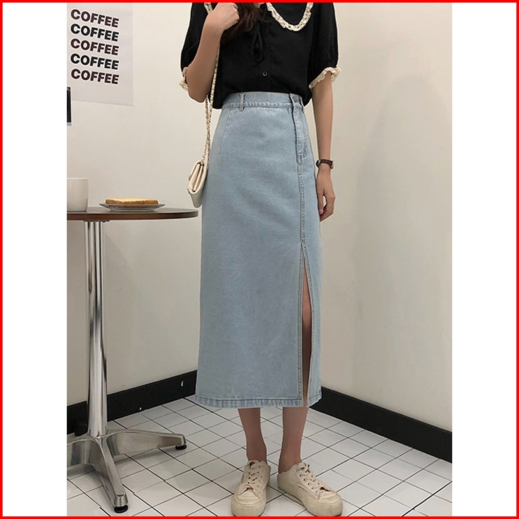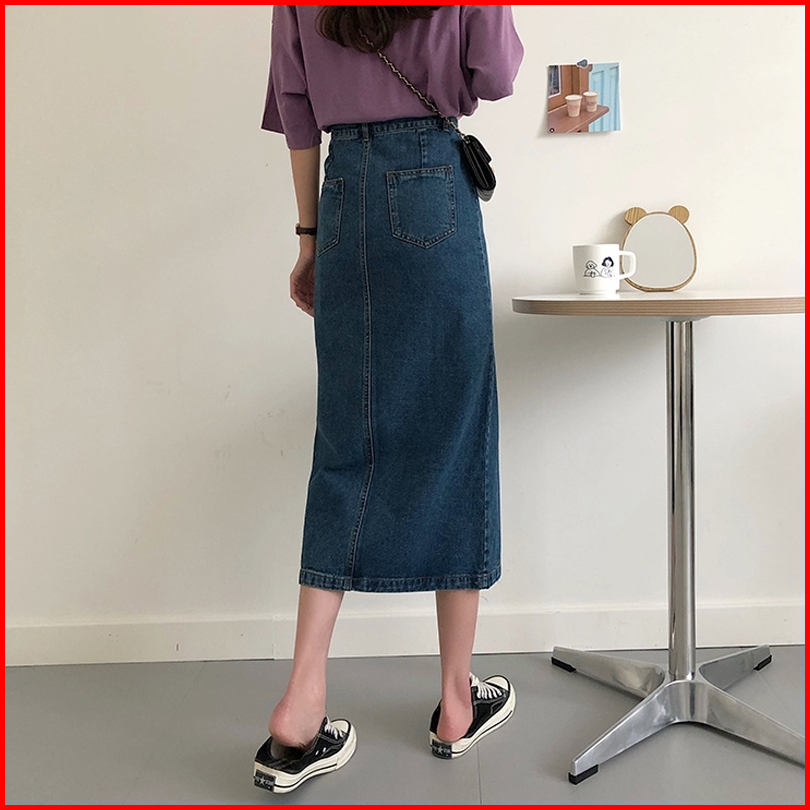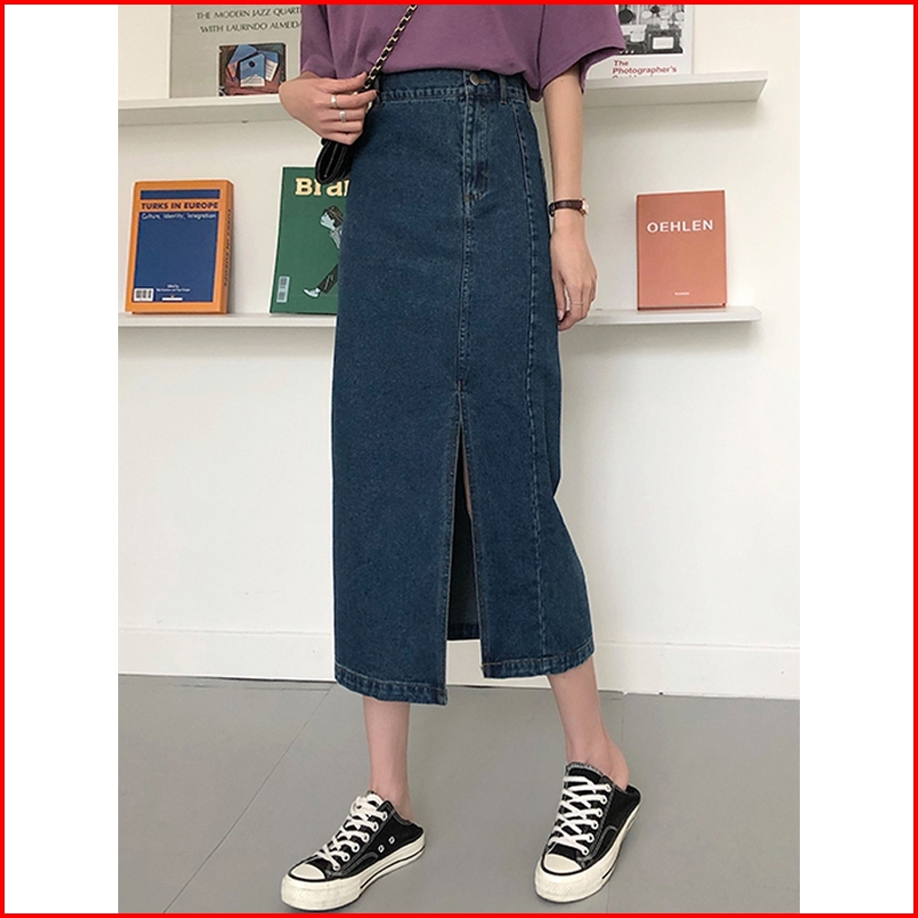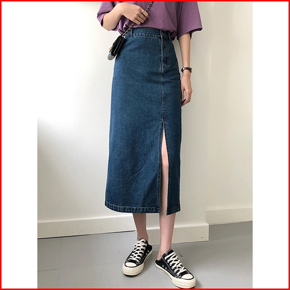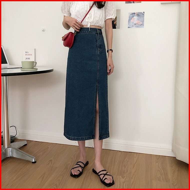 Xiaozhainv Rok Jeans Korean Style Denim Skirt Rok Belah Samping Navy Blue Rok Denim Panjang Rok Jeans Jumbo Rok Levis Pa
