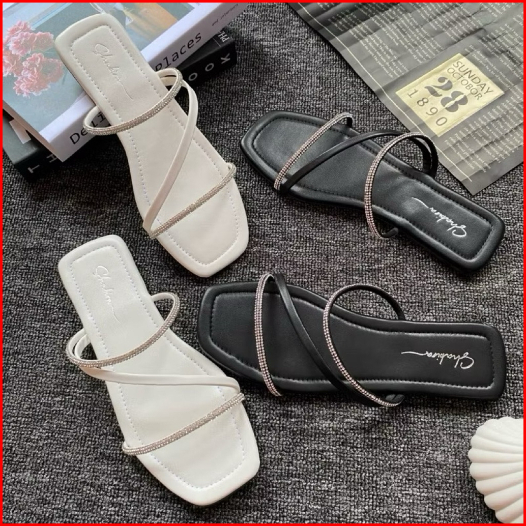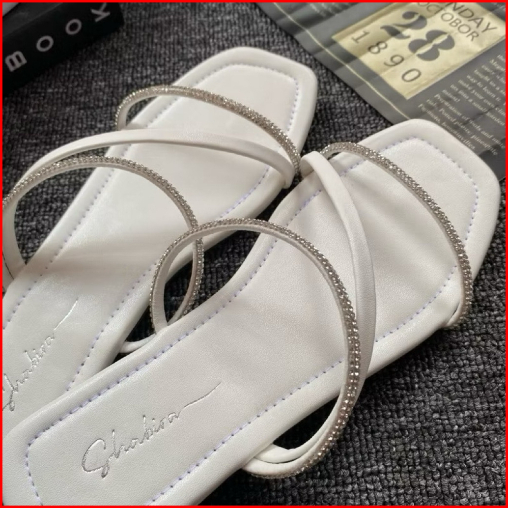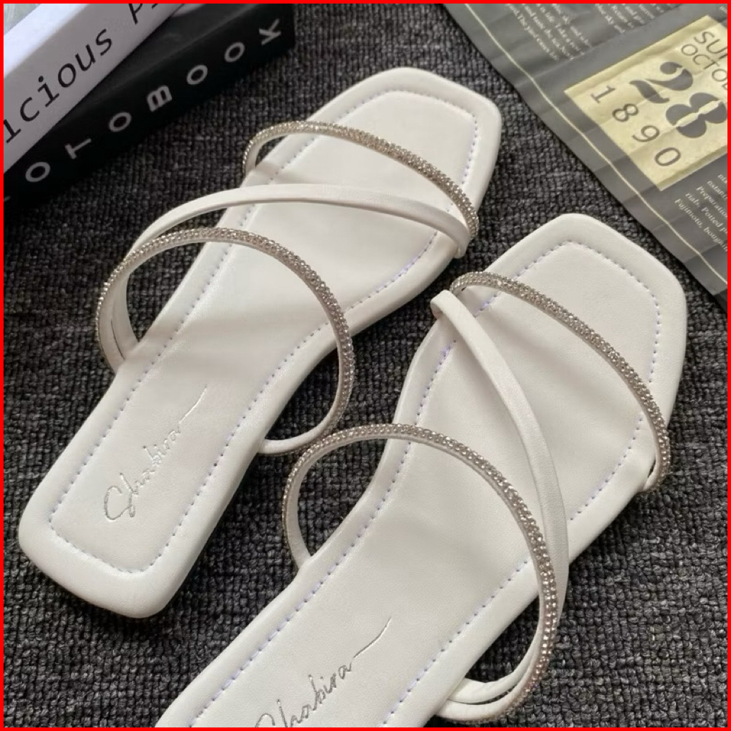Sandal Permata Mewah Flat Wanita Terlaris Slop Wanita Garis Dua Permata Cantik