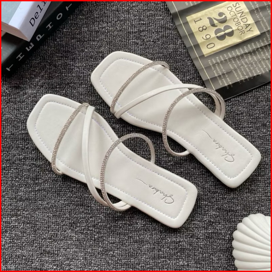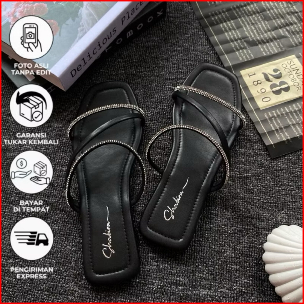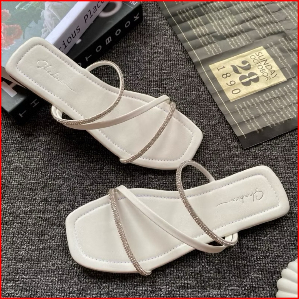 Sandal Permata Mewah Flat Wanita Terlaris Slop Wanita Garis Dua Permata Cantik
