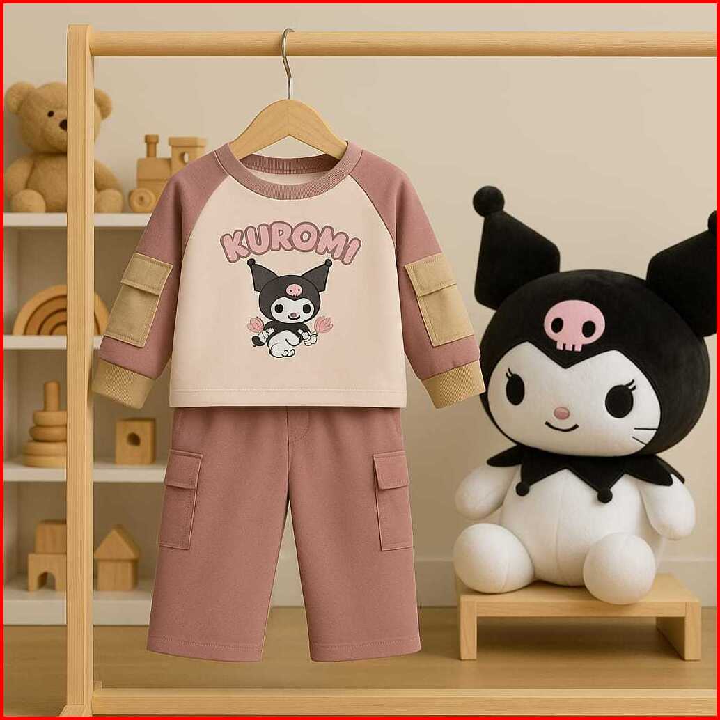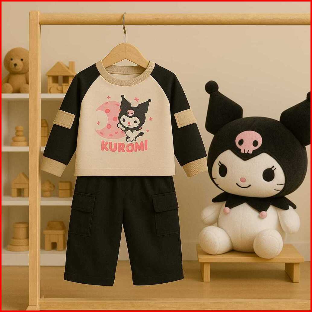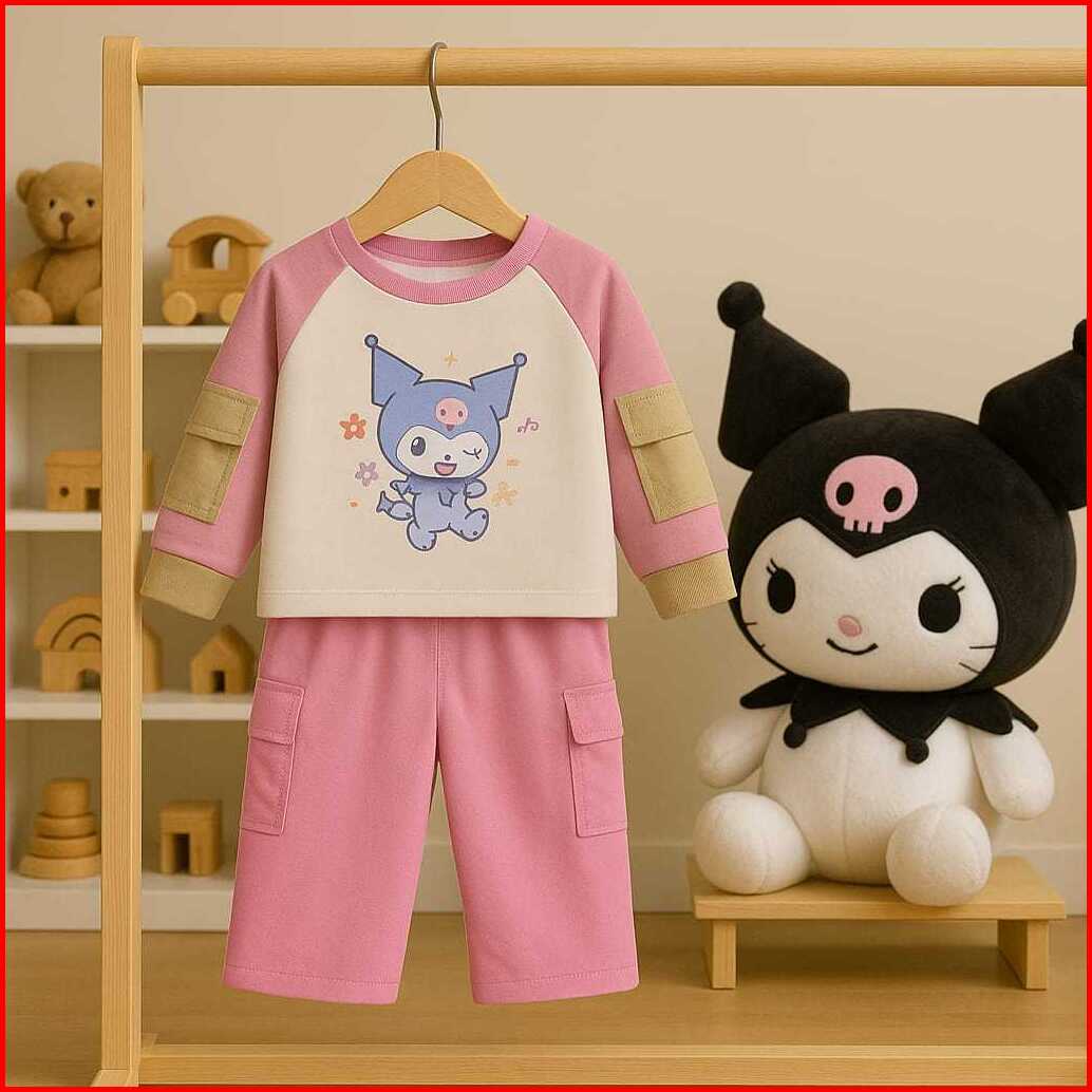 One Set Anak Kuromi Oversize Celana Cargo 2 Saku Aktif Dibagian Lengan