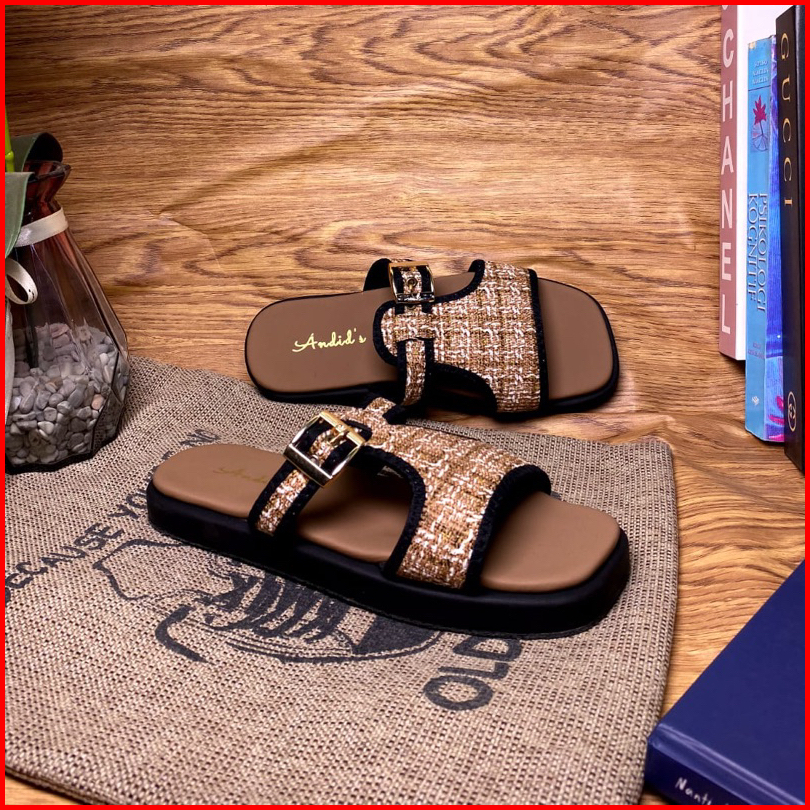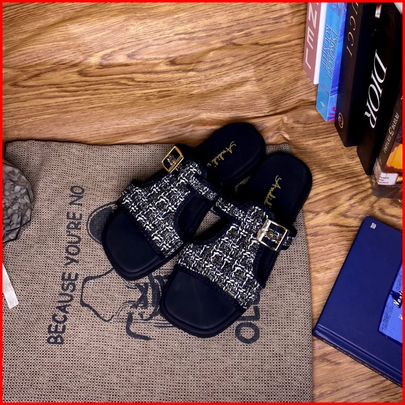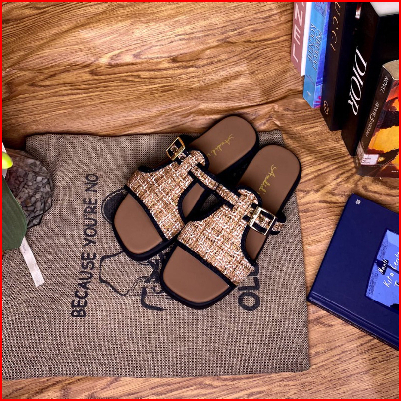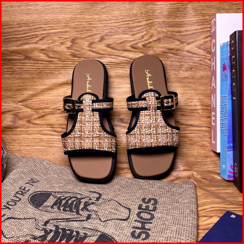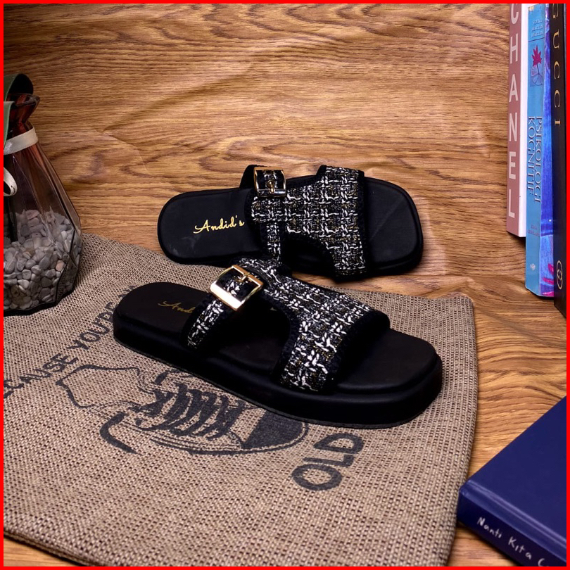 Sandal Platform Wanita Tali Gesper Motif Rajut Trendy Flat Shoes Korean Style Kekinian Terbaru 2024