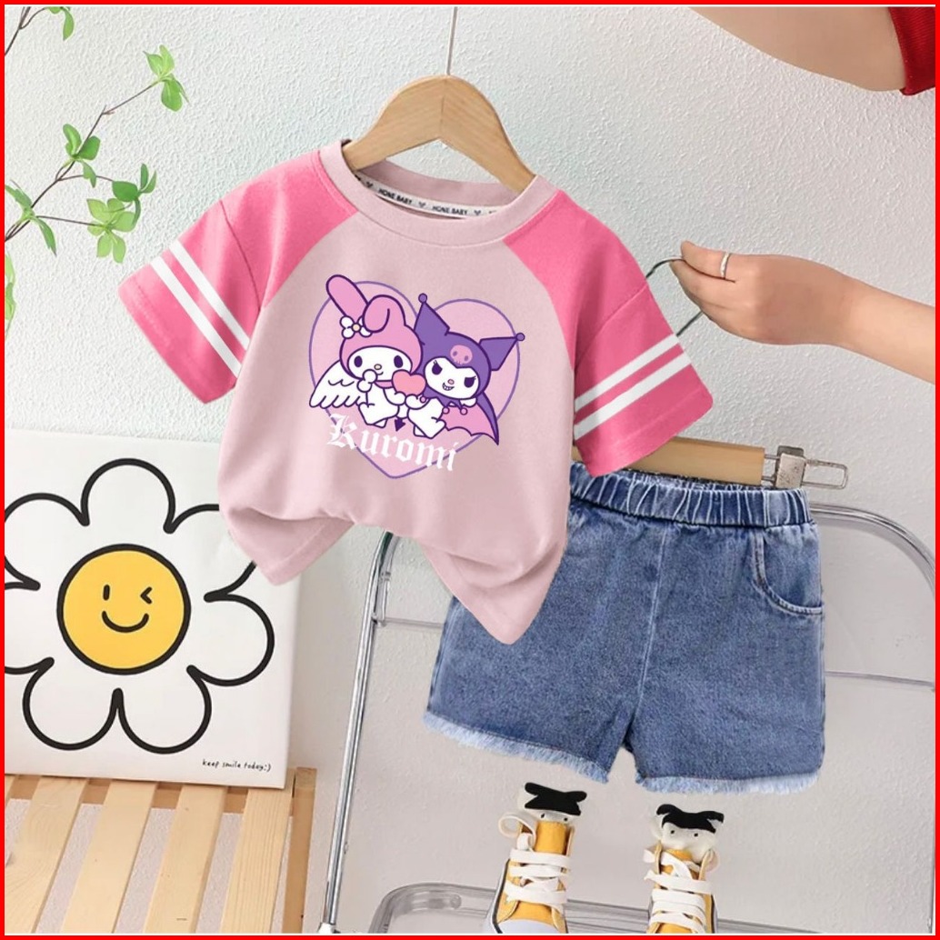 Setelan Anak 1-5 Tahun Kuromi Pakaian Anak Perempuan Setelan Baju Celana Denim Baju Anak Bangsa