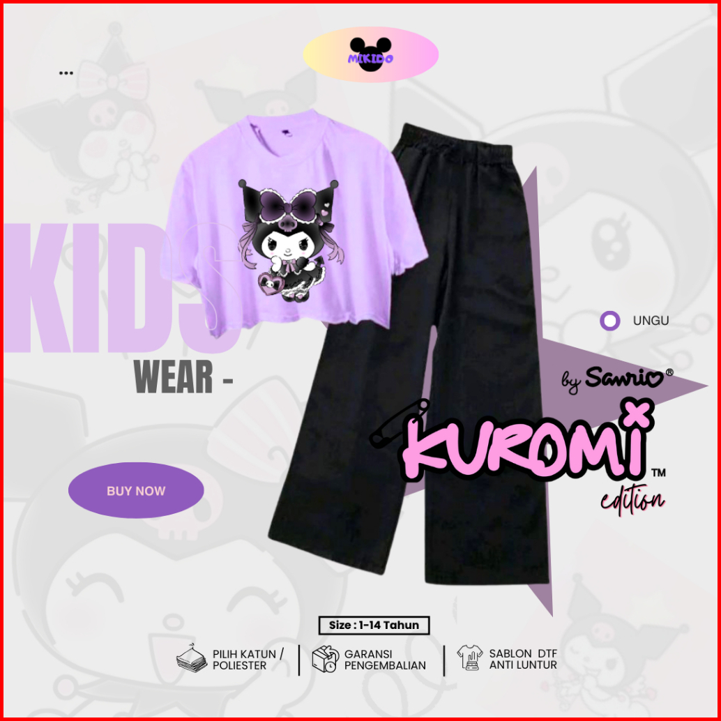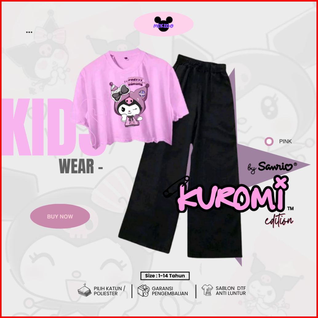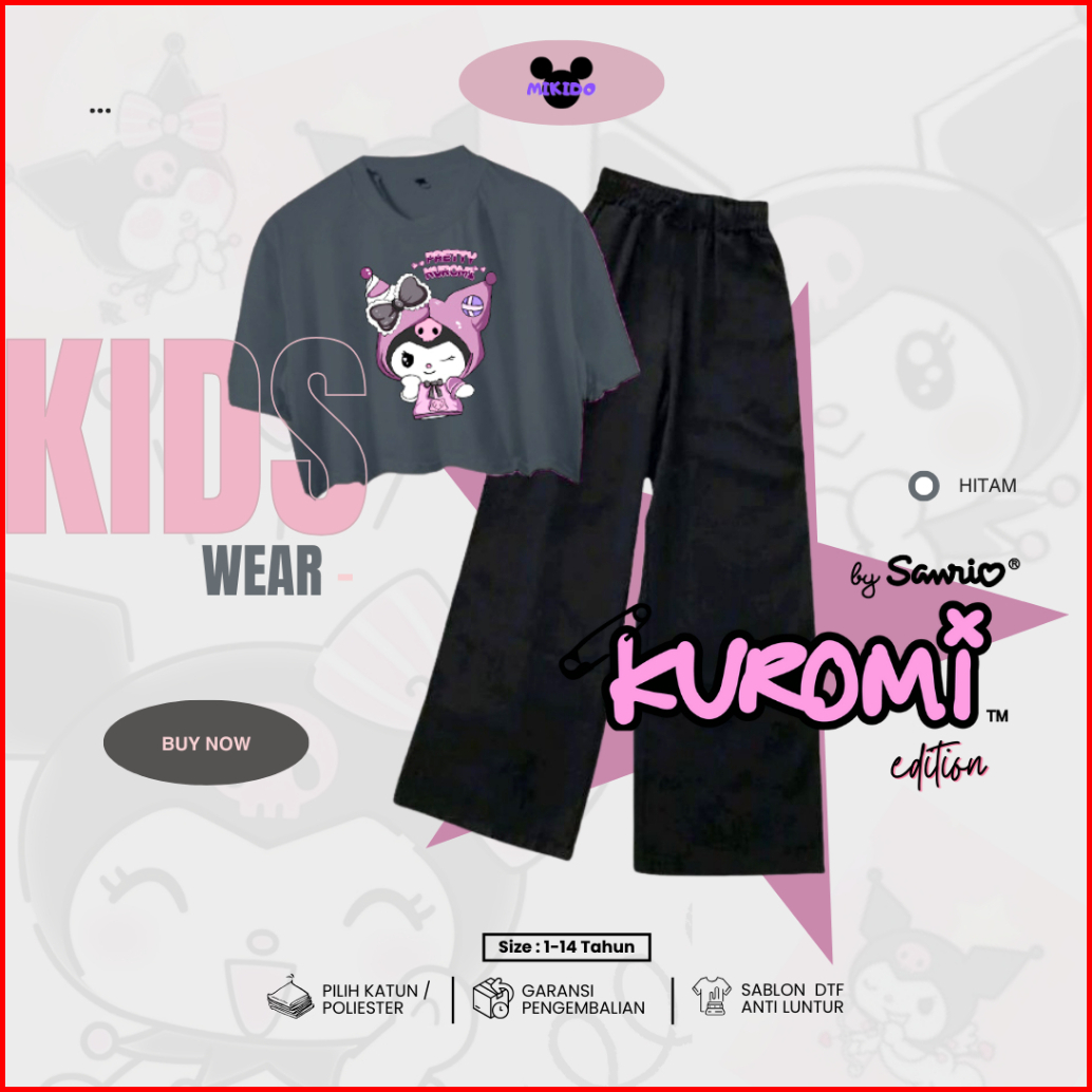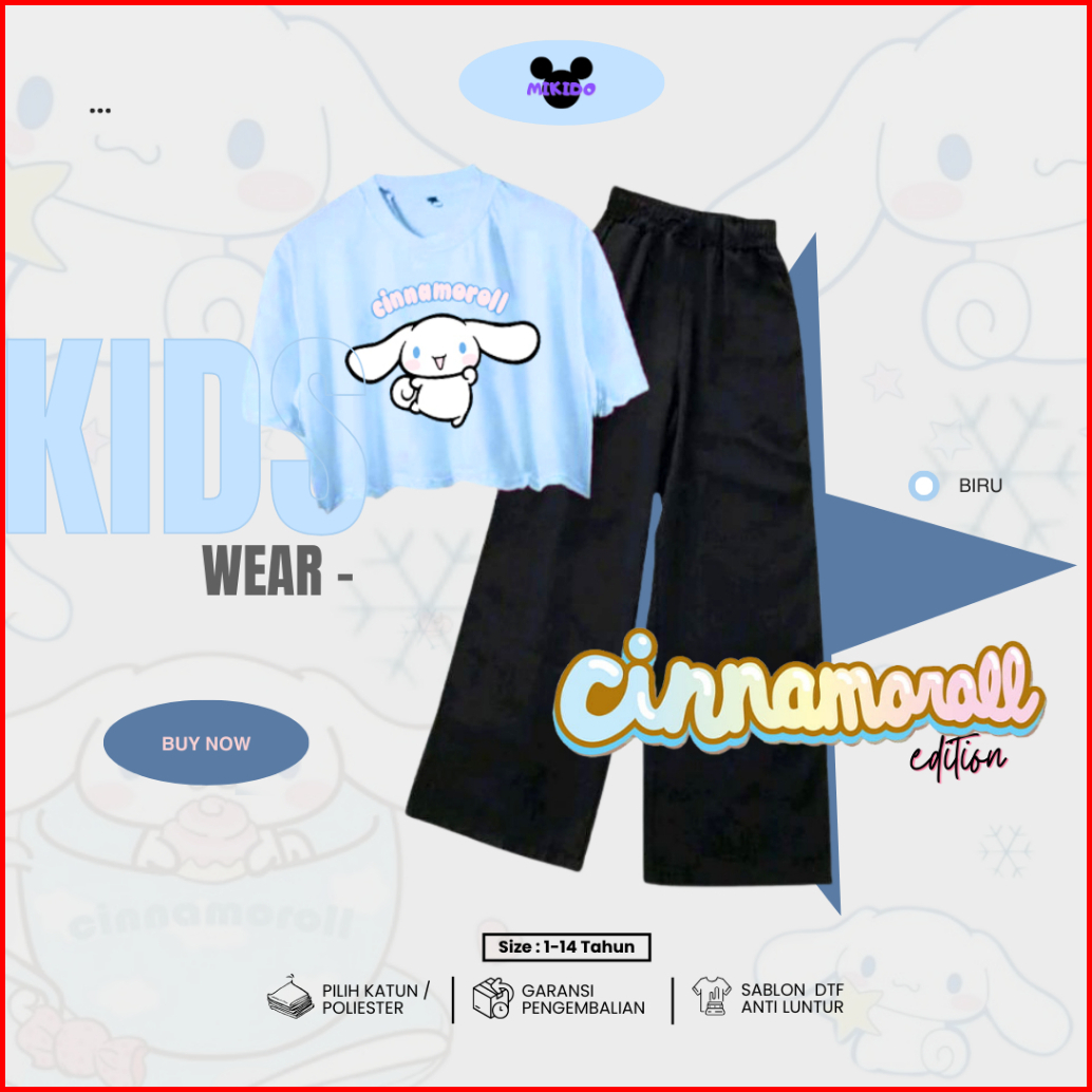 Setelan Crop Top Oversize Kulot Anak Perempuan Karakter Kuromi Cinnamoroll Lotso Stitch 6 - 14 Tahun