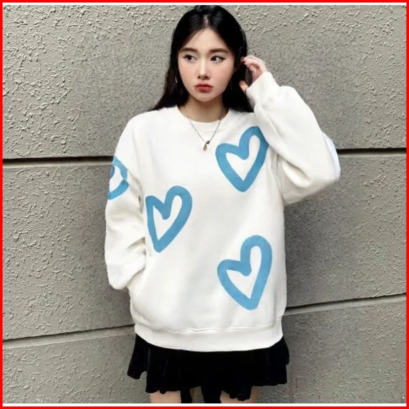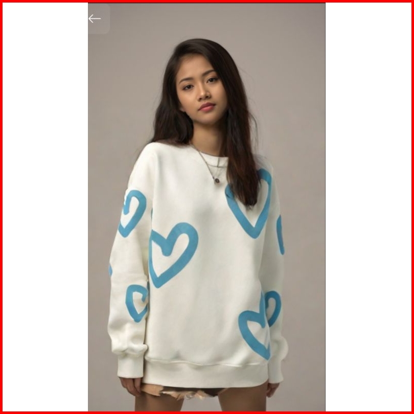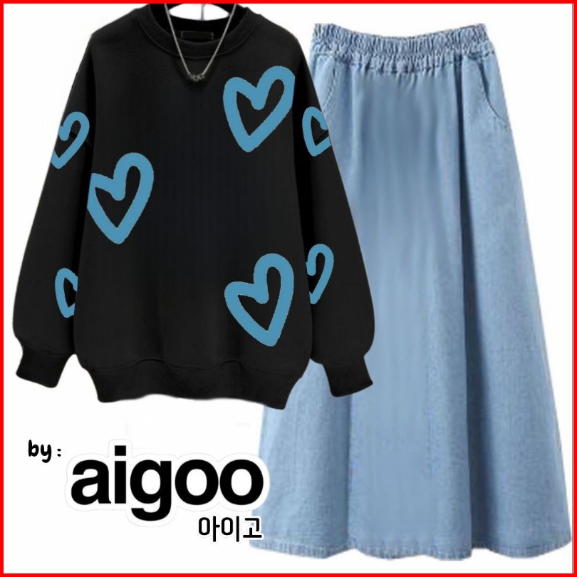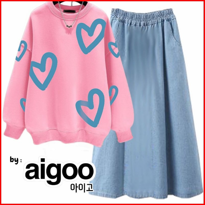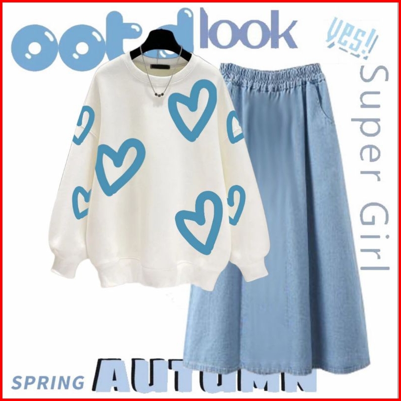 Sweater Anak Remaja Perempuan Big Love Heart Setelan Rok Soft Jeans